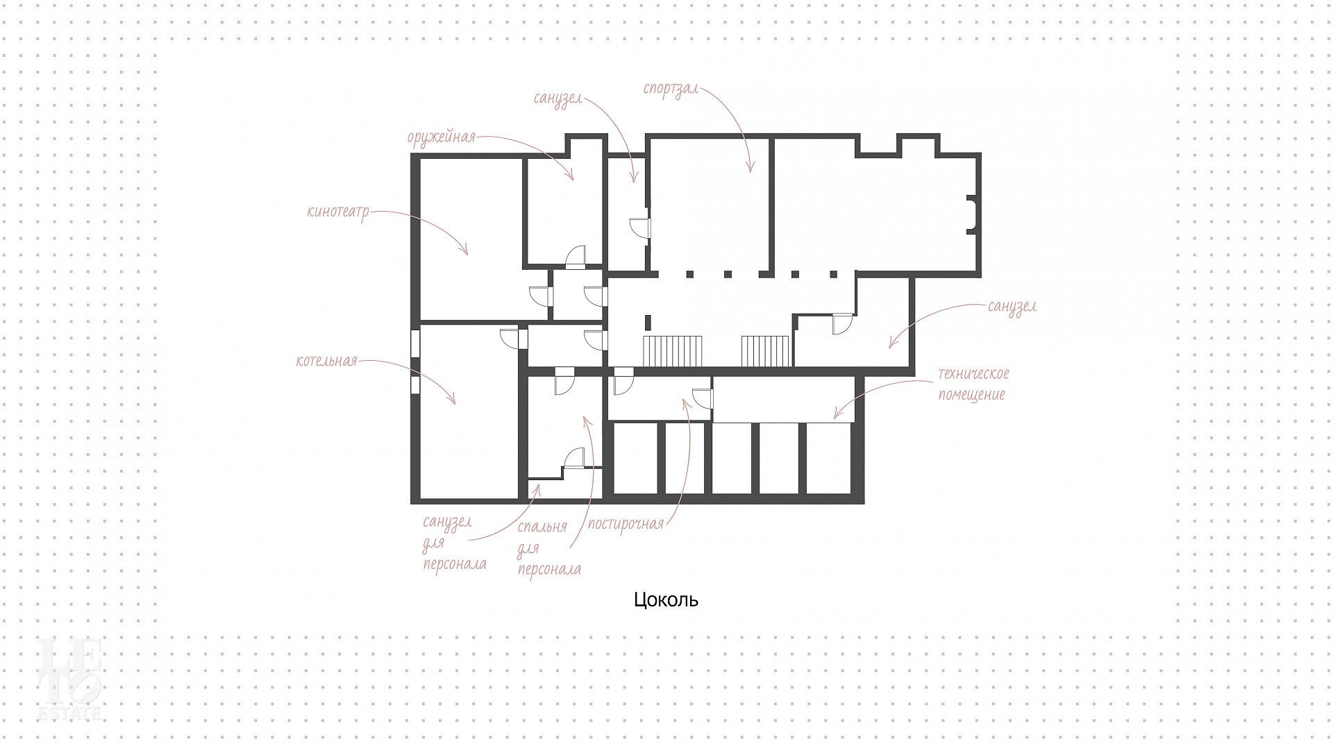 Цокольный этаж: холл, винная комната, сигарная, тренажерный зал с баром и с/у, оружейная, кинотеатр, постирочная, техническое помещение, котельная, комната для персонала с с/у.