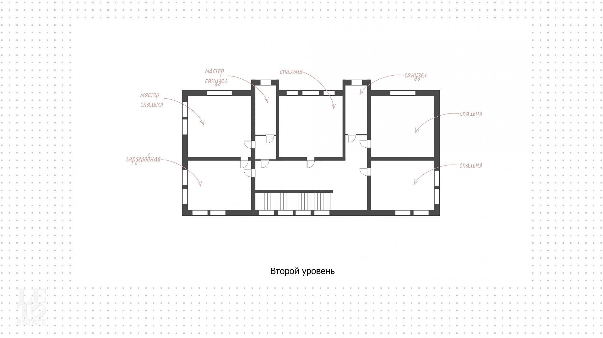 Второй этаж: холл, мастер-спальня с гардеробной и с/у, три спальни, с/у.