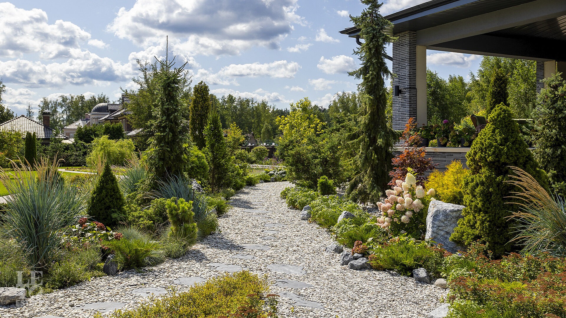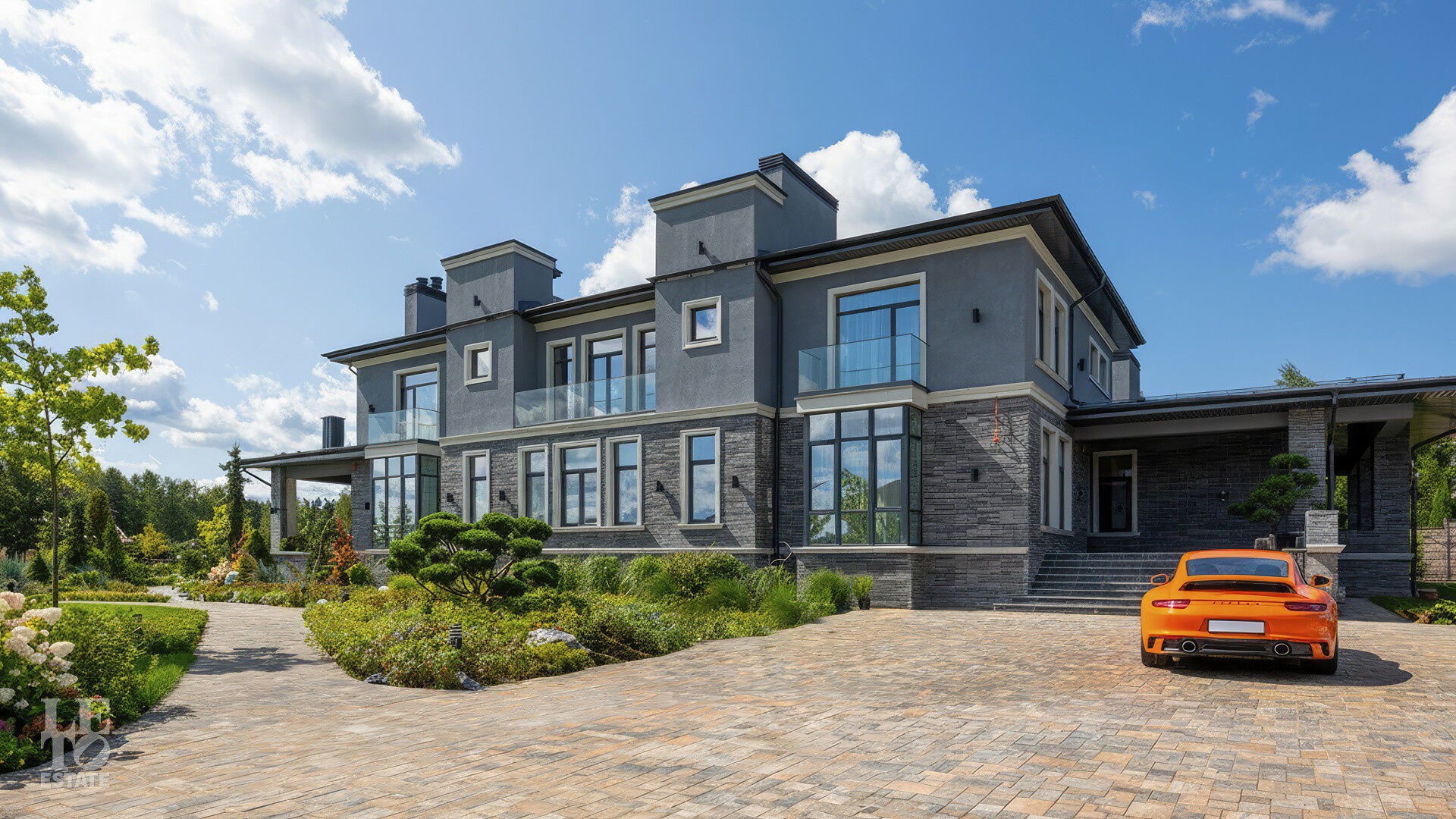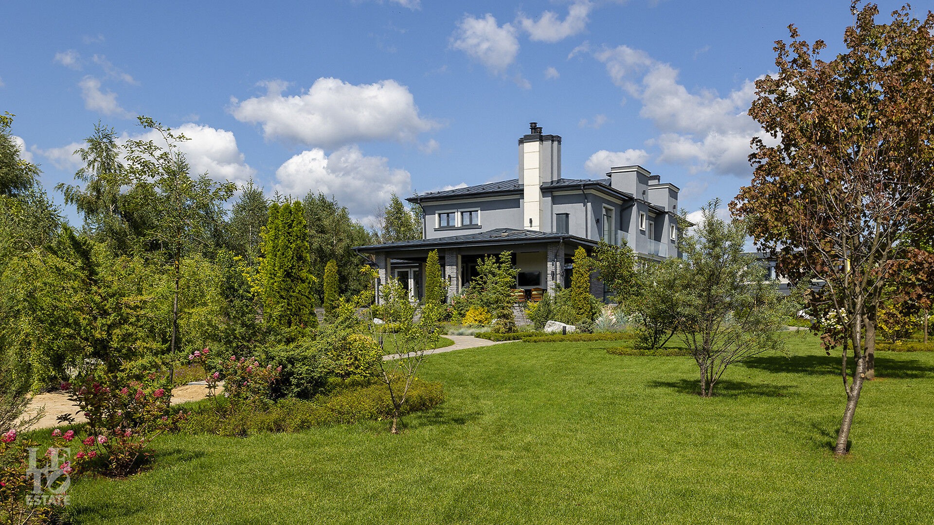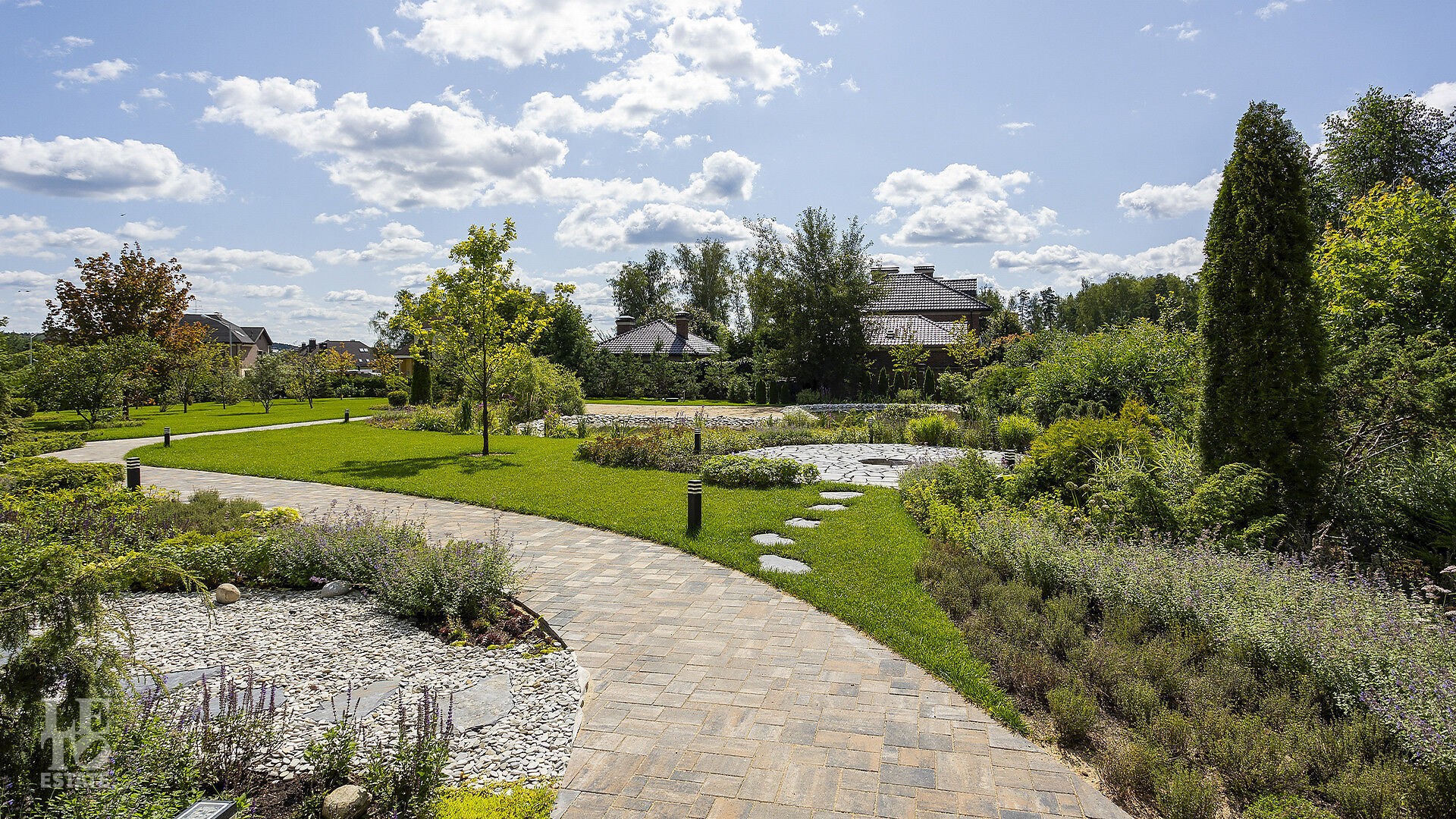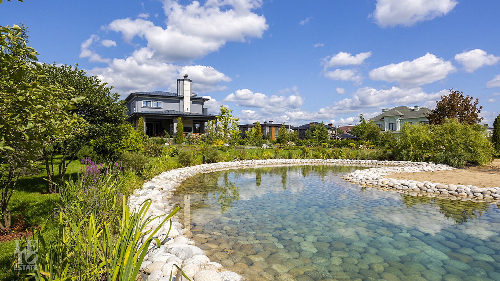 На участке выполнен ландшафтный дизайн, где можно вдыхать аромат свежескошенной травы, наслаждаться отдыхом у собственного пруда, прогуливаться по мощёным дорожкам в тени высоких деревьев и любоваться декоративными кустарниками, фруктовым садом и цветниками. Уличное освещение создаёт неповторимую атмосферу, завершая картину идеальной резиденции.
