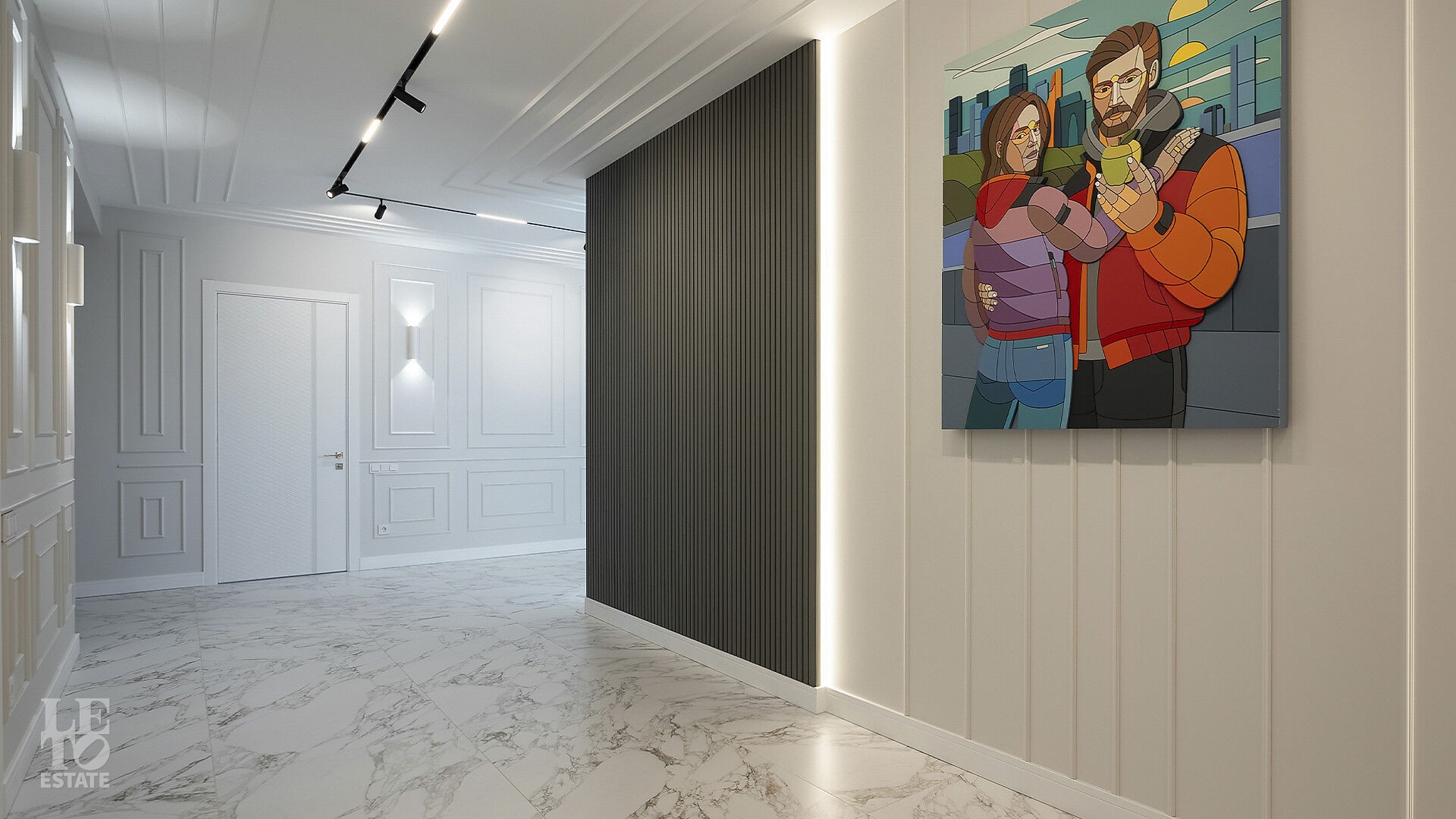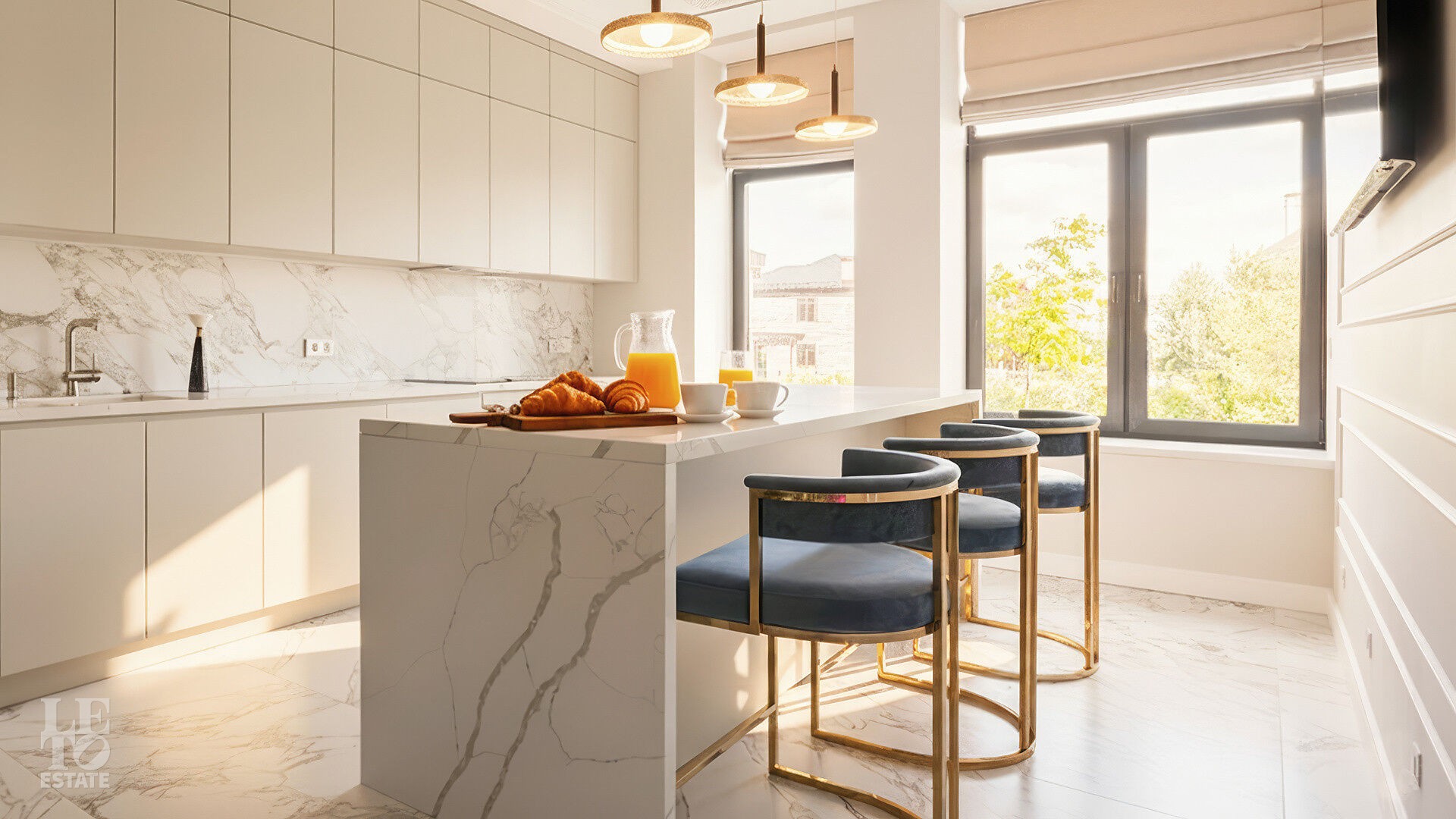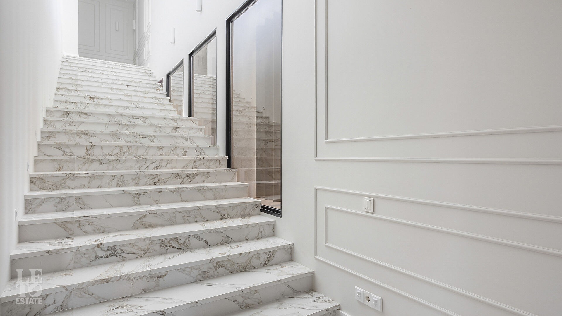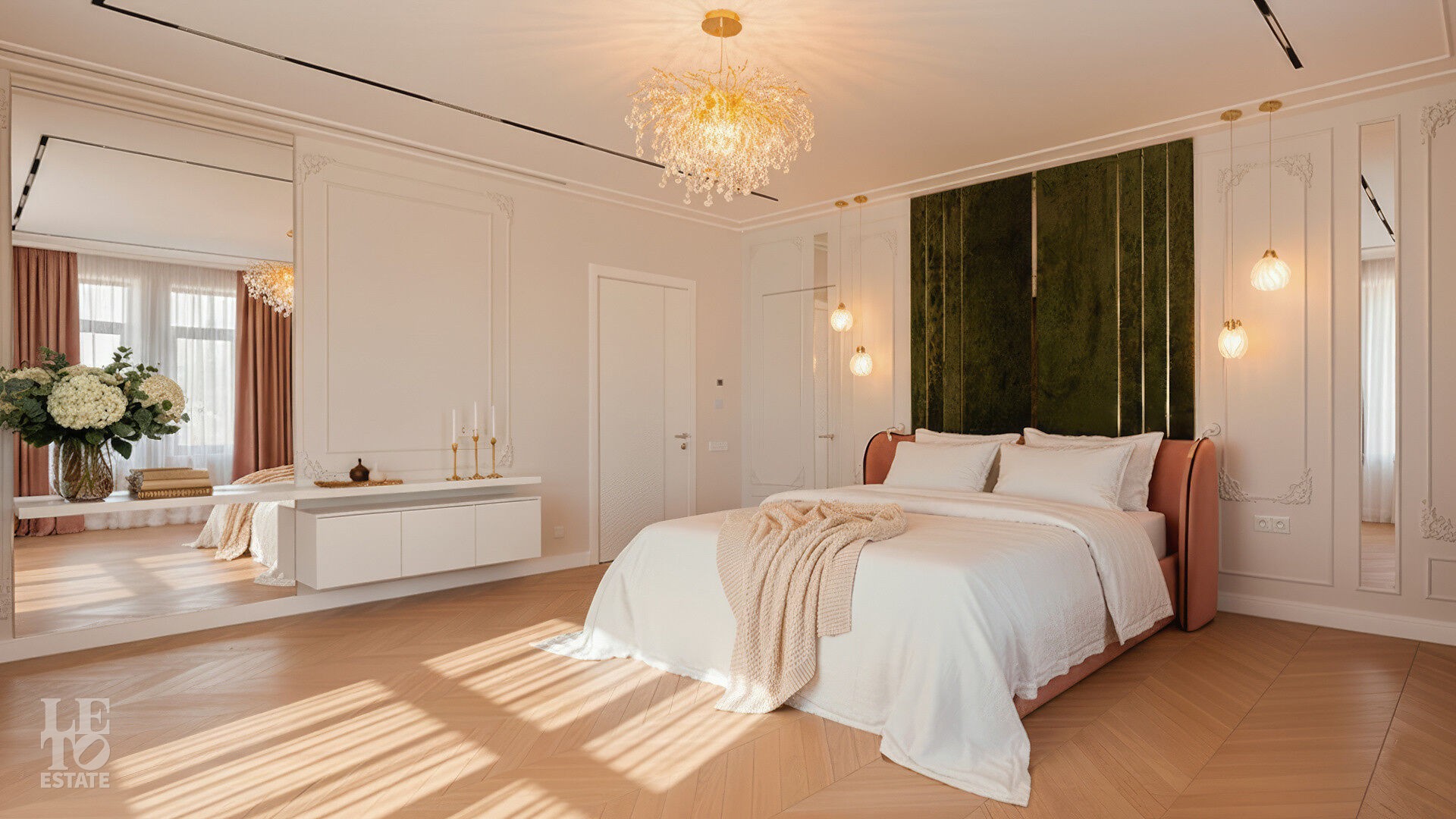 Интерьеры, выдержанные преимущественно в светлых тонах, отделаны с использованием керамогранита Atlas Concorde и инженерной доски Greenline 402, выложенной французской ёлочкой, а стены украшены изящными молдингами.