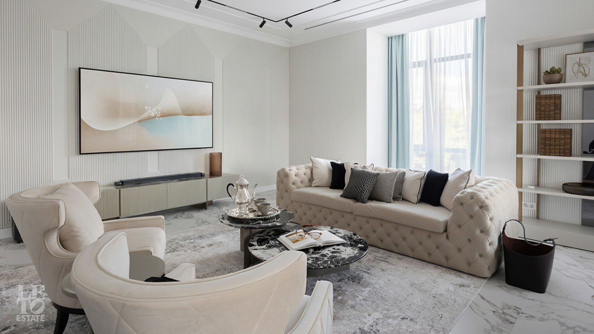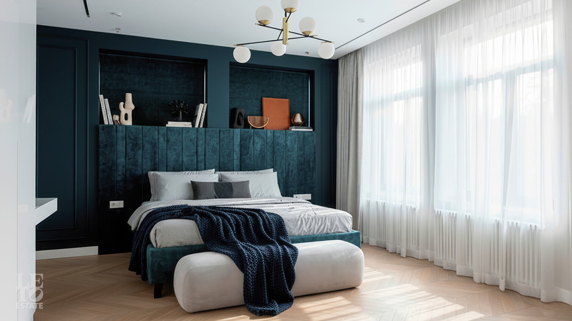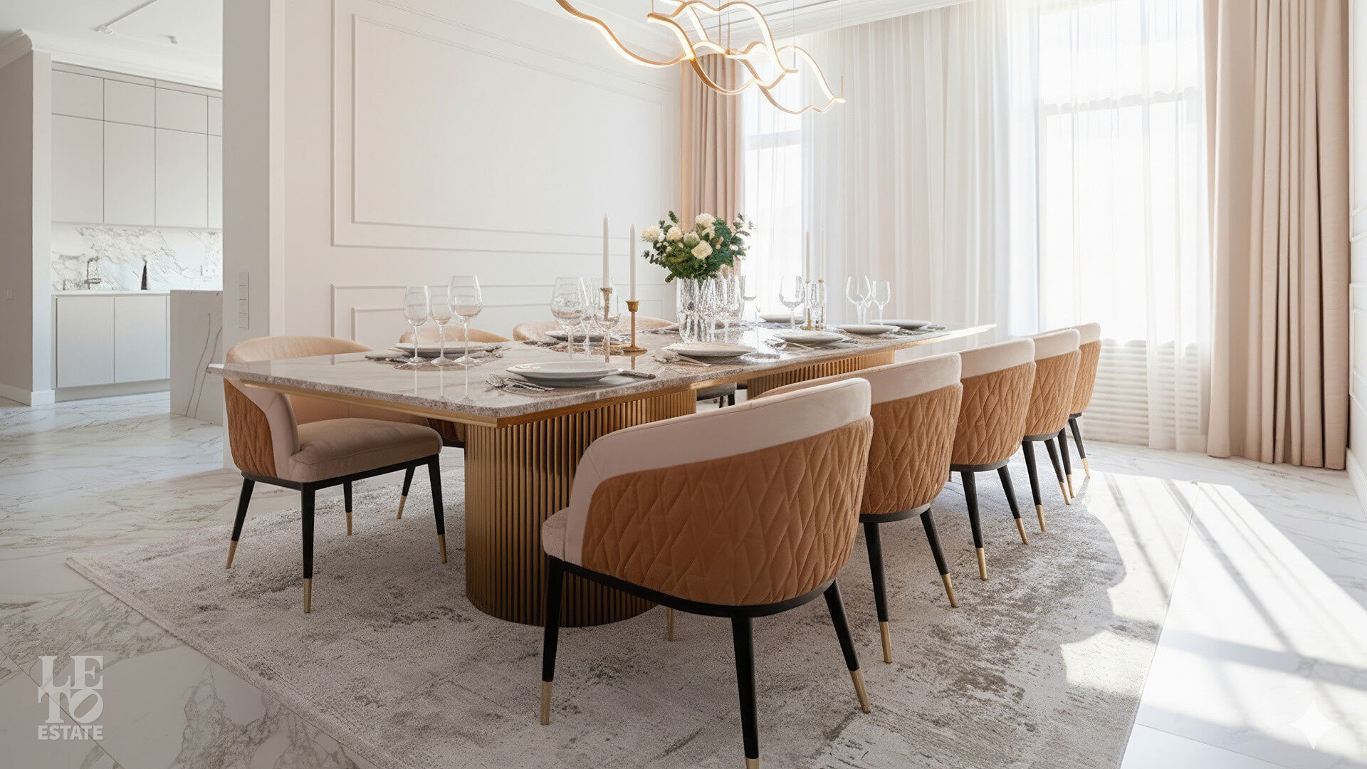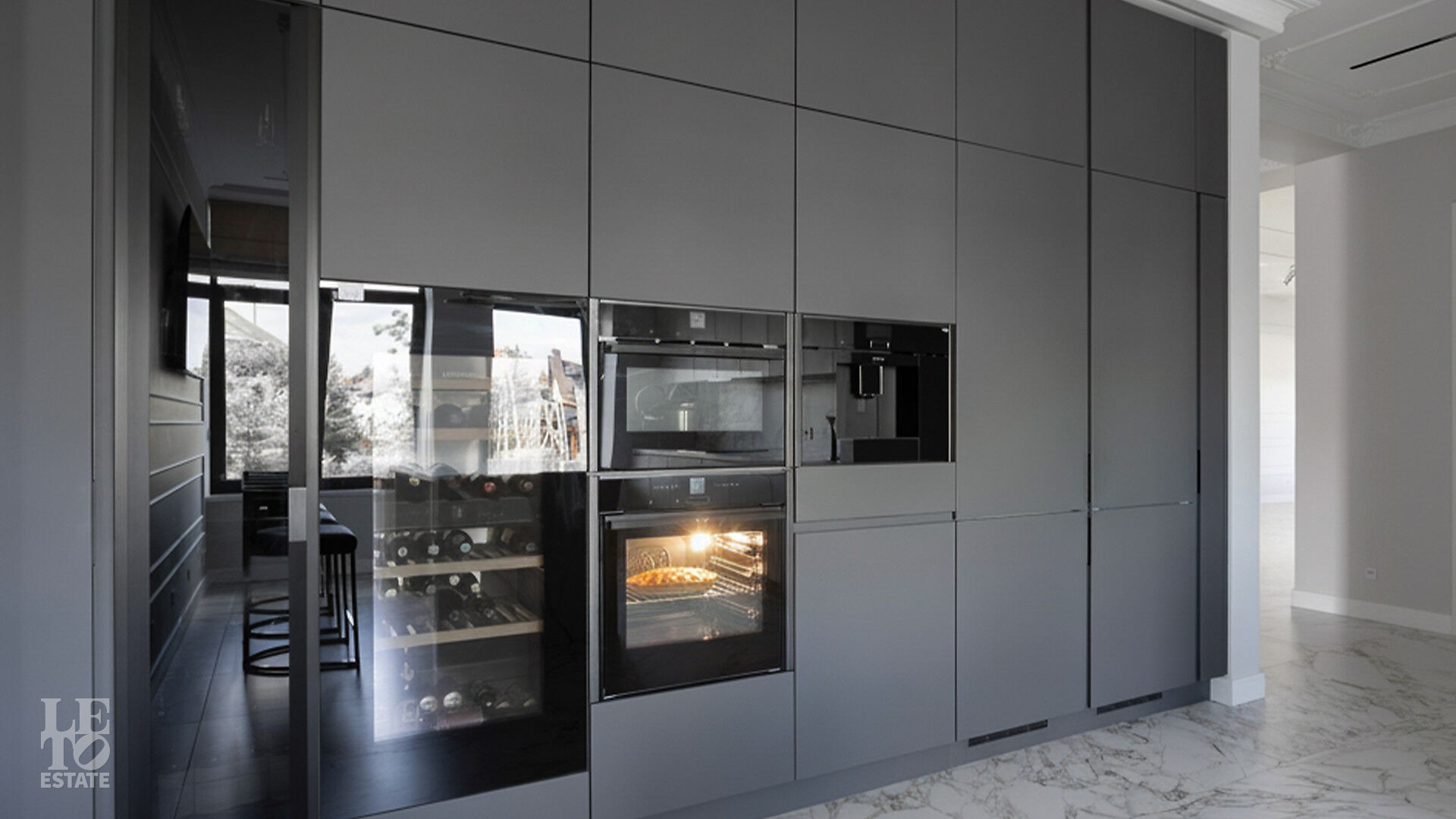 Интерьеры, выдержанные преимущественно в светлых тонах, отделаны с использованием керамогранита Atlas Concorde и инженерной доски Greenline 402, выложенной французской ёлочкой, а стены украшены изящными молдингами.