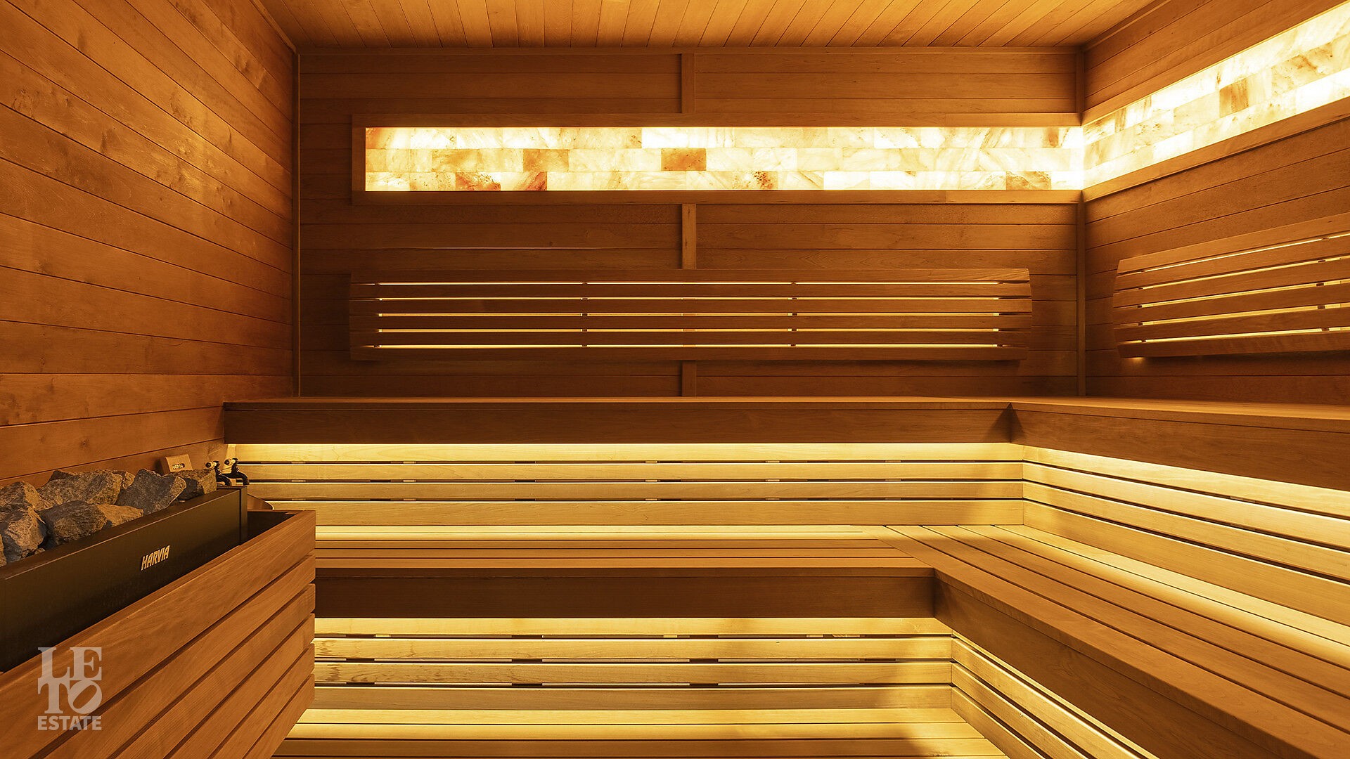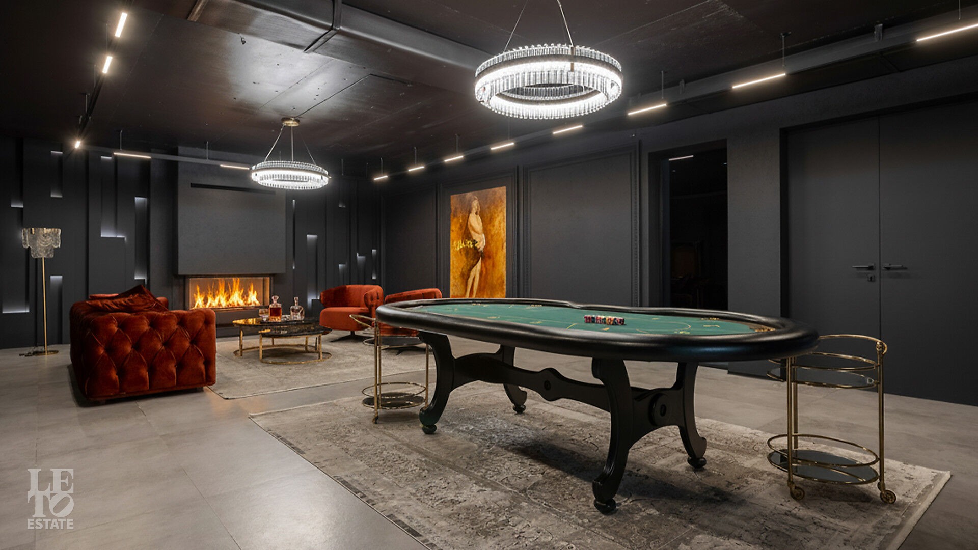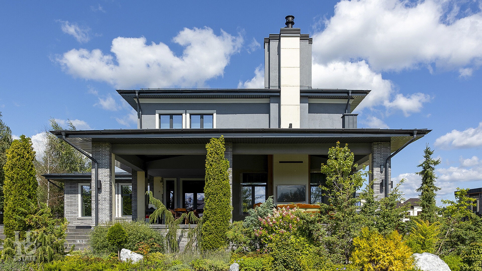 Дом укомплектован тщательно подобранными предметами декора, мебелью от российских производителей, техникой Neff и Liebherr, а также сантехникой Hansgrohe. Планировка продумана до мелочей. Для вдохновения и отдыха предназначены: уютная гостиная с камином, открытая веранда и пять спален, для работы —уединённый кабинет, а для расслабления — роскошная спа-зона с бассейноми сауной. Цокольный уровень превращён в центр развлечений с винной и сигарной комнатами, тренажерным залом с баром, оружейной и домашним кинотеатром, оснащённым оборудованием Integra, проектором JVC и акустикой Klipsch.