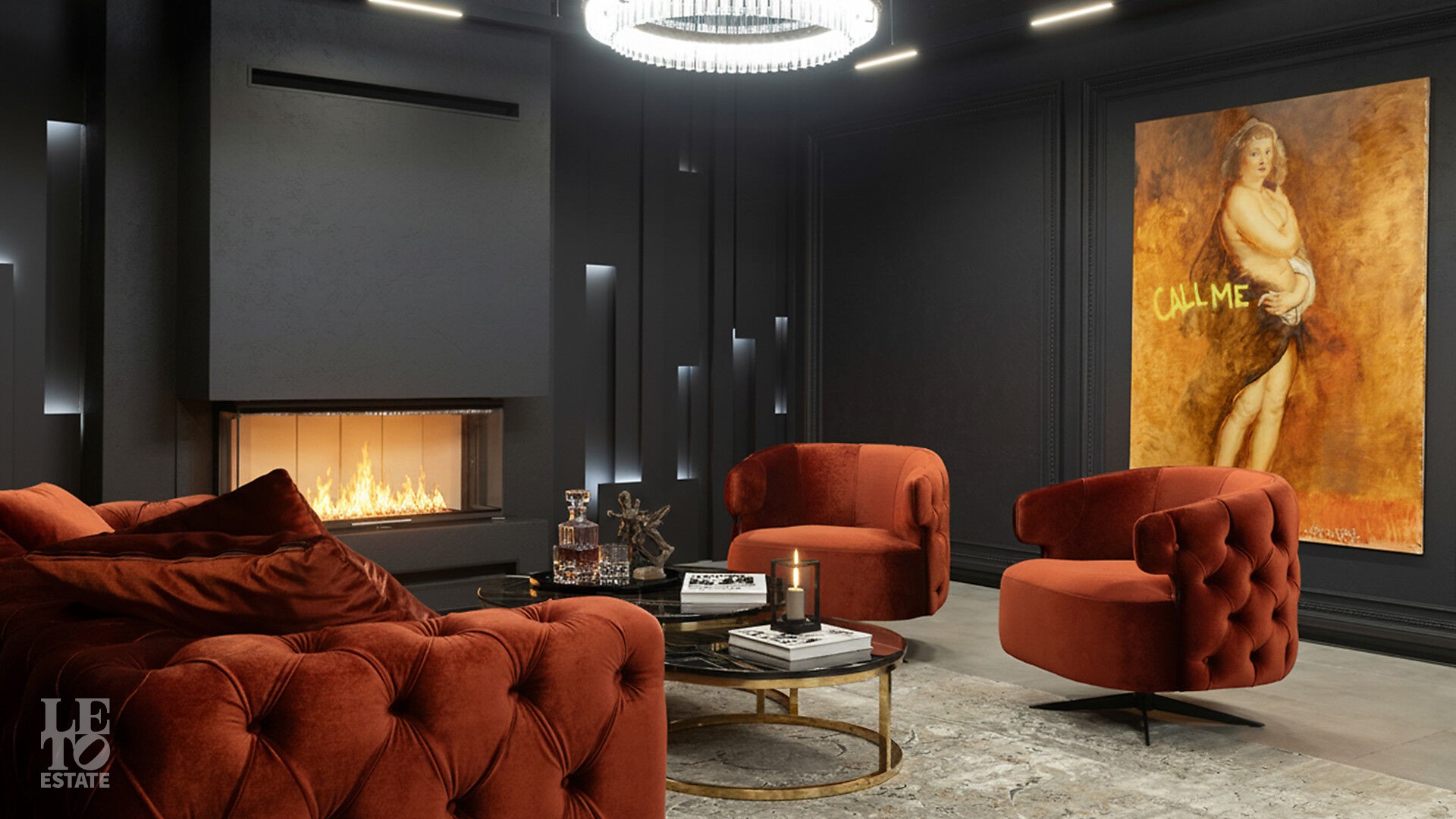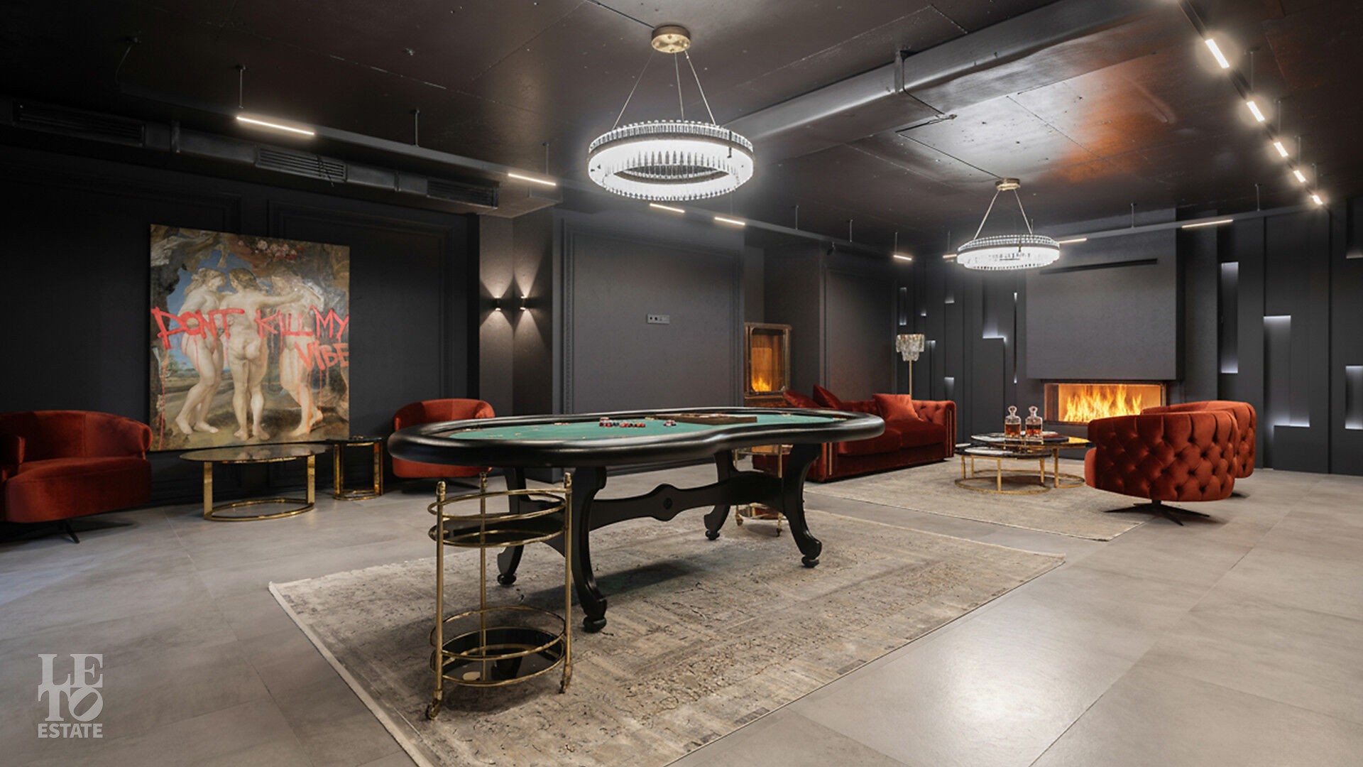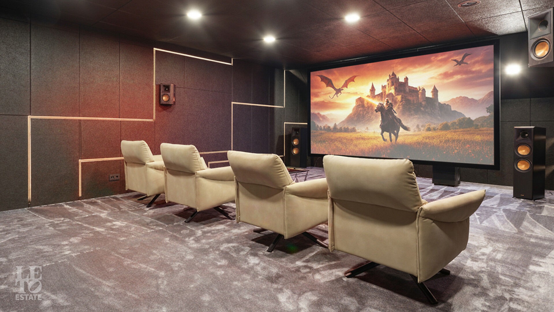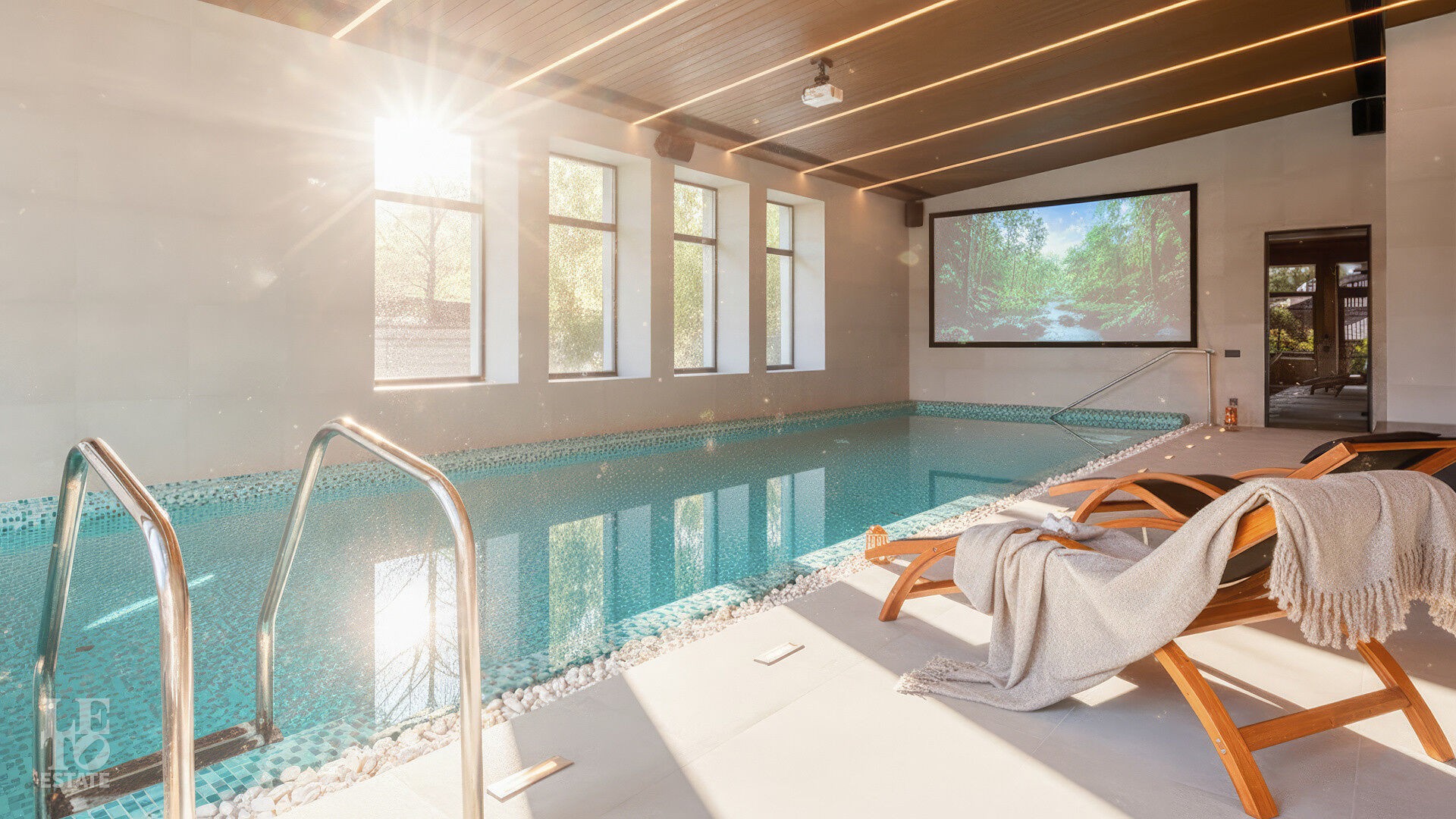 Дом укомплектован тщательно подобранными предметами декора, мебелью от российских производителей, техникой Neff и Liebherr, а также сантехникой Hansgrohe. Планировка продумана до мелочей. Для вдохновения и отдыха предназначены: уютная гостиная с камином, открытая веранда и пять спален, для работы —уединённый кабинет, а для расслабления — роскошная спа-зона с бассейноми сауной. Цокольный уровень превращён в центр развлечений с винной и сигарной комнатами, тренажерным залом с баром, оружейной и домашним кинотеатром, оснащённым оборудованием Integra, проектором JVC и акустикой Klipsch.