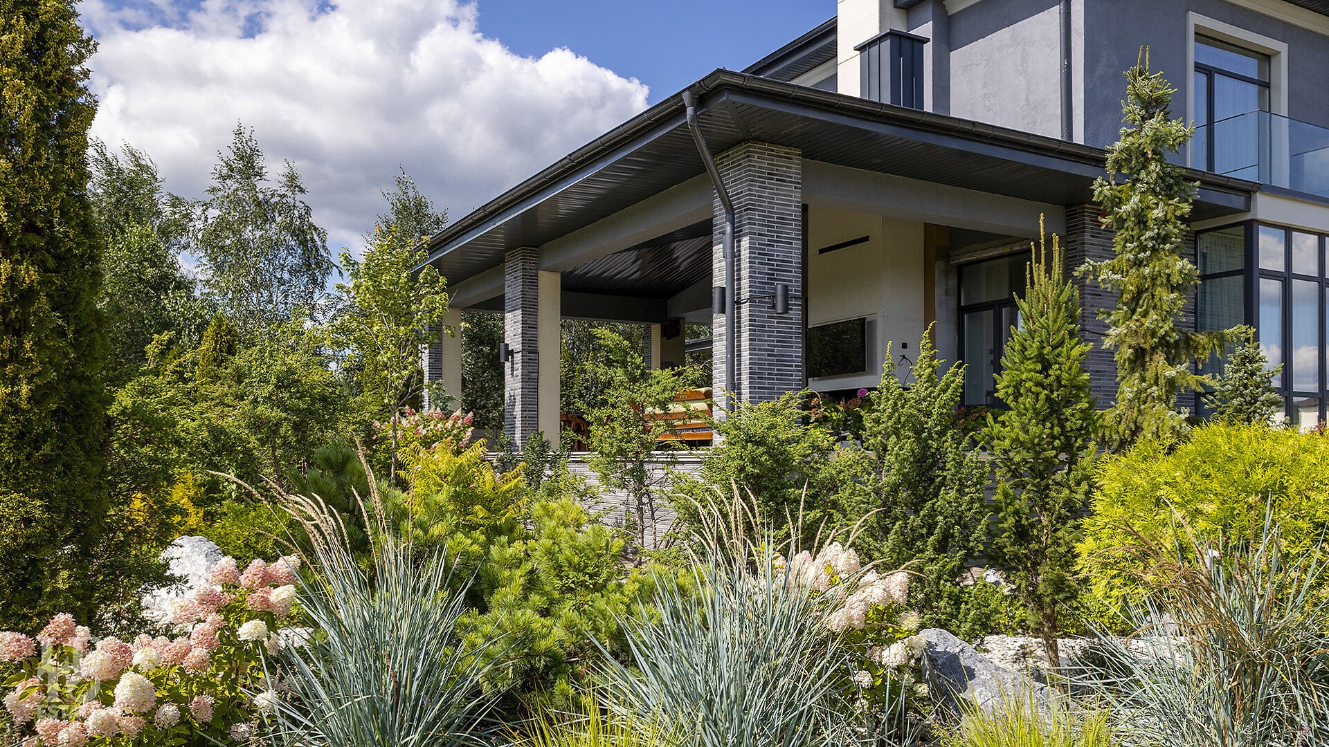 Современная архитектура здания сразу приковывает взгляд: благородная серая штукатурка, клинкерный кирпич и элегантная подсветка, которая мягко подчёркивает строгие линии фасада с наступлением вечера. Сквозь панорамные окна Rehau Delight открываются живописные виды на природное окружение.