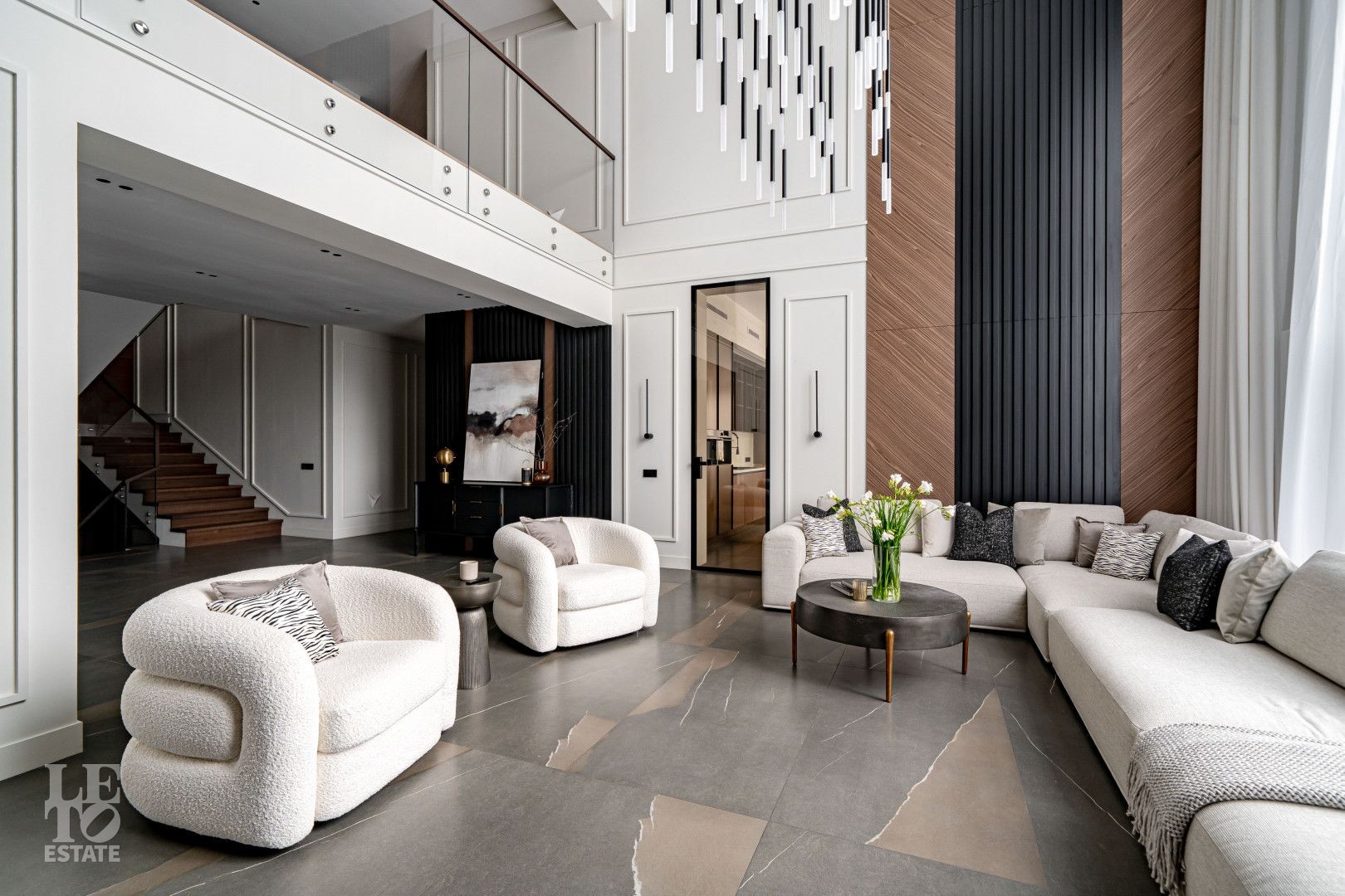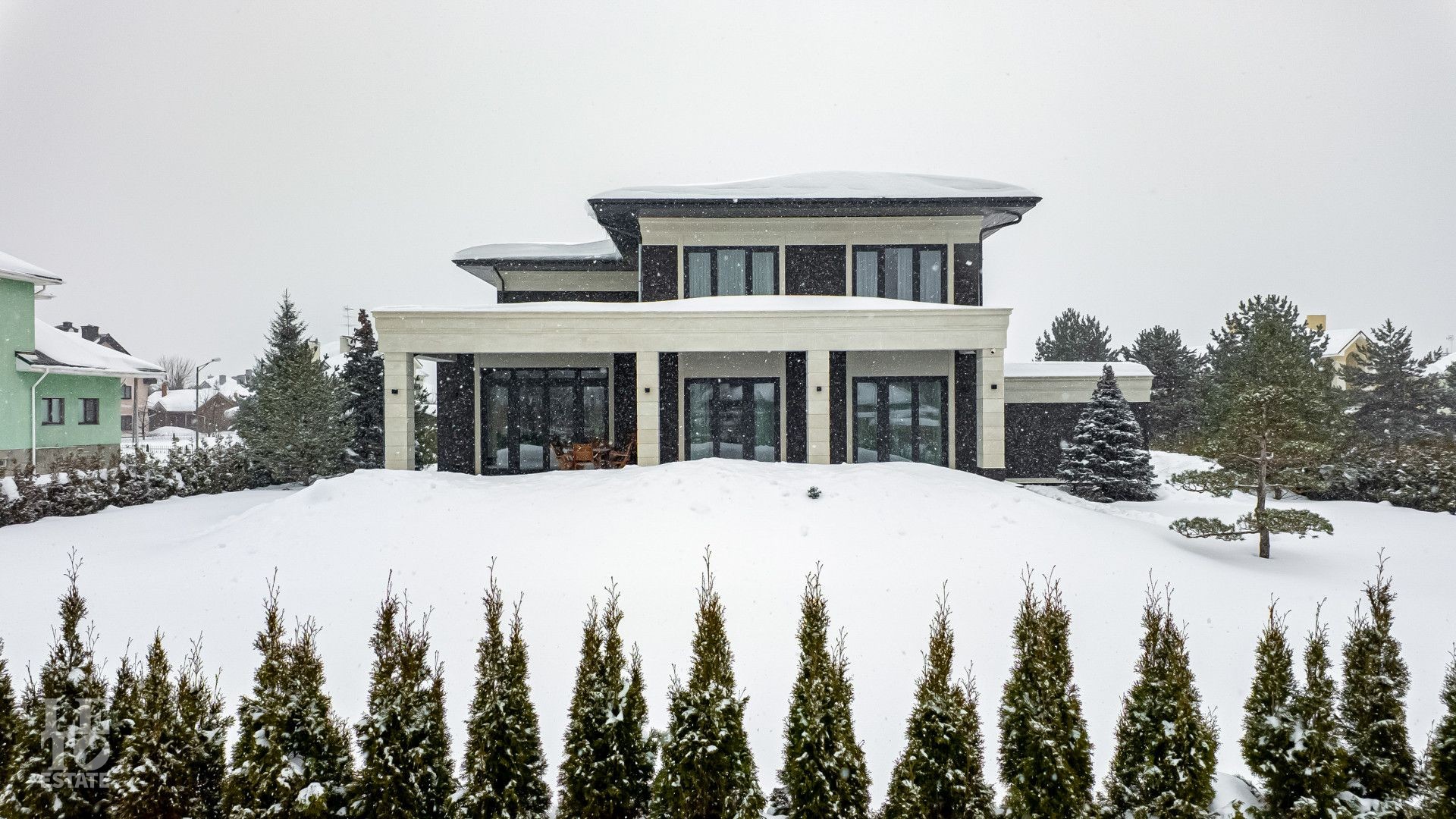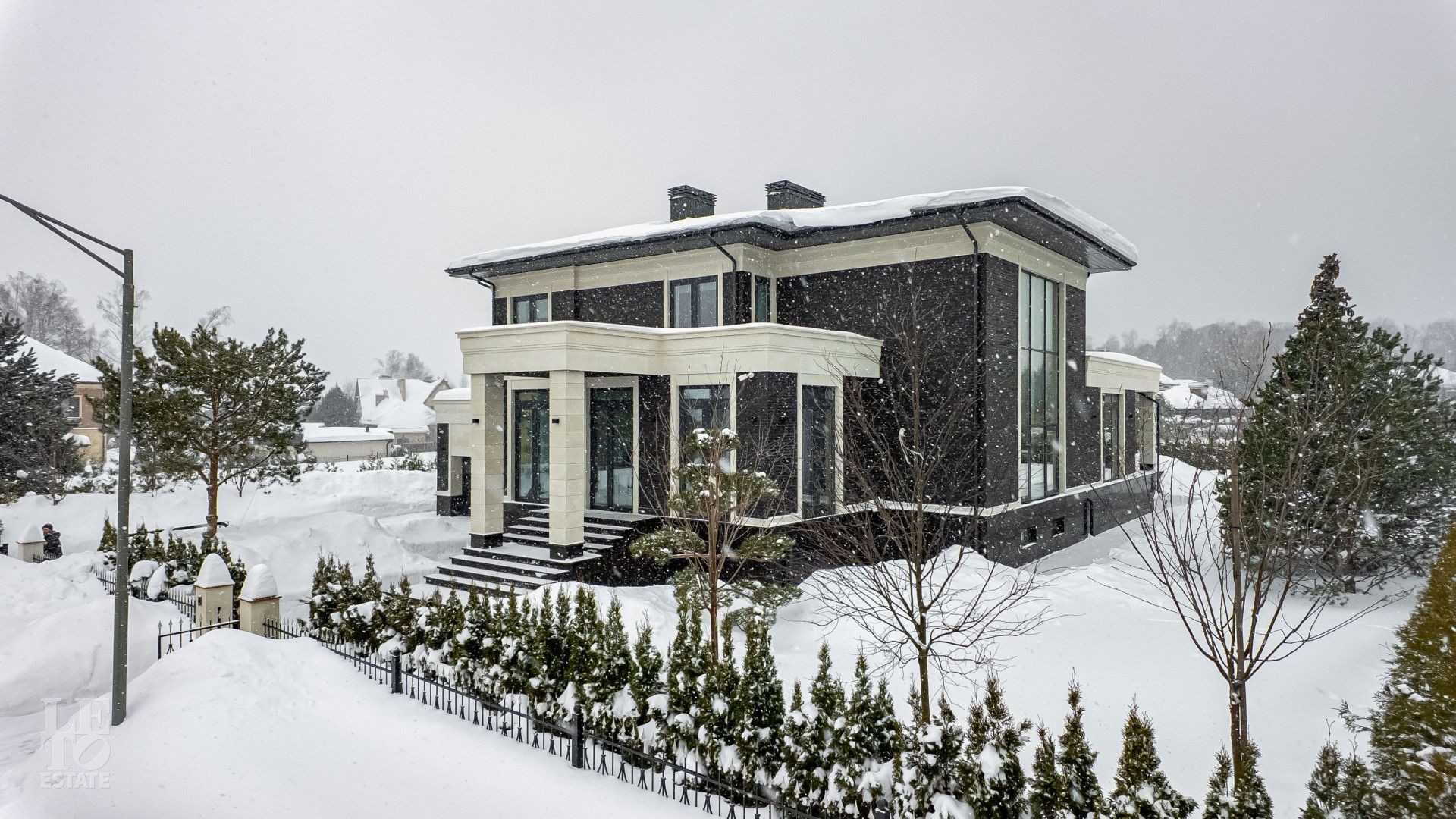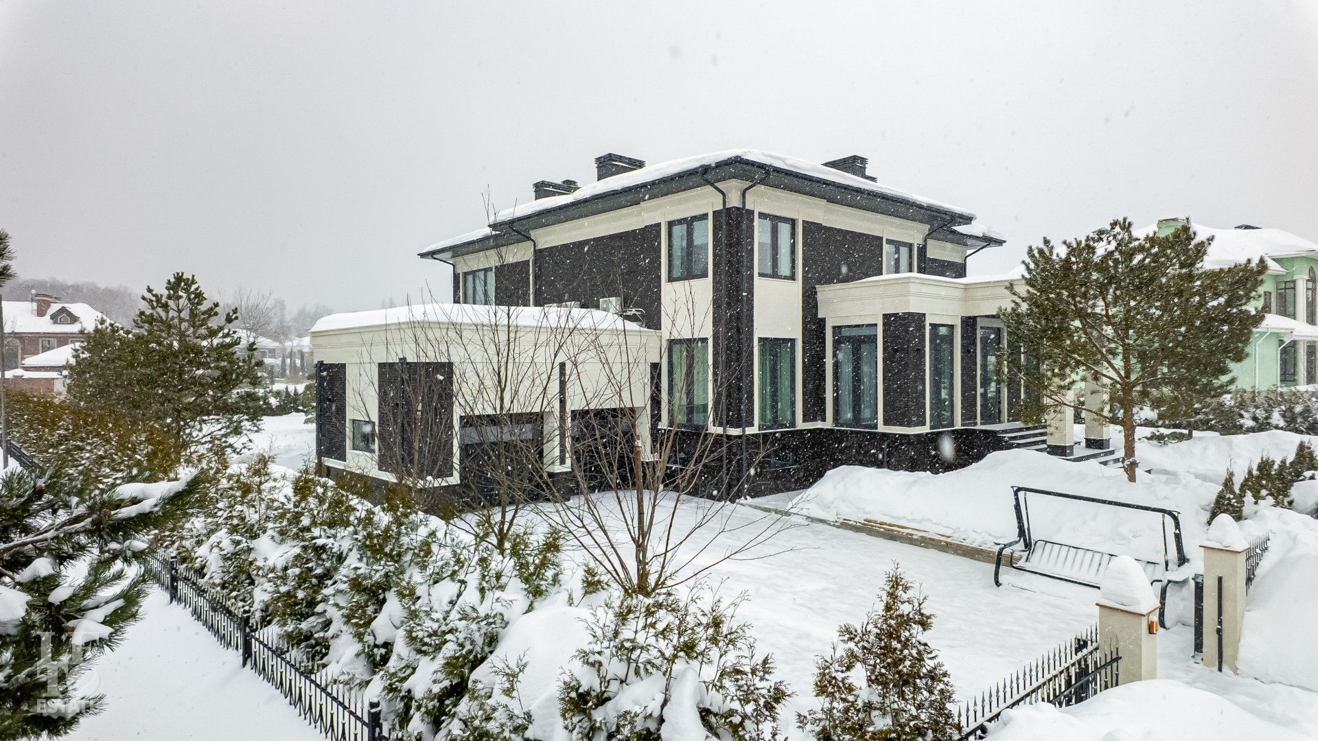 Дом площадью 627,9 м² на просторном участке 18 соток спроектирован по канонам современной классики. Фасад облицован натуральным камнем и клинкером ручной формовки, цоколь и отмостка выполнены из гранита. Главная особенность — второй свет в гостиной, наполняющий дом воздухом и естественным светом.