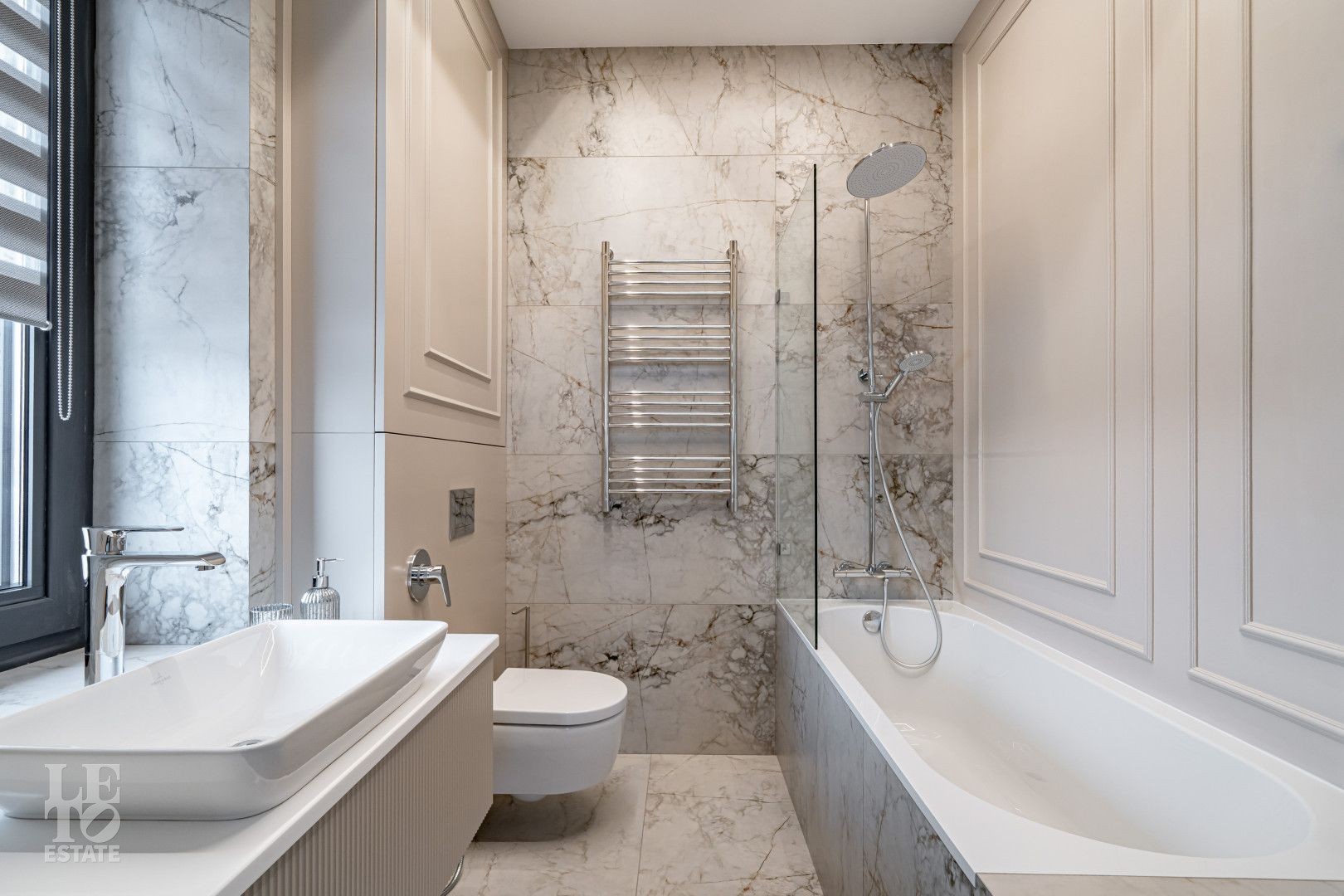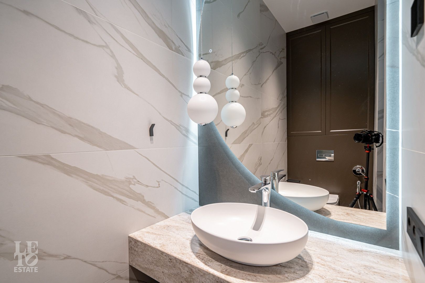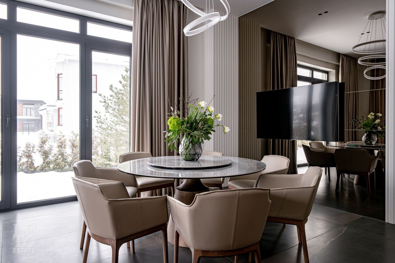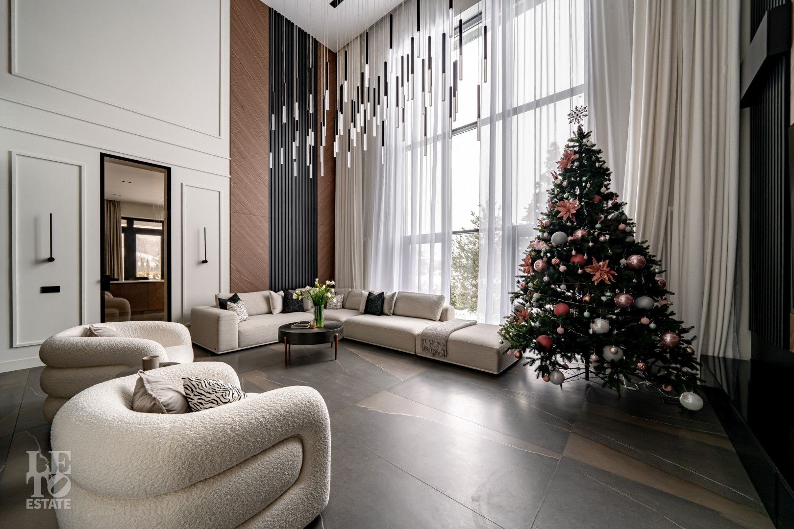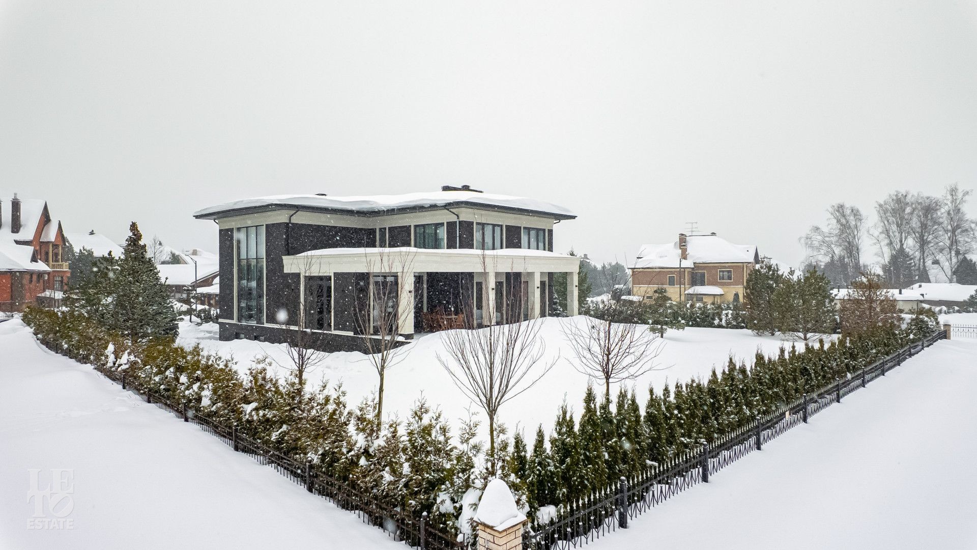 Дом площадью 627,9 м² на просторном участке 18 соток спроектирован по канонам современной классики. Фасад облицован натуральным камнем и клинкером ручной формовки, цоколь и отмостка выполнены из гранита. Главная особенность — второй свет в гостиной, наполняющий дом воздухом и естественным светом.