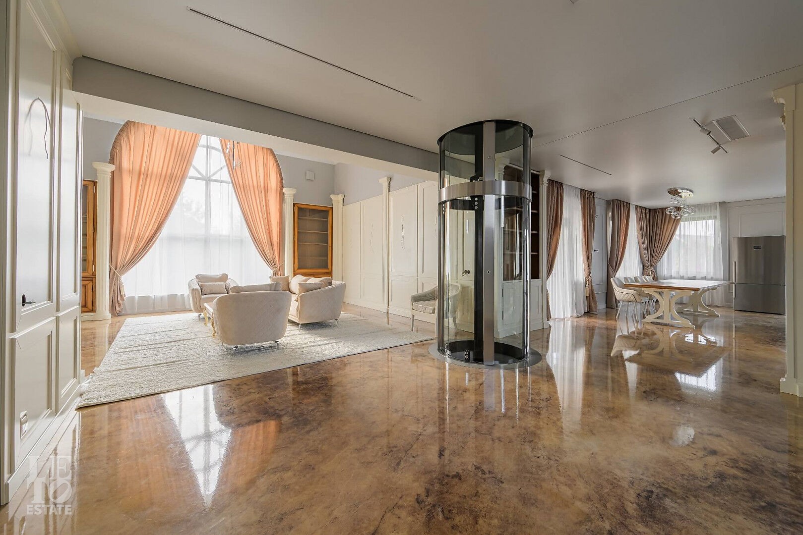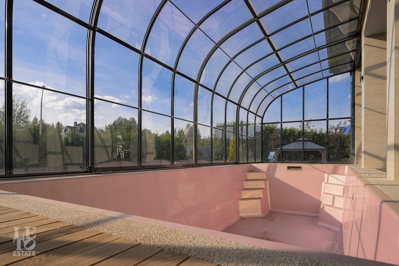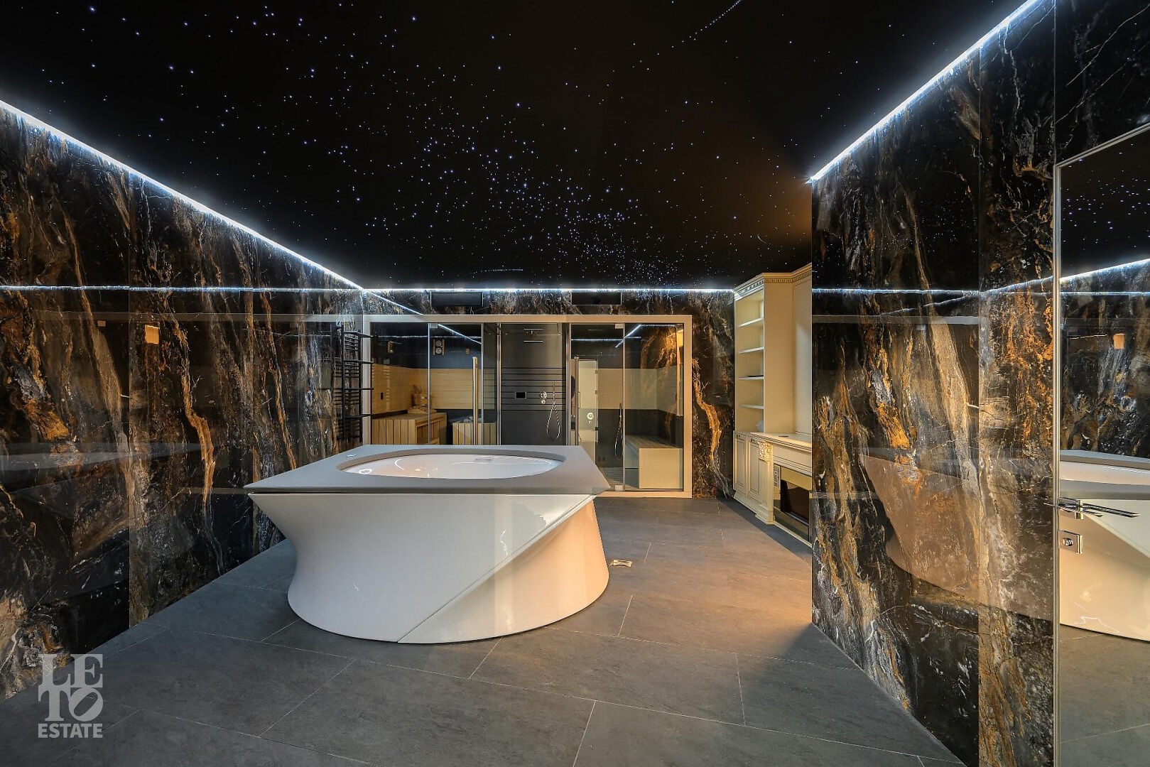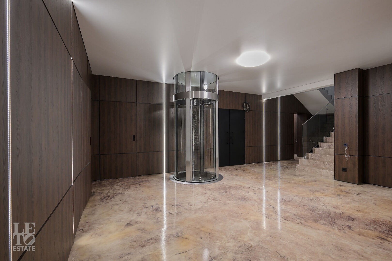 Особенности: стеклянный лифт на 3 этажа, панорамные окна, второй свет 6,5 м в гостиной, бассейн (7*3 м глубиной 1,5 м, с подогревом, подсветкой и противотоком), спа-зона (джакузи, сауна, хамам, душ впечатлений и гидромассажная ванна на 4 человека), стеклянный купол в бассейне, мастер-этаж с двумя спальнями, бетонный бункер (сейфовая комната “паник-рум” с бронедверью, вентиляцией и интернетом).