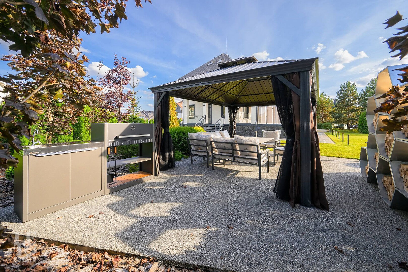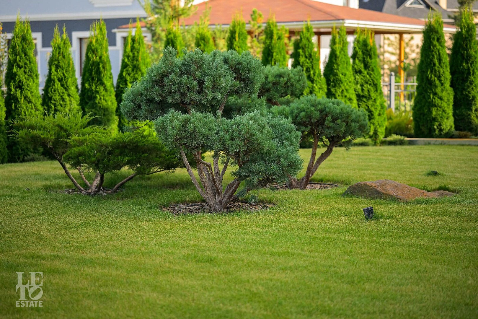 По периметру высажен плотный ряд туй. На участке - большая беседка с барбекю-зоной, диванной группой, обеденным столом на 6-8 персон, дизайнерской дровницей.