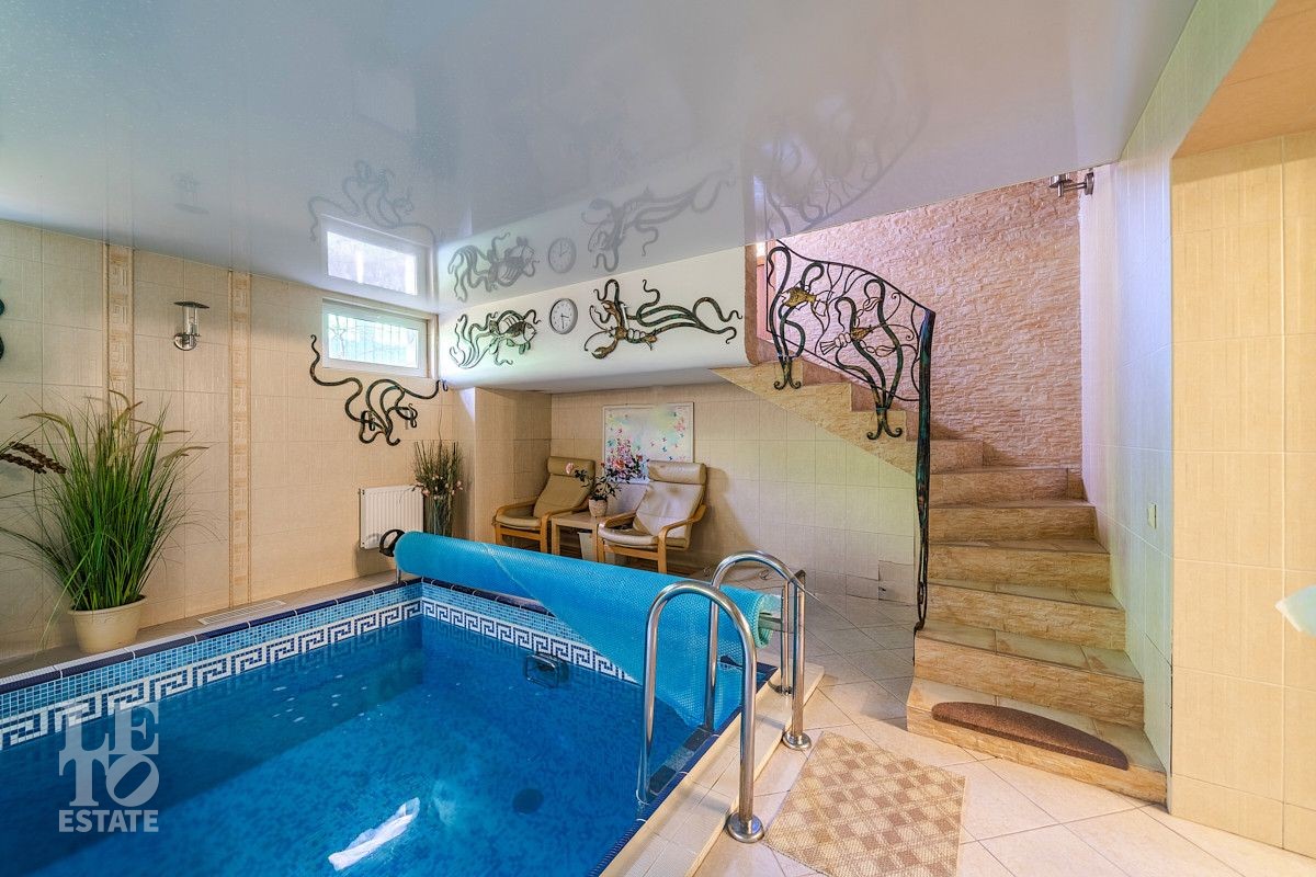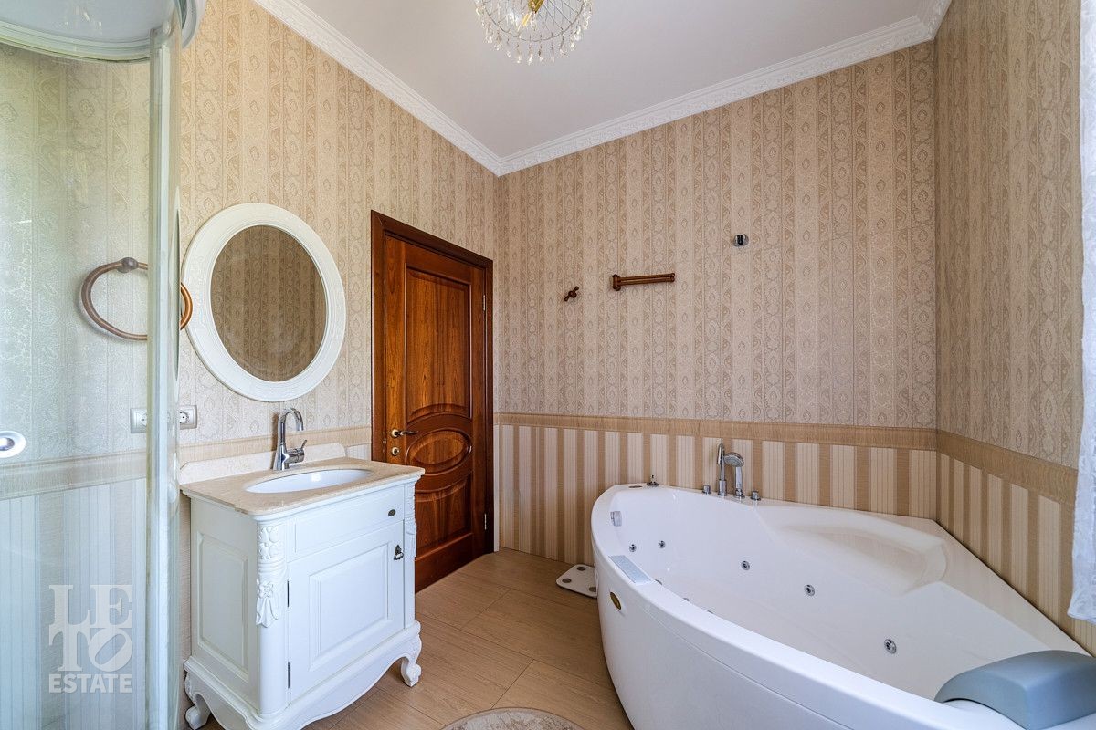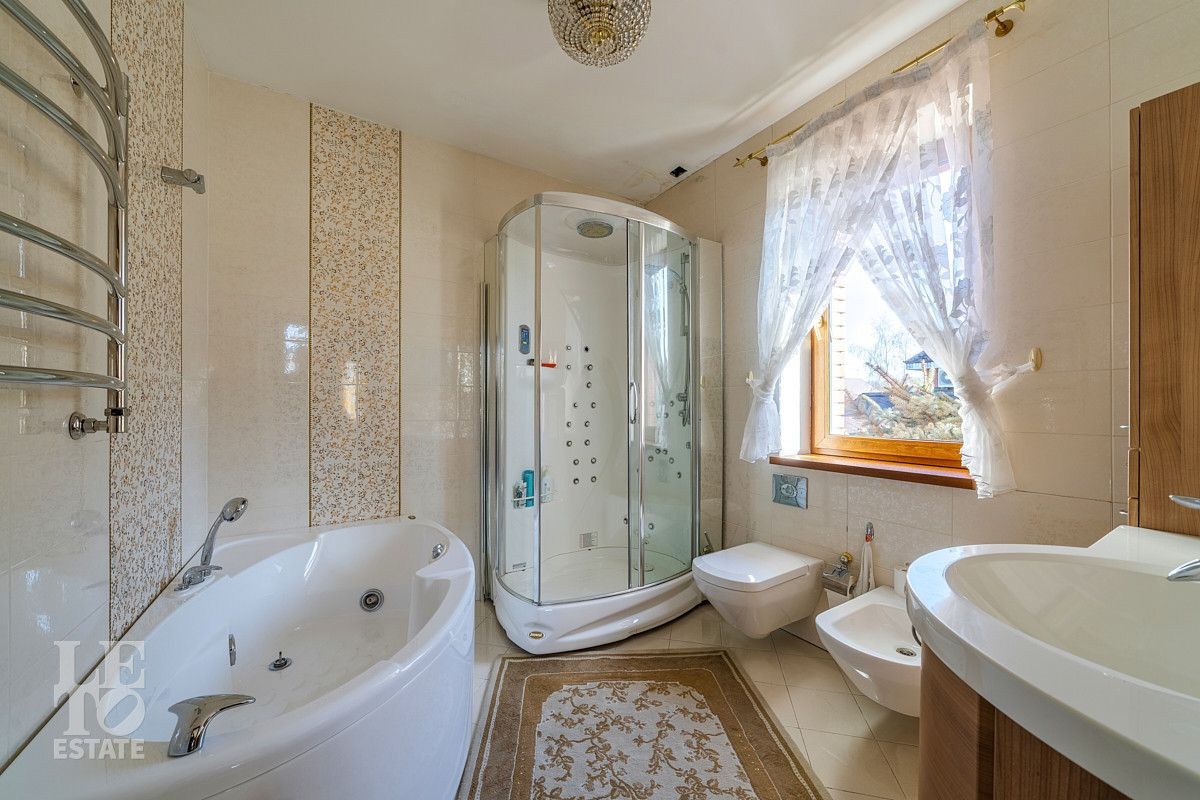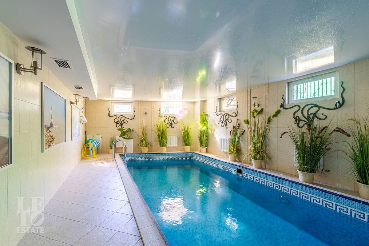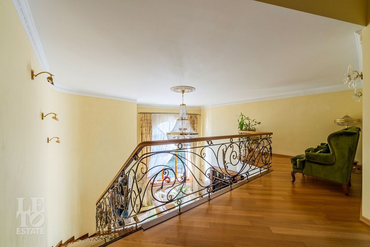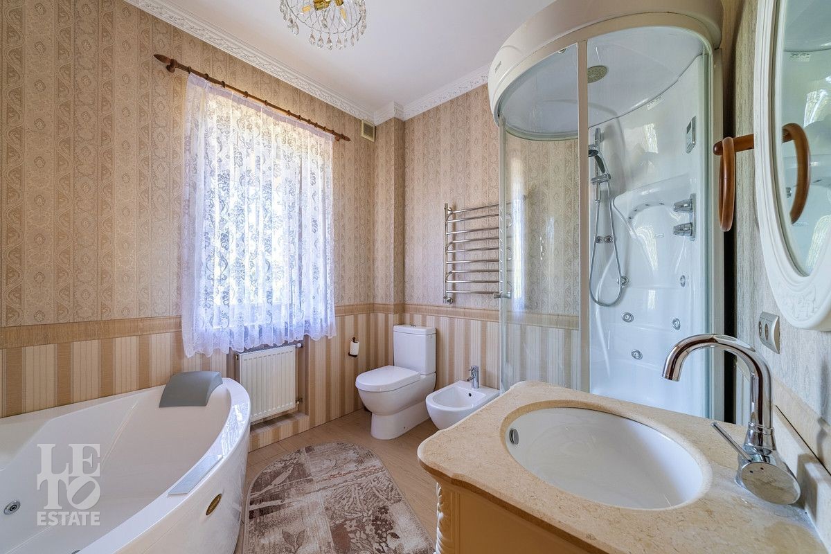 Дизайн этого дома выполнен в классическом стиле, отделка выполнена из качественных европейских материалов. Высокие потолки, второй свет в просторной гостиной, дровяной камин, зимний сад, крытый бассейн - все это создает прекрасное пространство для жизни большой семьи. Хорошо продуманные планировочные решения обеспечивают оптимальную организацию пространства, а роскошный интерьер удовлетворит самый взыскательный запрос . Установленная техника ведущих мировых марок гарантирует эффективность и надежность в использовании. Сантехника ведущих европейских брендов "Villeroy & Boch", Jacuzzi, Albatros известных своим качеством и стилем. Большие окна позволяют максимально использовать естественное освещение, подчеркивая красоту как внутренних, так и внешних видов.