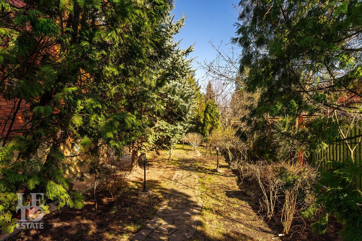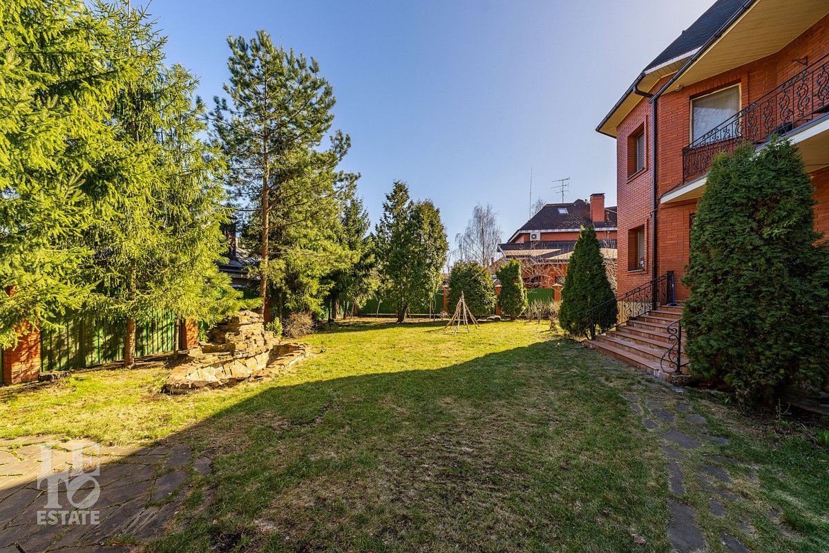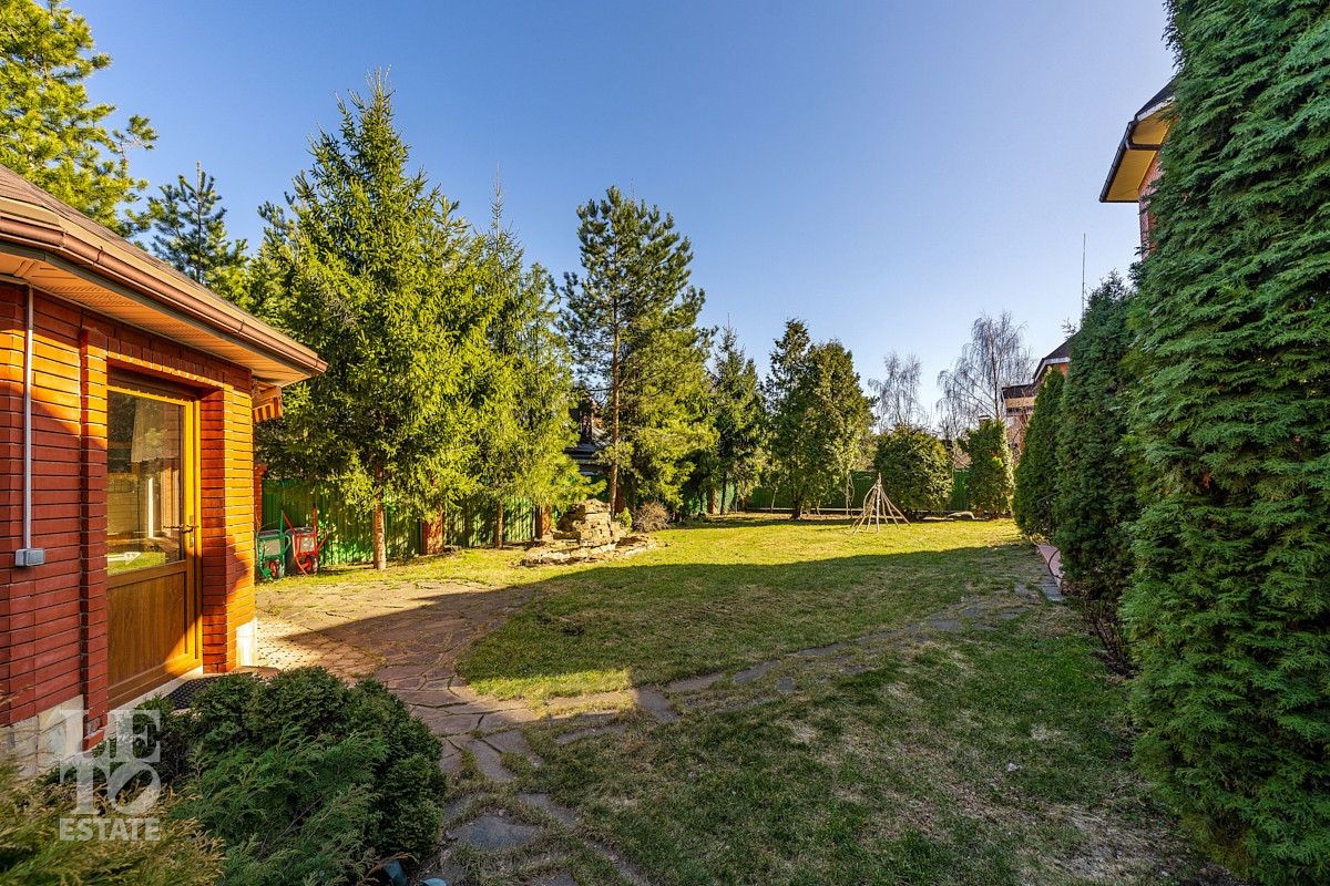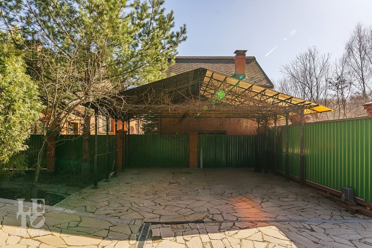 На участке площадью 12 соток выполнено ландшафтное озеленение с множеством декоративных хвойных деревевьев, а также плодово-ягодных деревьев и кустарников. На территории разместилось отдельно стоящее здание мангальной с полноценной кухней и дровяной печью (мангал, казан), в этом же здании предусмотрено несколько помещений для хранения хозинвентаря и других садовых принадлежностей. Также немаловажно отметить наличие квартиры для персонала с отдельным входом с улицы. Помимо теплого гаража для автомобиля в самом доме, предусмотрен навес на улице для двух авто, а также площадка ещё для 4 автомобилей перед домом. Въезд на участок осуществляется через автоматические откатные ворота.