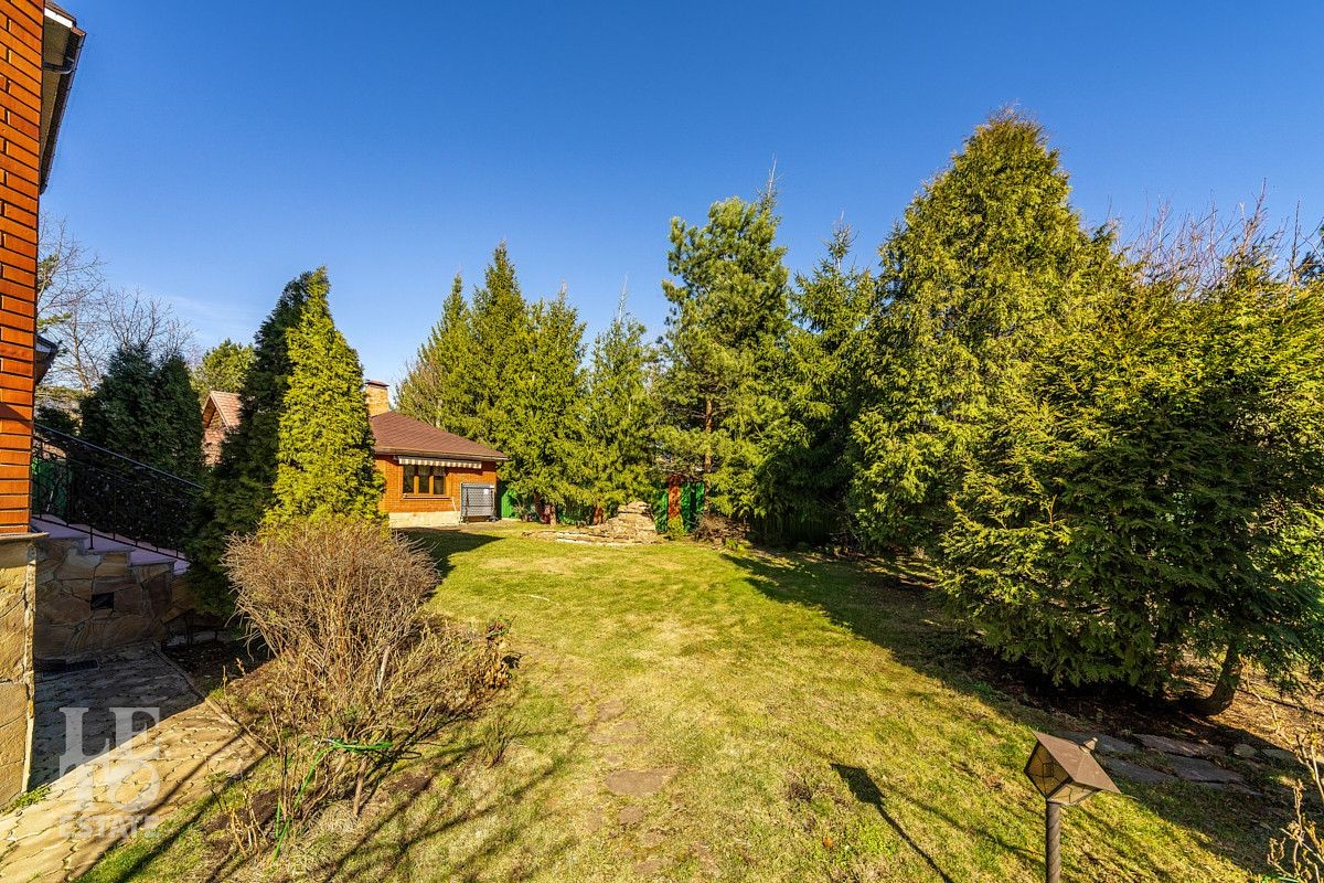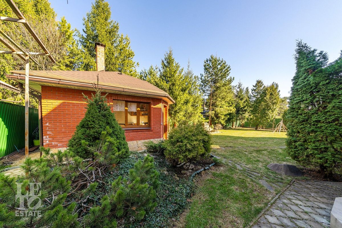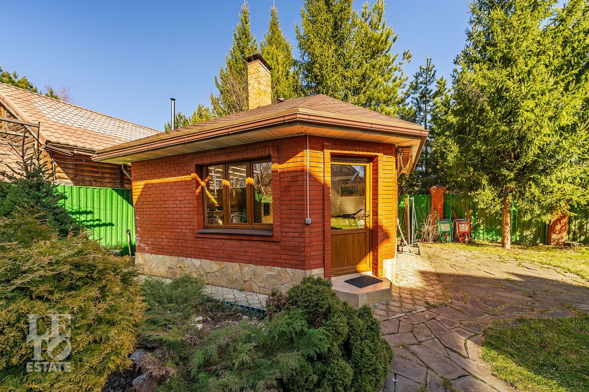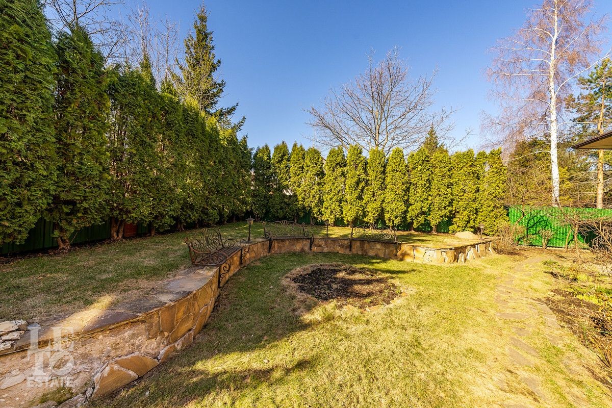 На участке площадью 12 соток выполнено ландшафтное озеленение с множеством декоративных хвойных деревевьев, а также плодово-ягодных деревьев и кустарников. На территории разместилось отдельно стоящее здание мангальной с полноценной кухней и дровяной печью (мангал, казан), в этом же здании предусмотрено несколько помещений для хранения хозинвентаря и других садовых принадлежностей. Также немаловажно отметить наличие квартиры для персонала с отдельным входом с улицы. Помимо теплого гаража для автомобиля в самом доме, предусмотрен навес на улице для двух авто, а также площадка ещё для 4 автомобилей перед домом. Въезд на участок осуществляется через автоматические откатные ворота.