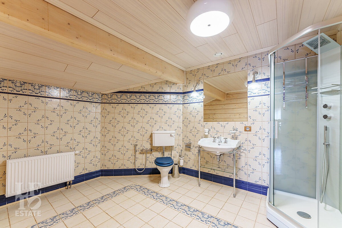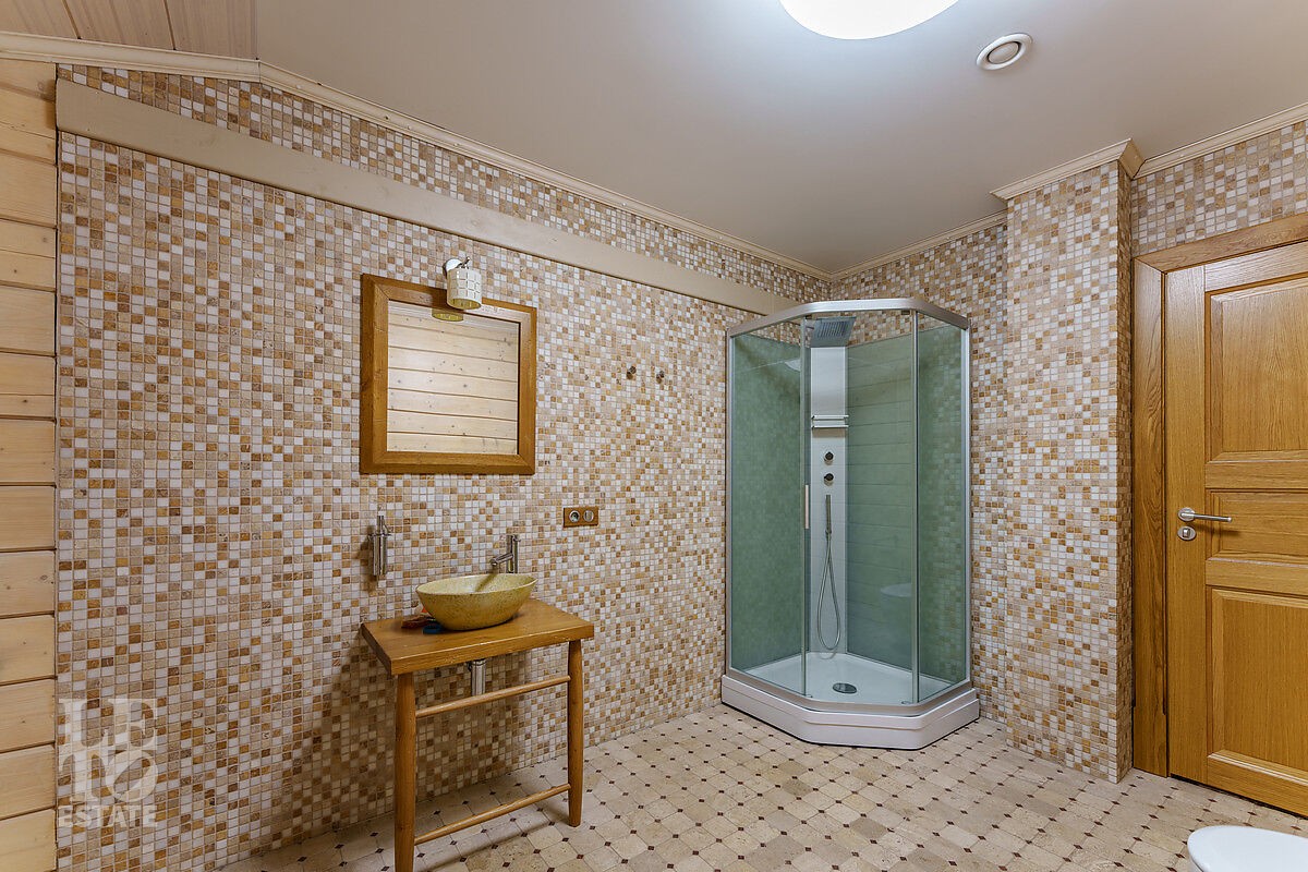 Отличительной особенностью данного дома является наличие полноценного СПА комплекса включающего большой бассейн размером 4 на 8 метров, финскую сауну Harvia, купель, джакузи, душевую кабину функцией с хаммама.