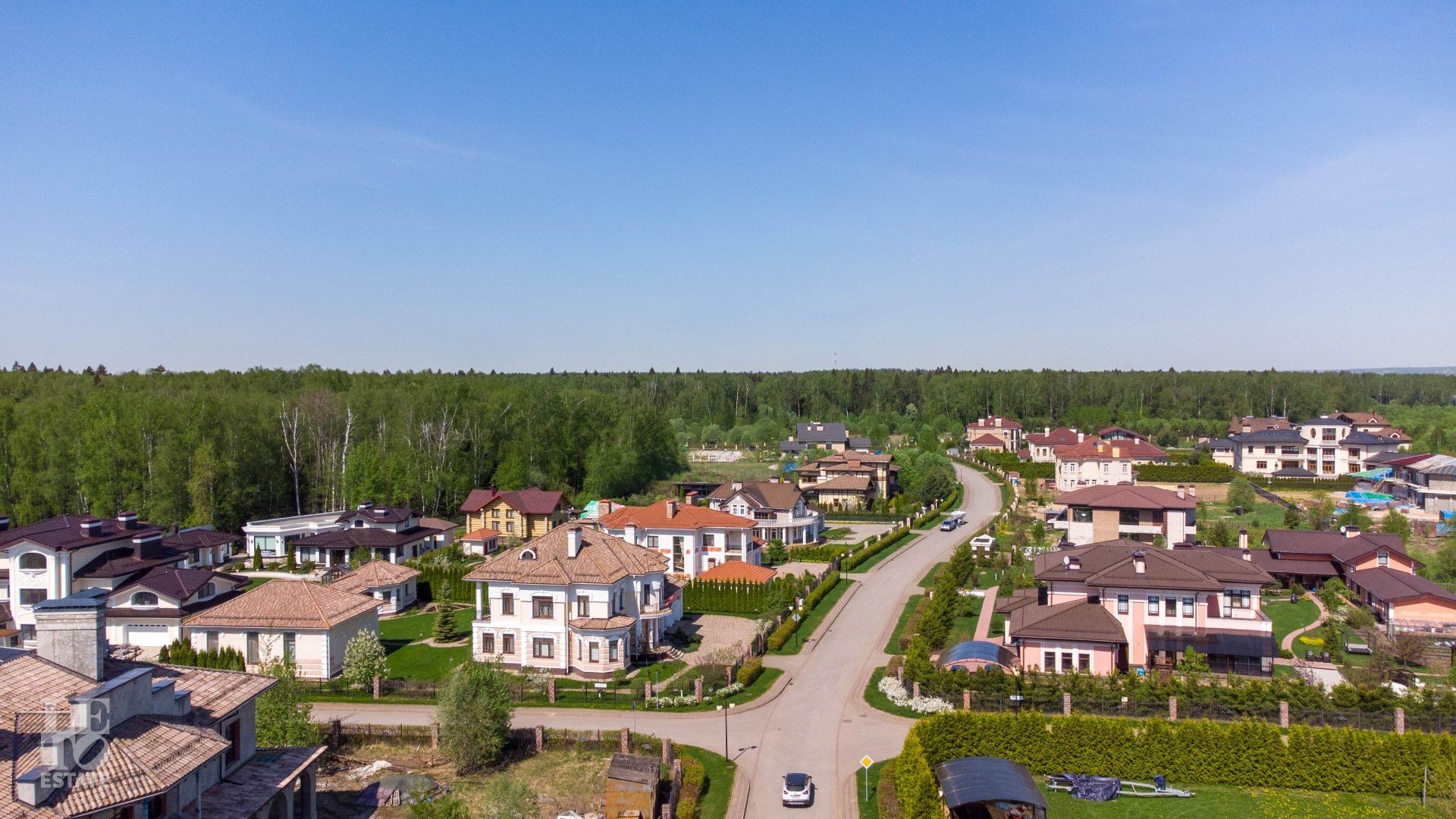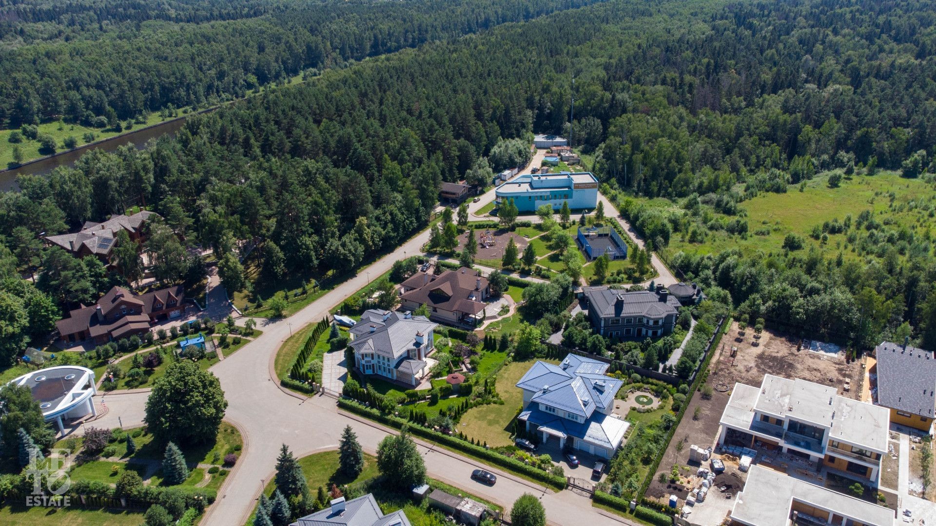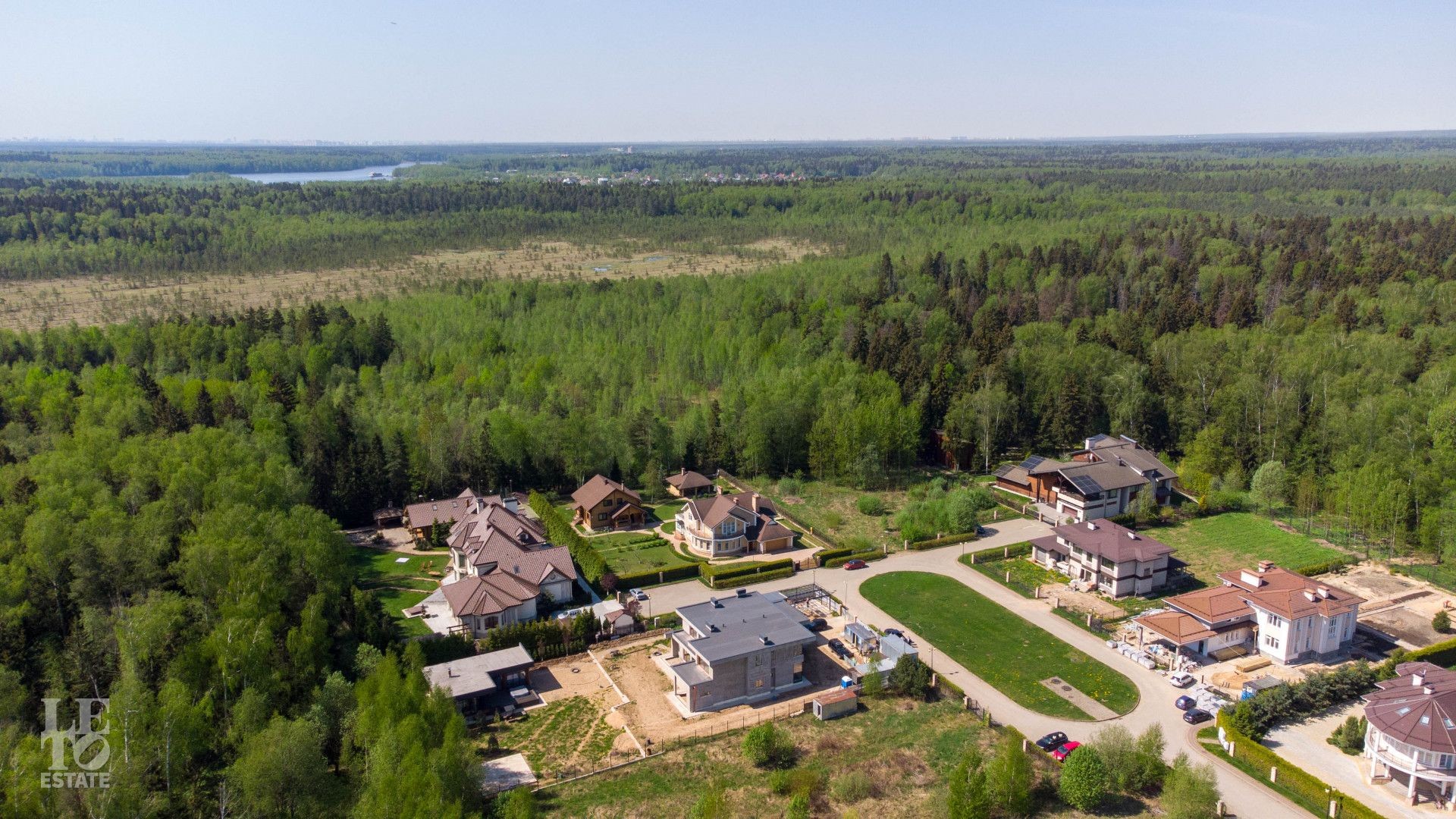 На территории поселка находится 92 дома, которые подчинены одному архитектурному стилю. При строительстве домов застройщик использовал экологически чистые натуральные материалы. Коттеджи, которые располагаются на участках от 20 соток до 2 гектар, имеют продуманный план. Крупные оконные проемы, многоуровневые крыши и просторные лоджии гармонично вписались в ландшафт. В поселке имеются тротуары и пешеходные зоны, которые вымощены брусчаткой. Многочисленные палисадники и парковые зоны расположены по всей 42-гектарной территории поселка. Если вас не устроят предложения недвижимости по домам и коттеджам, можно купить участок в КП Лазурный берег.