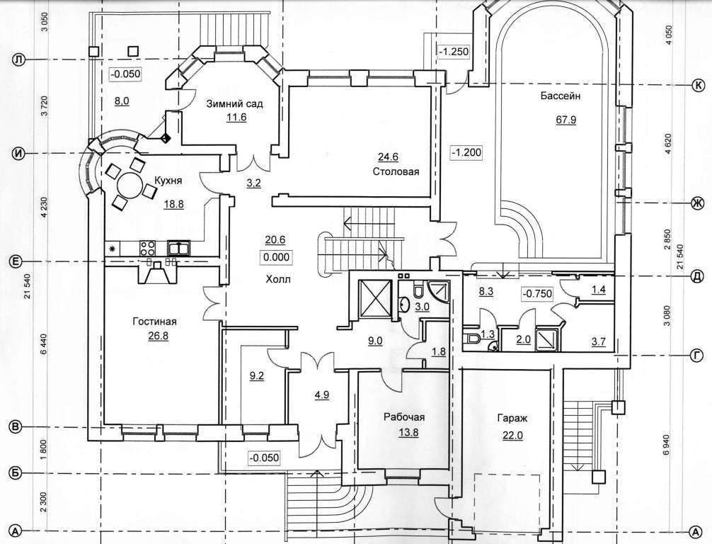 Первый этаж - прихожая, кухня, гостиная, столовая, зимний сад, бассейн, сауна, два санузда, гараж.