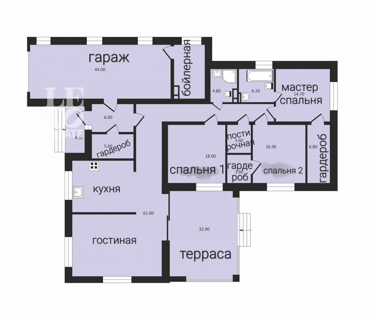 Прихожая и гардеробная, холл, кухня - столовая, просторная гостиная с выходом на террасу, гостевая спальня (кабинет/спортзал), детская спальня с гардеробной, мастер-спальня с ванной и гардеробной, санузел с душевой, постирочная, котельная, тёплый гараж на одно машино-место.