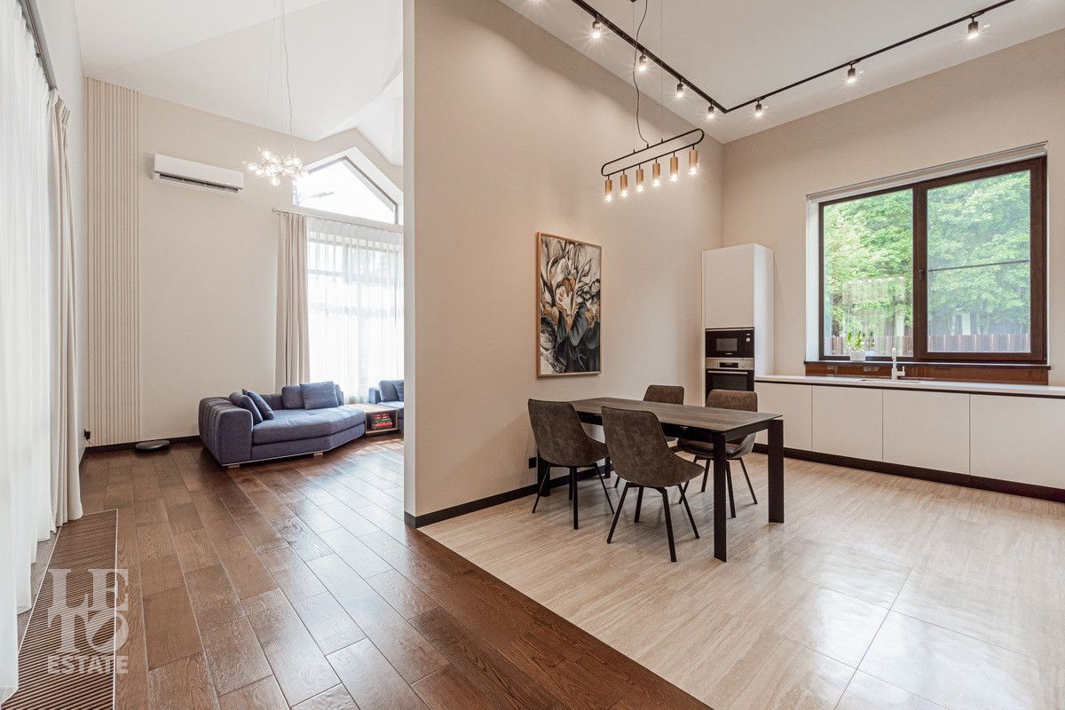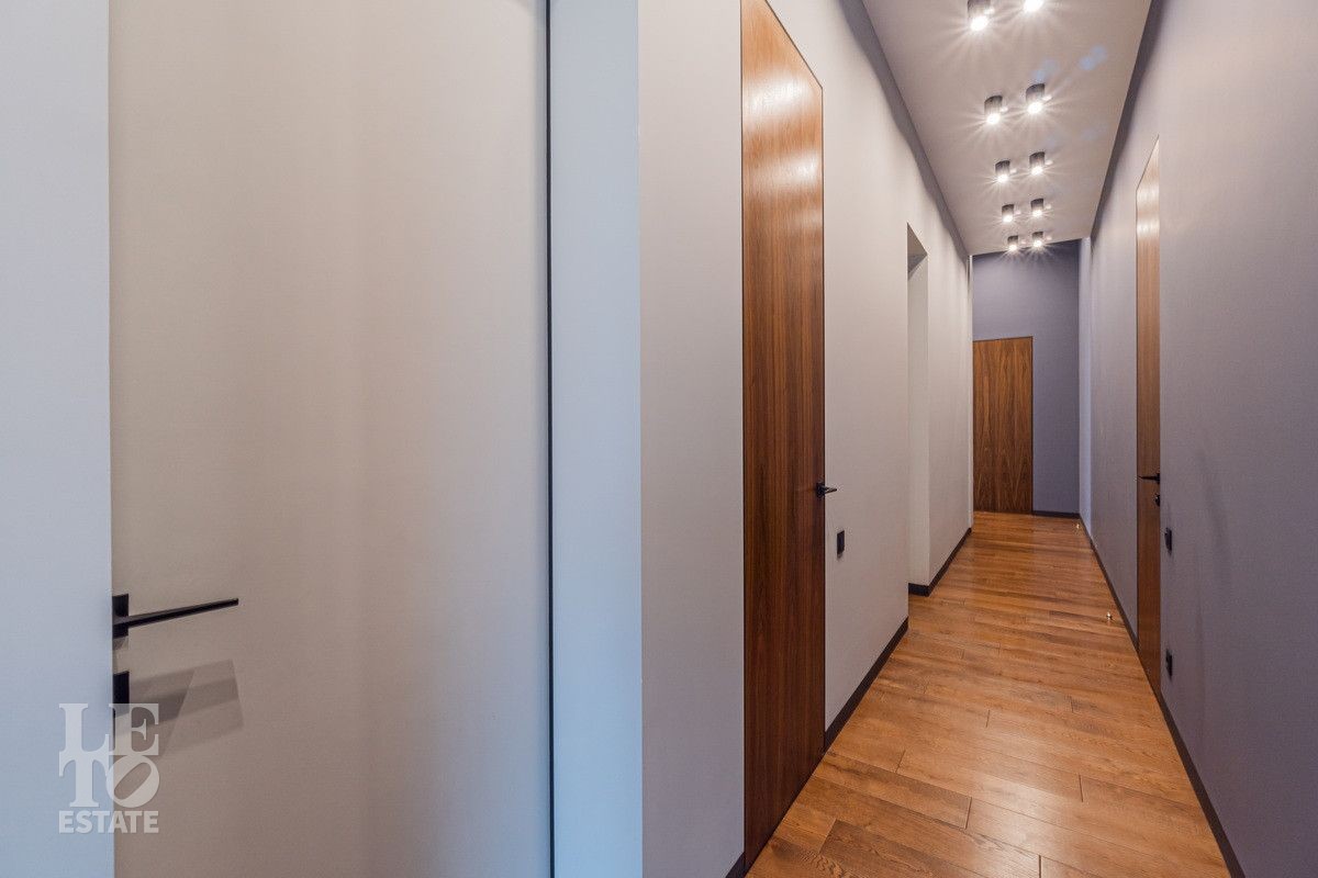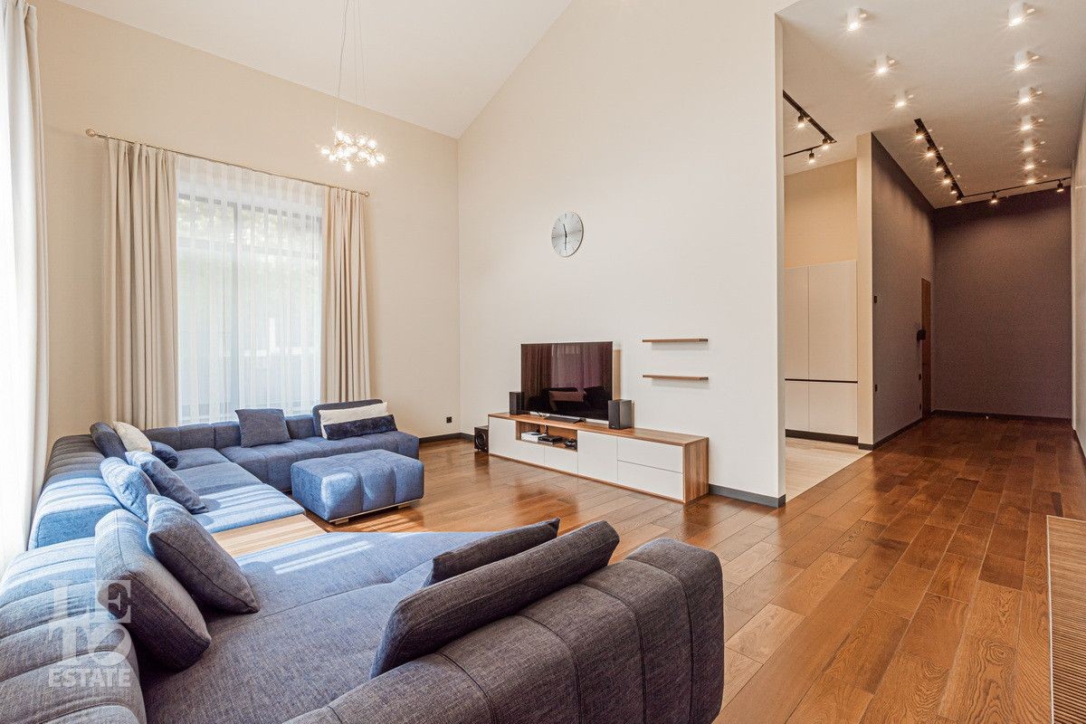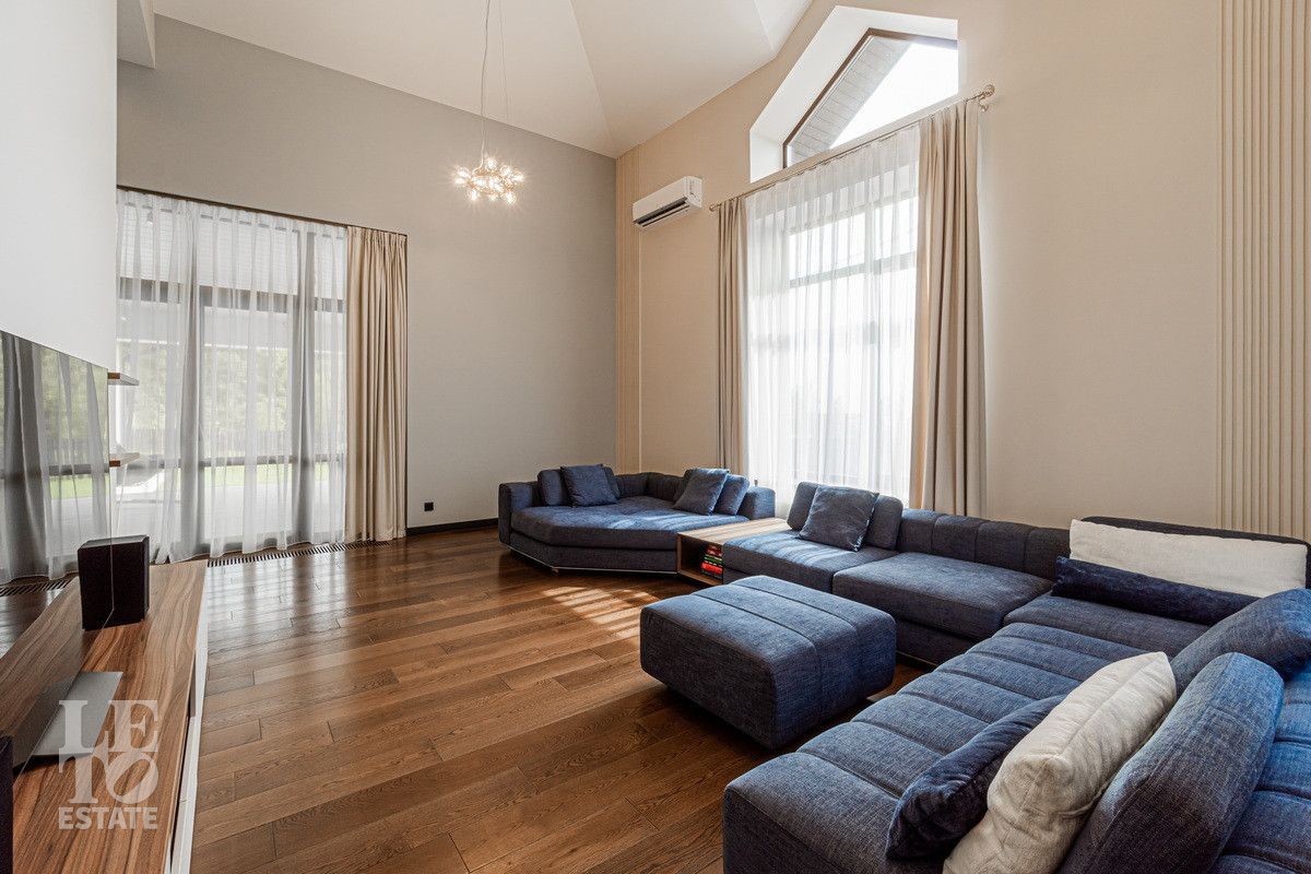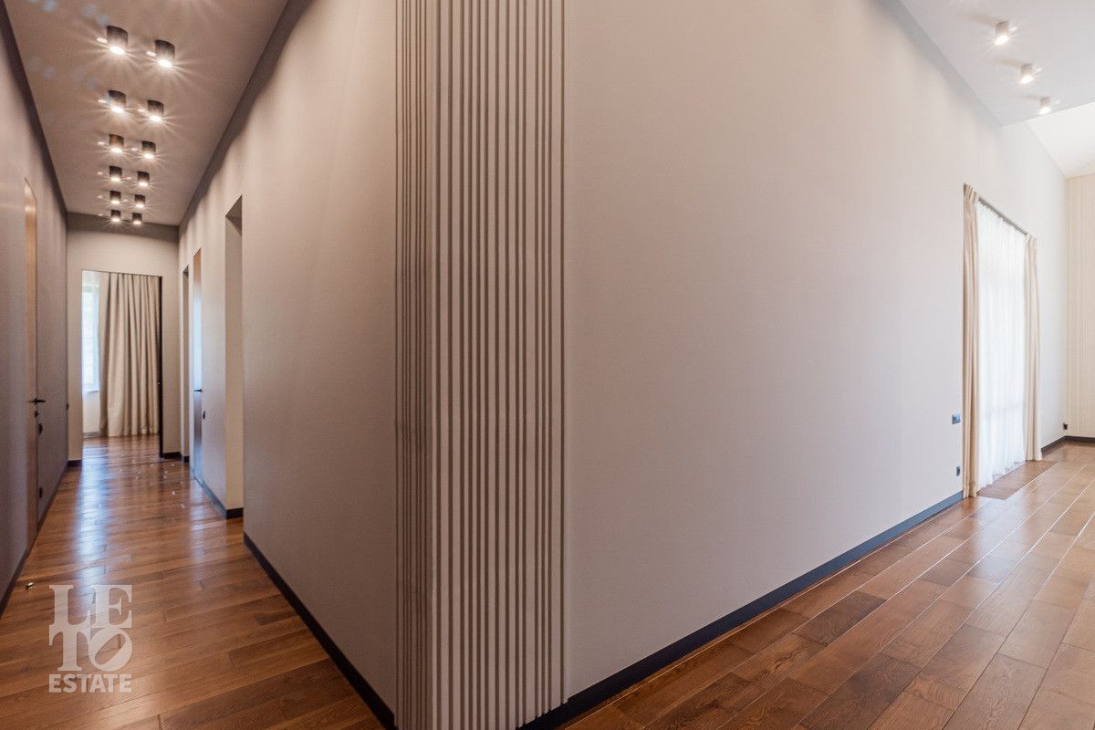 Внутри выполнена качественная отделка под ключ в современном стиле. Дом полностью меблирован и оснащён бытовой техникой Liebherr, ASKO и Bosch. Светлая цветовая гамма, потолки высотой от 3,5 до 5 метров и панорамное остекление в гостиной формируют ощущение простора и света. В отделке использованы инженерная доска, итальянский керамогранит, установлены двери Portalle.