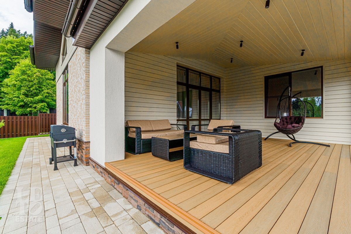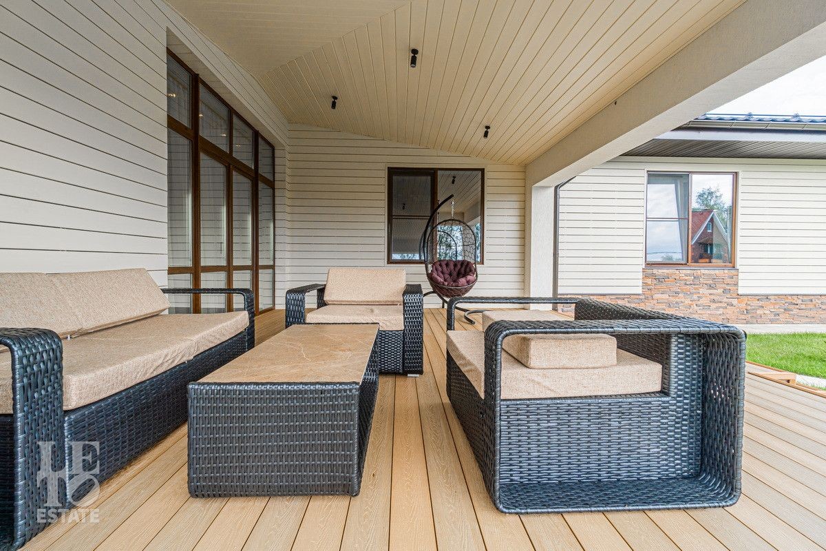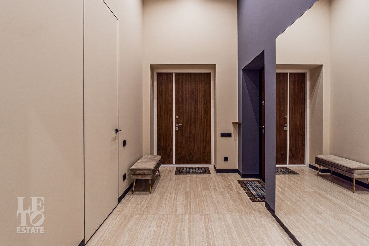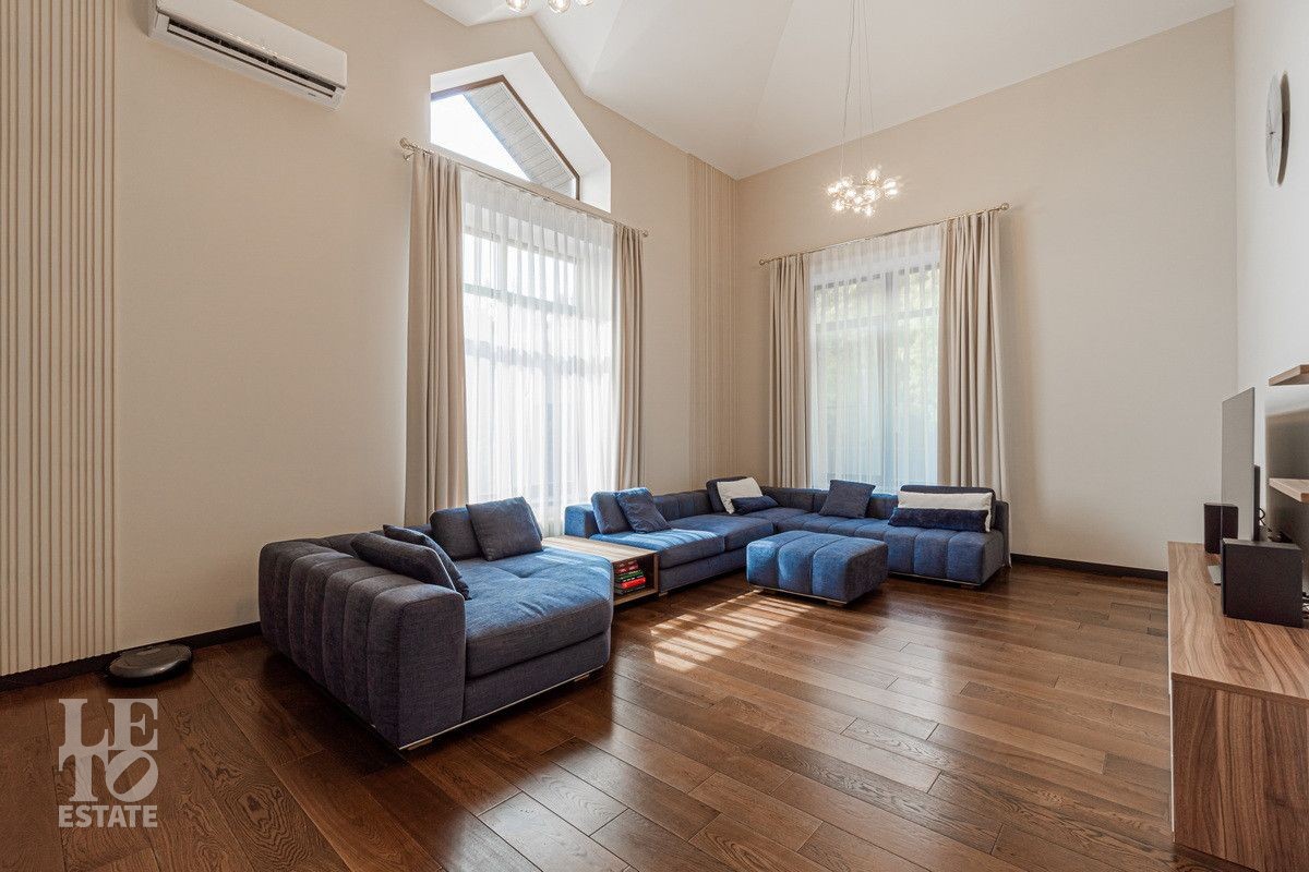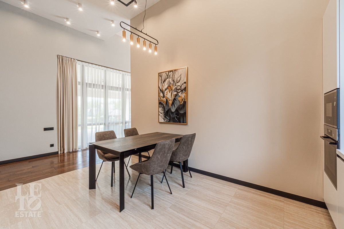 Внутри выполнена качественная отделка под ключ в современном стиле. Дом полностью меблирован и оснащён бытовой техникой Liebherr, ASKO и Bosch. Светлая цветовая гамма, потолки высотой от 3,5 до 5 метров и панорамное остекление в гостиной формируют ощущение простора и света. В отделке использованы инженерная доска, итальянский керамогранит, установлены двери Portalle.