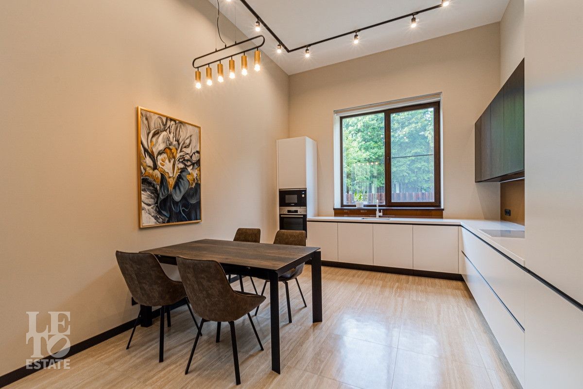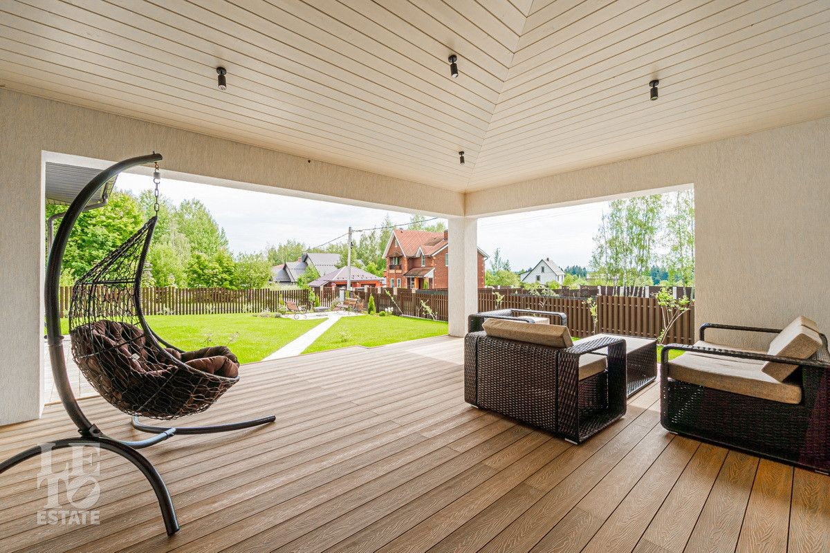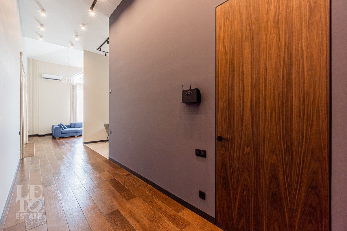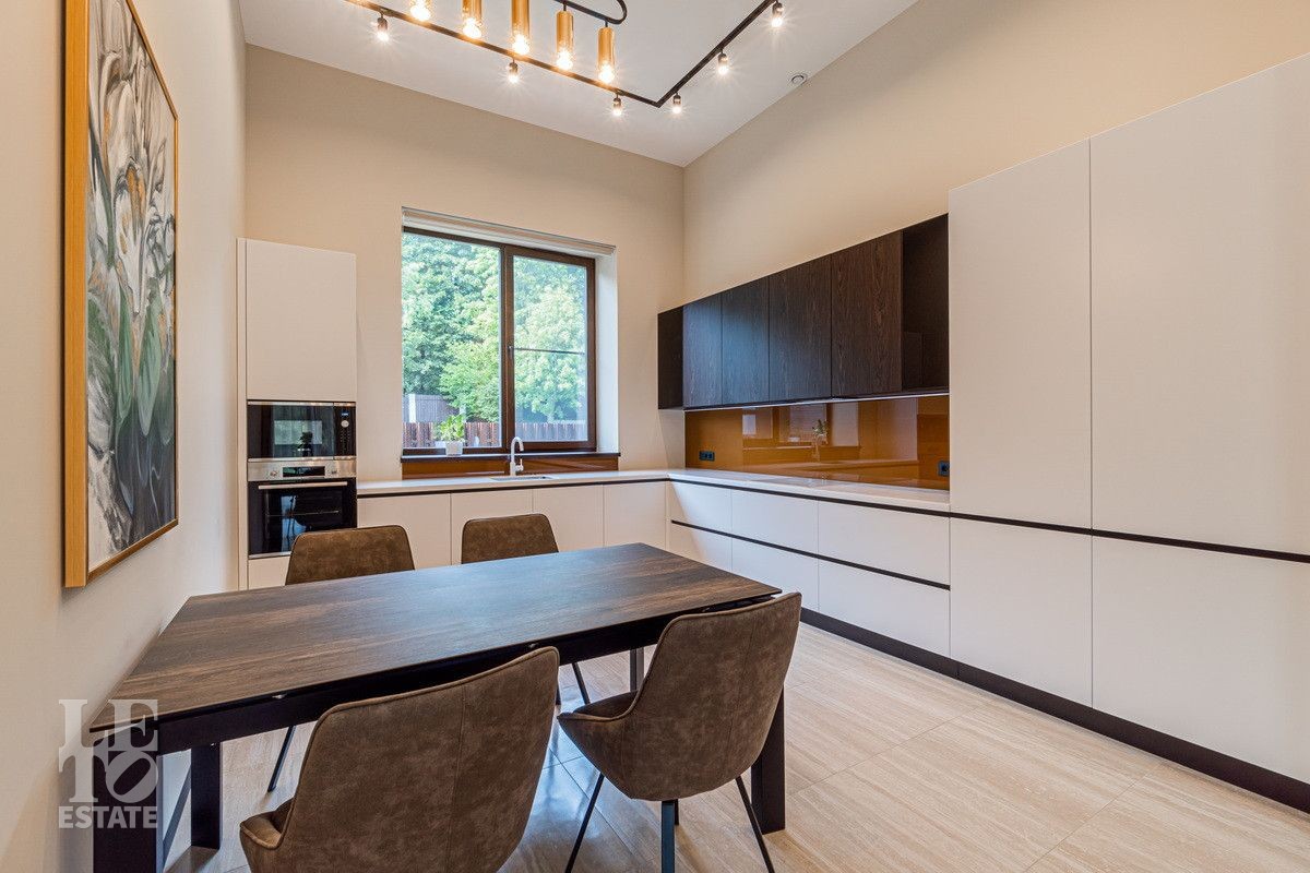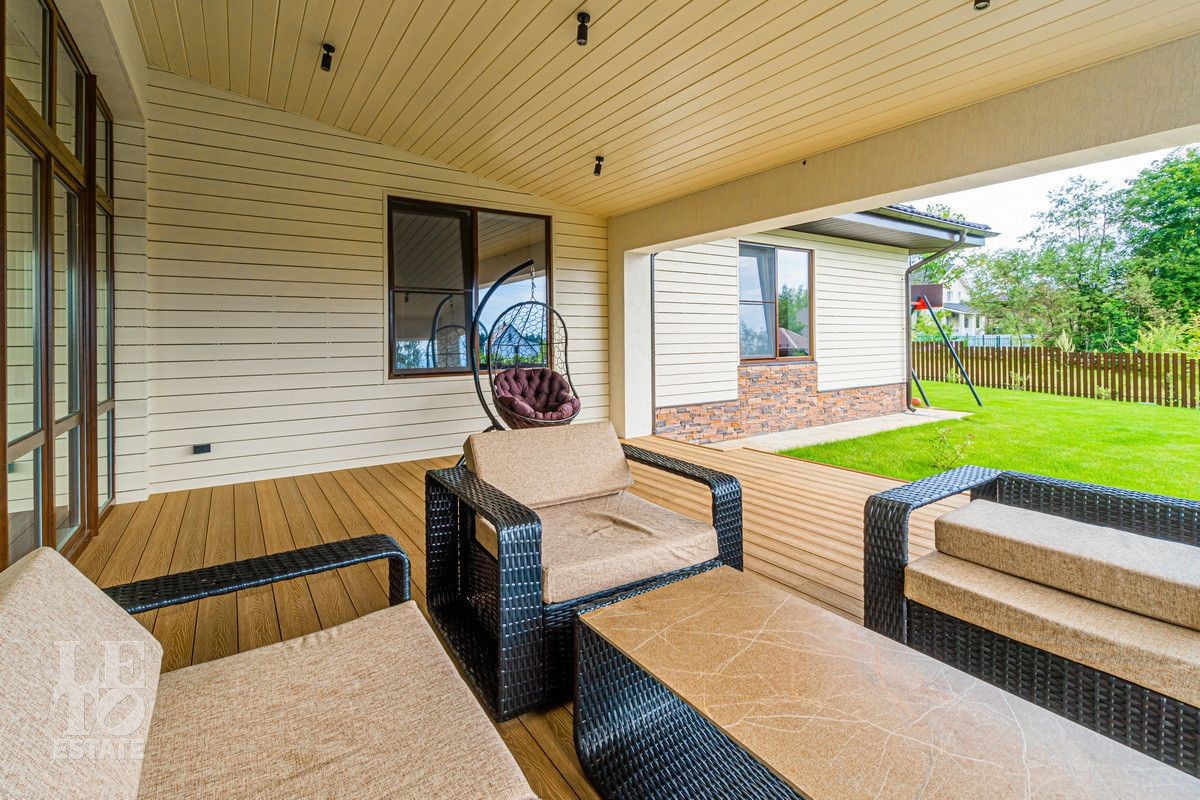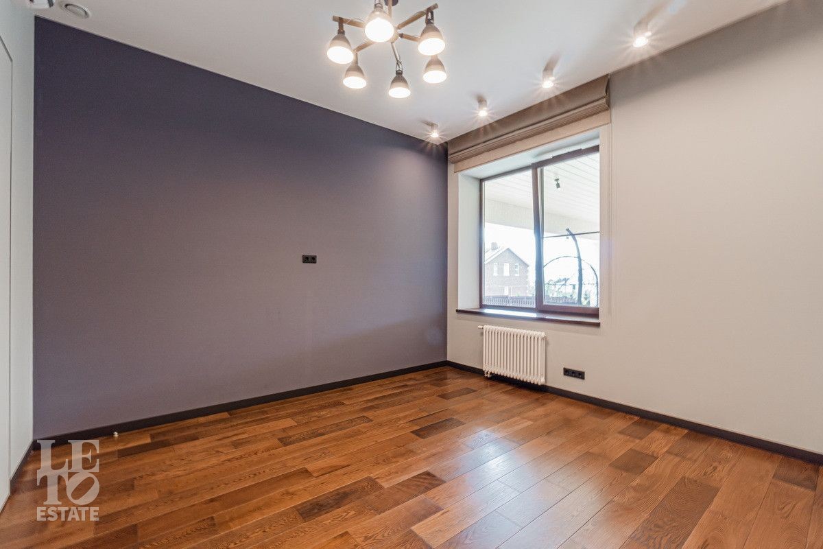 Внутри выполнена качественная отделка под ключ в современном стиле. Дом полностью меблирован и оснащён бытовой техникой Liebherr, ASKO и Bosch. Светлая цветовая гамма, потолки высотой от 3,5 до 5 метров и панорамное остекление в гостиной формируют ощущение простора и света. В отделке использованы инженерная доска, итальянский керамогранит, установлены двери Portalle.
