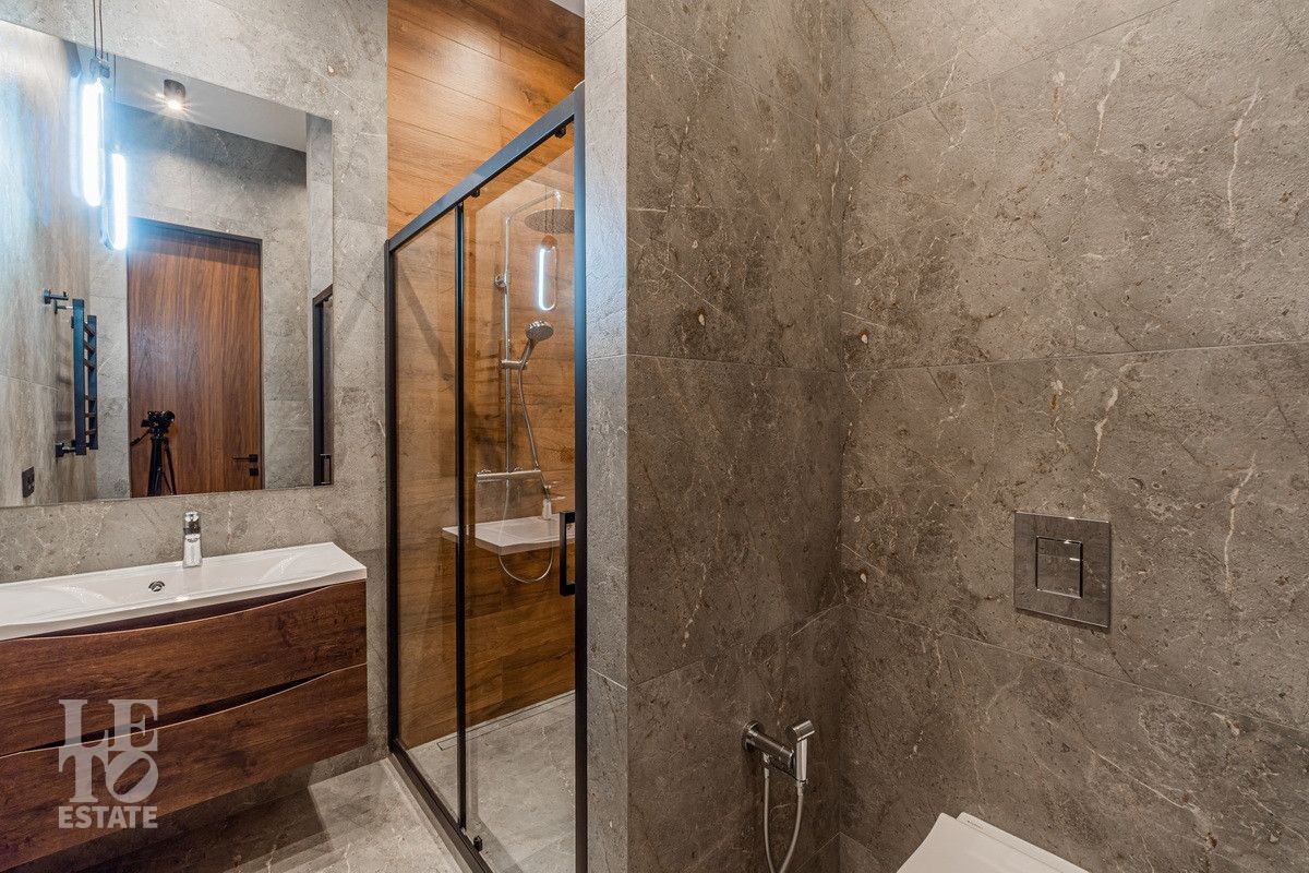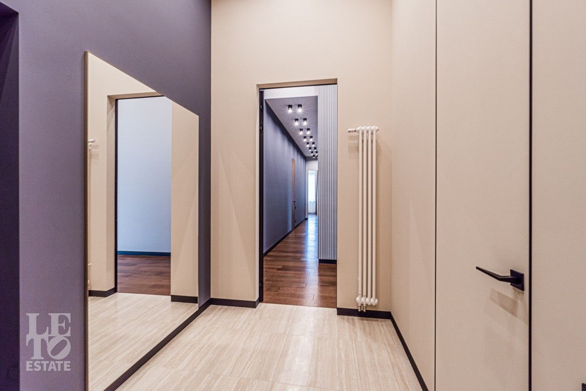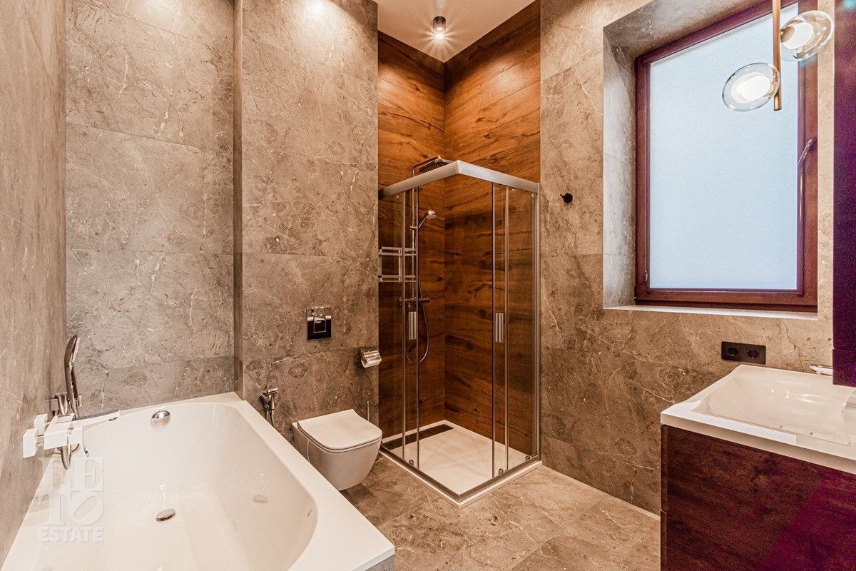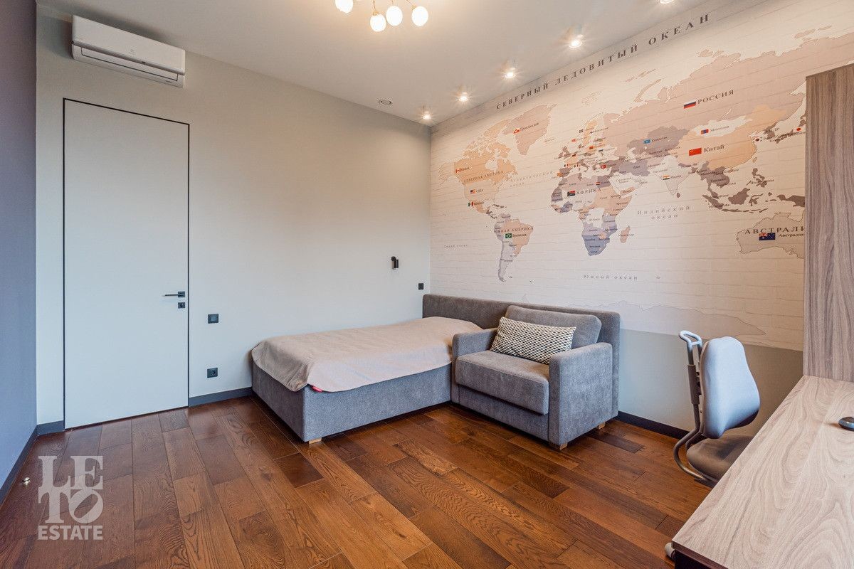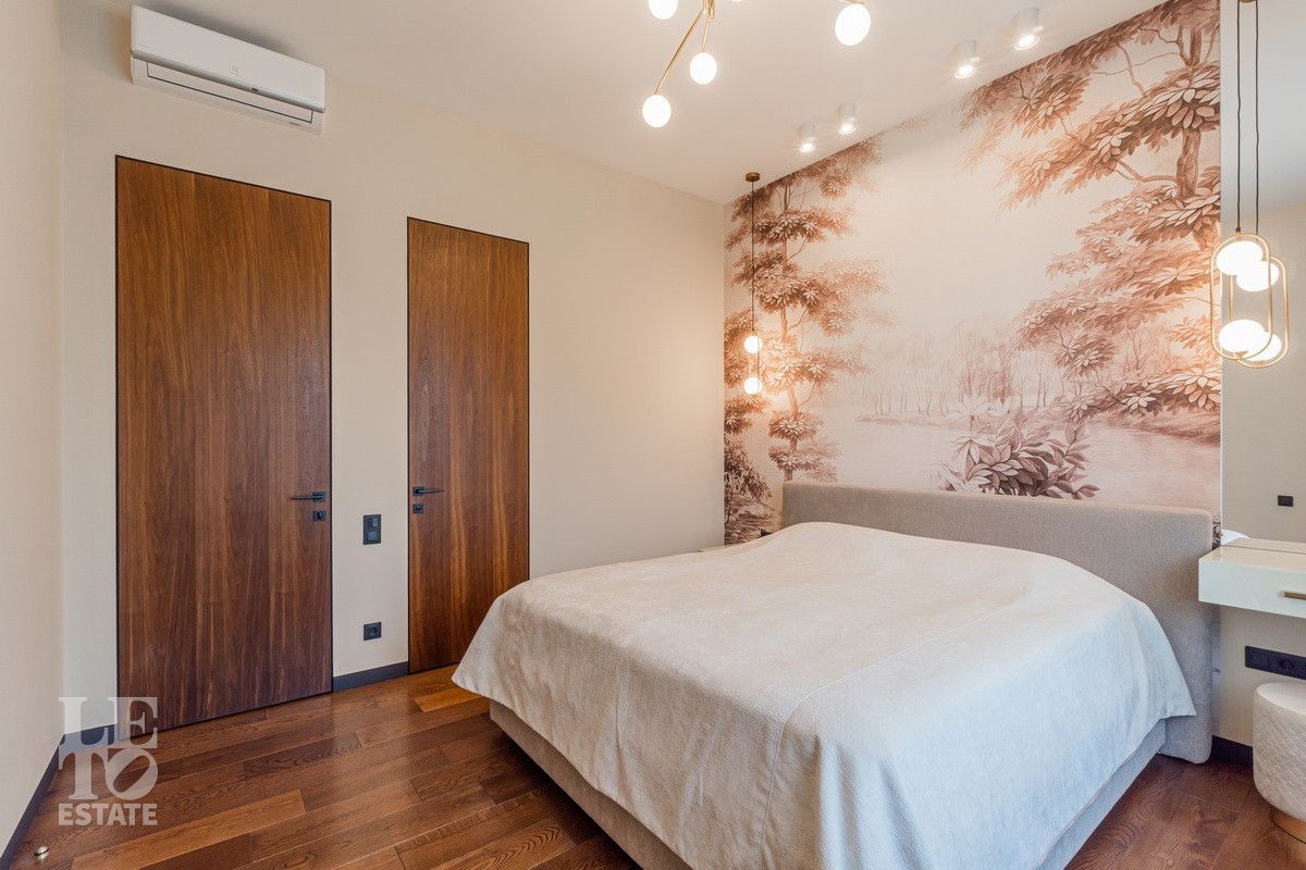 Внутри выполнена качественная отделка под ключ в современном стиле. Дом полностью меблирован и оснащён бытовой техникой Liebherr, ASKO и Bosch. Светлая цветовая гамма, потолки высотой от 3,5 до 5 метров и панорамное остекление в гостиной формируют ощущение простора и света. В отделке использованы инженерная доска, итальянский керамогранит, установлены двери Portalle.