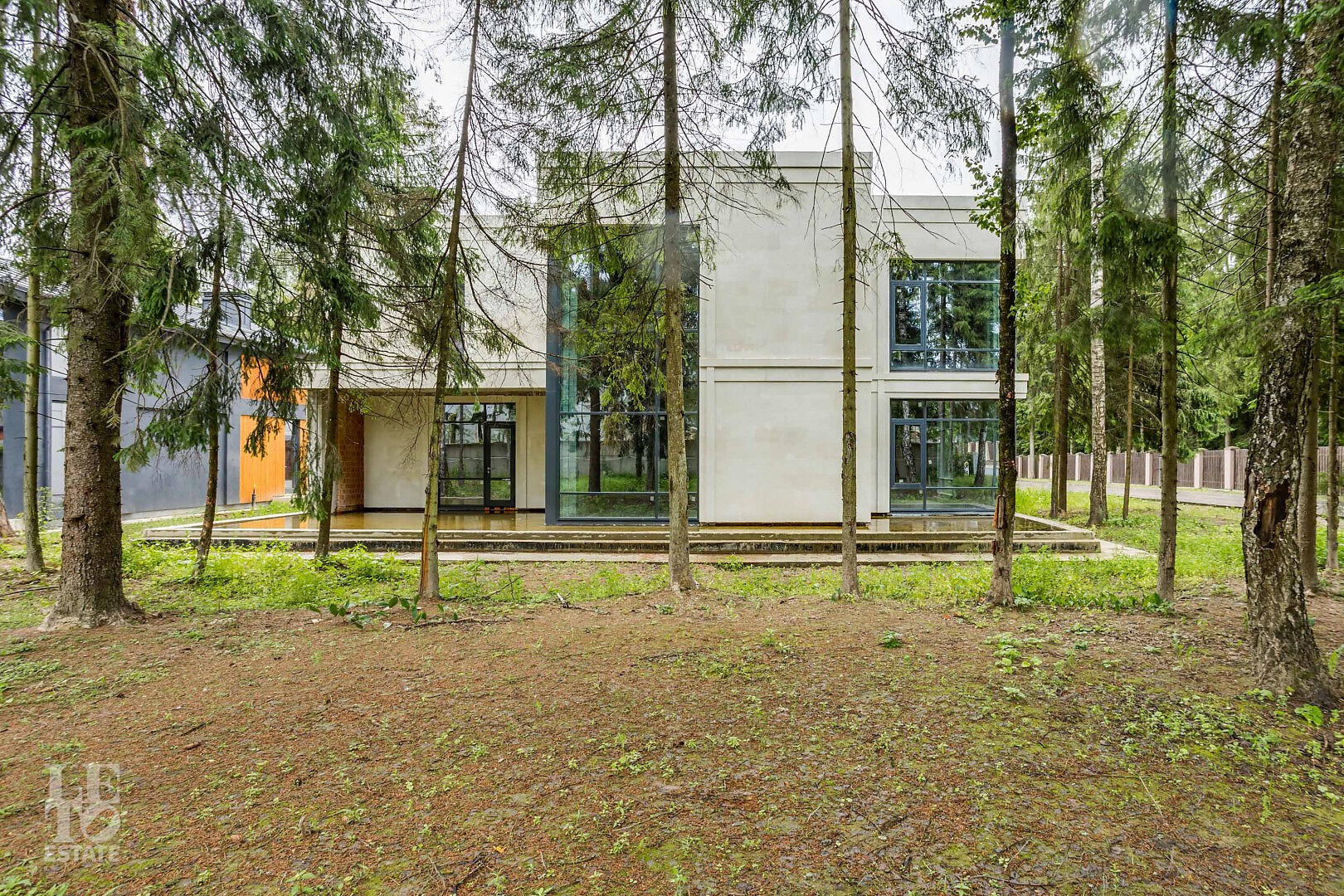 Дом расположен на прилесном участке и представлен в черновой отделке с возможностью выбора пакета отделки "white box" или "под ключ". Панорамные окна интегрируют пространство дома в лесной массив, создавая единение с природой и неповторимые пейзажи всех времен года.