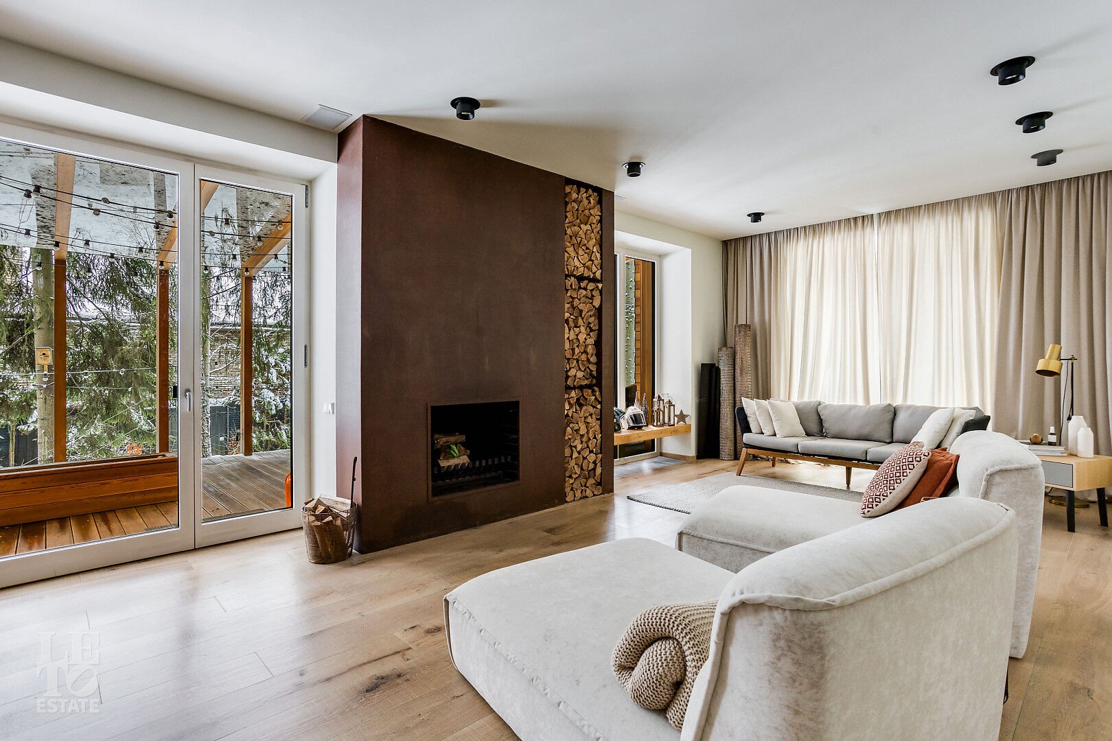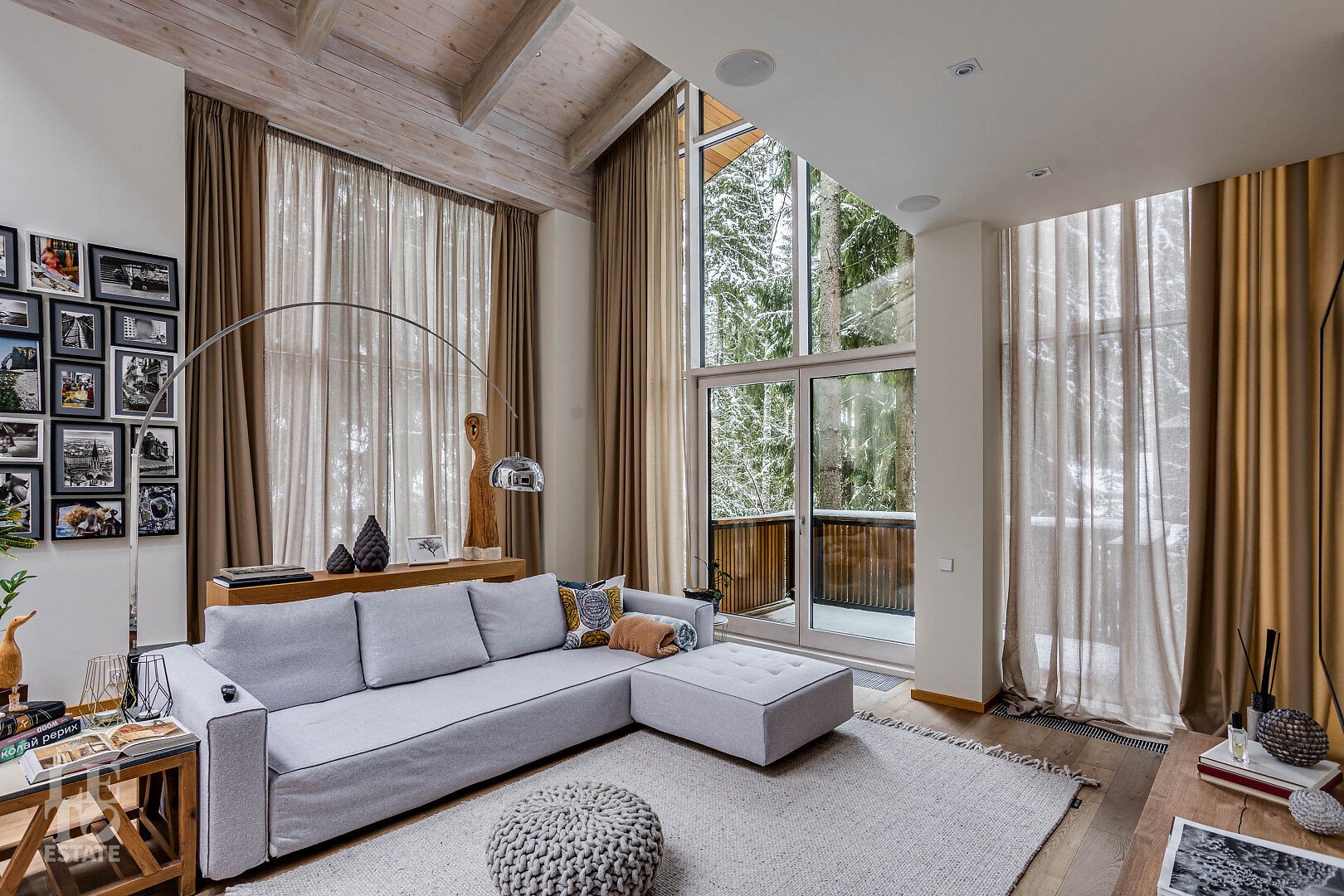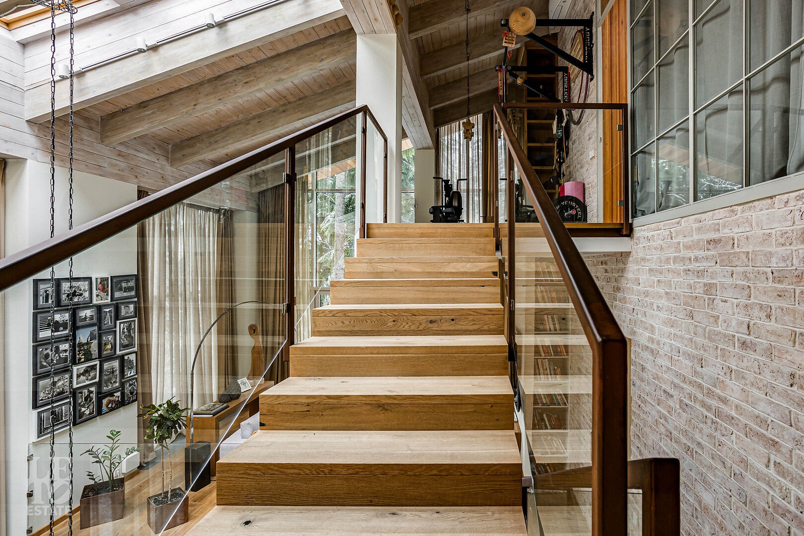 Первый этаж: холл, кухня-гостиная-столовая, две гостиные с каминами, гостиная со вторым светом, мастер-спальня с камином, гардеробной и ванной комнатой, спа-комната, библиотека, спортивный зал.
