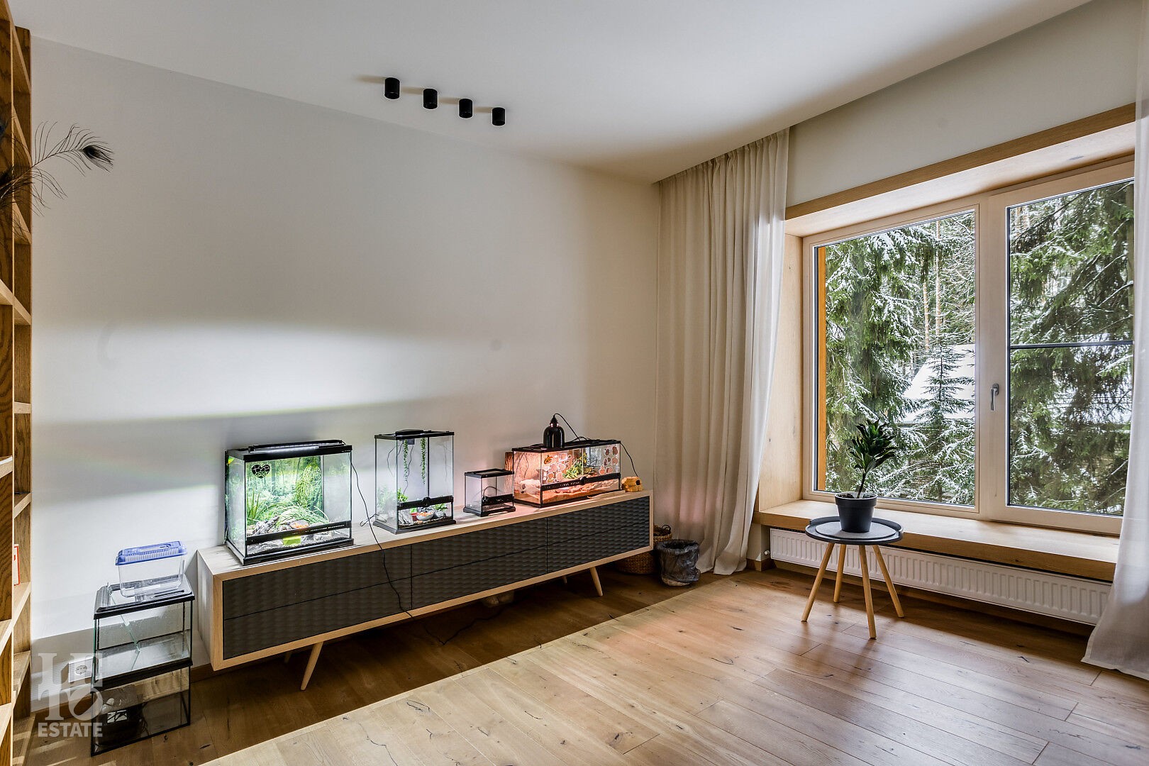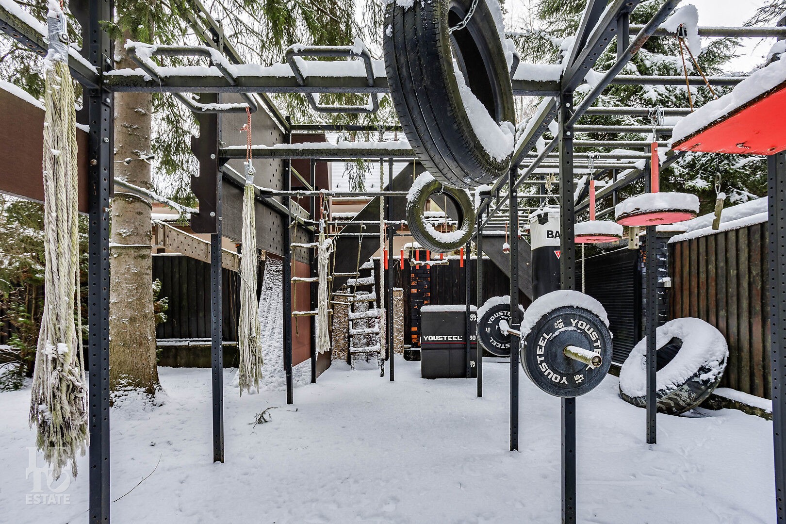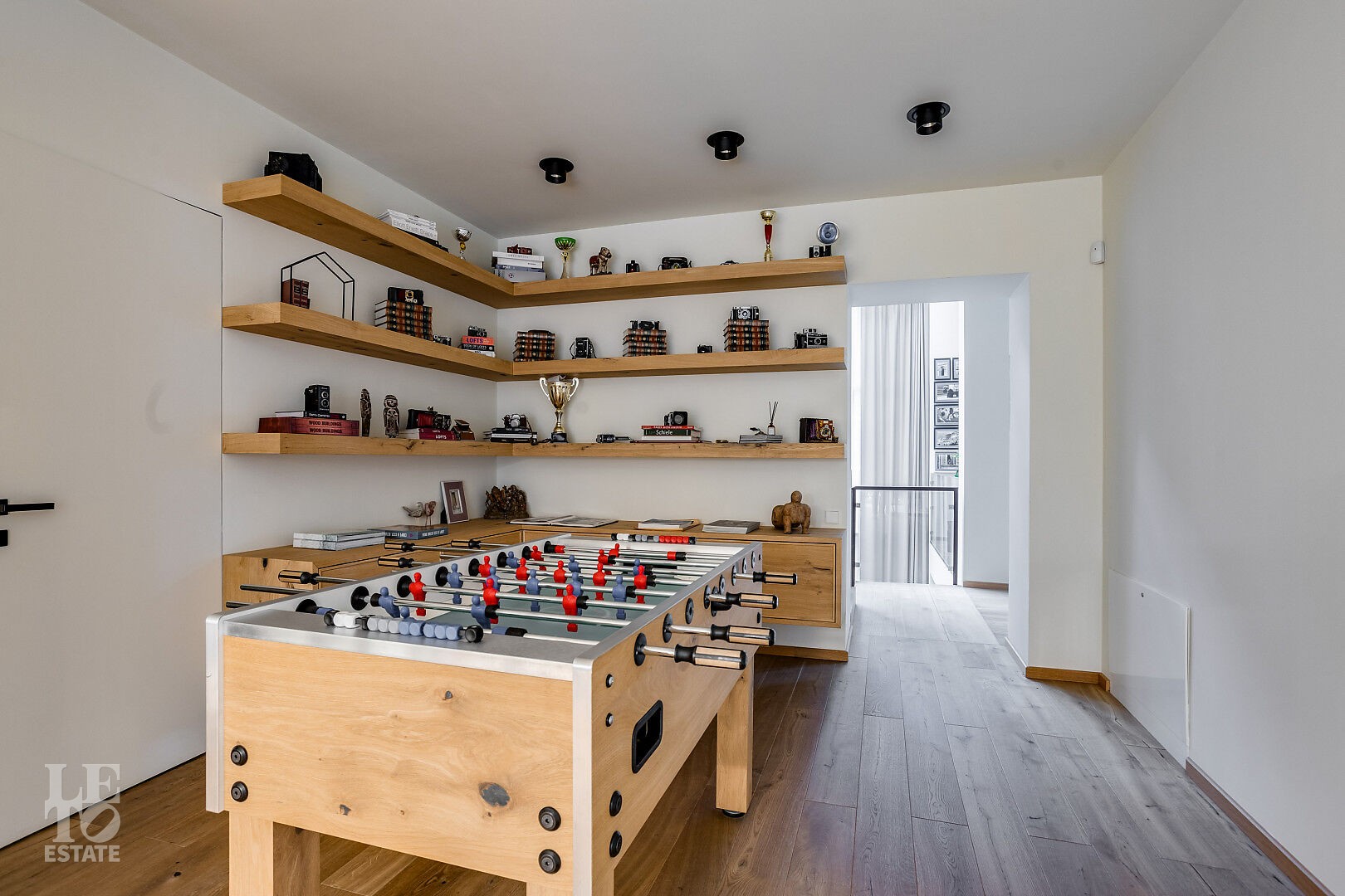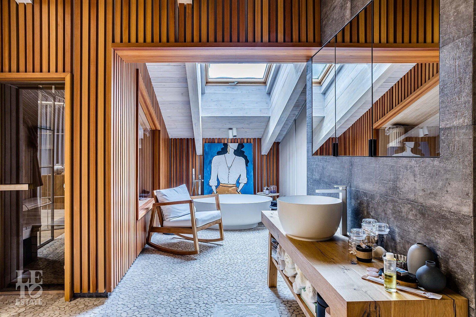 Первый этаж: холл, кухня-гостиная-столовая, две гостиные с каминами, гостиная со вторым светом, мастер-спальня с камином, гардеробной и ванной комнатой, спа-комната, библиотека, спортивный зал.