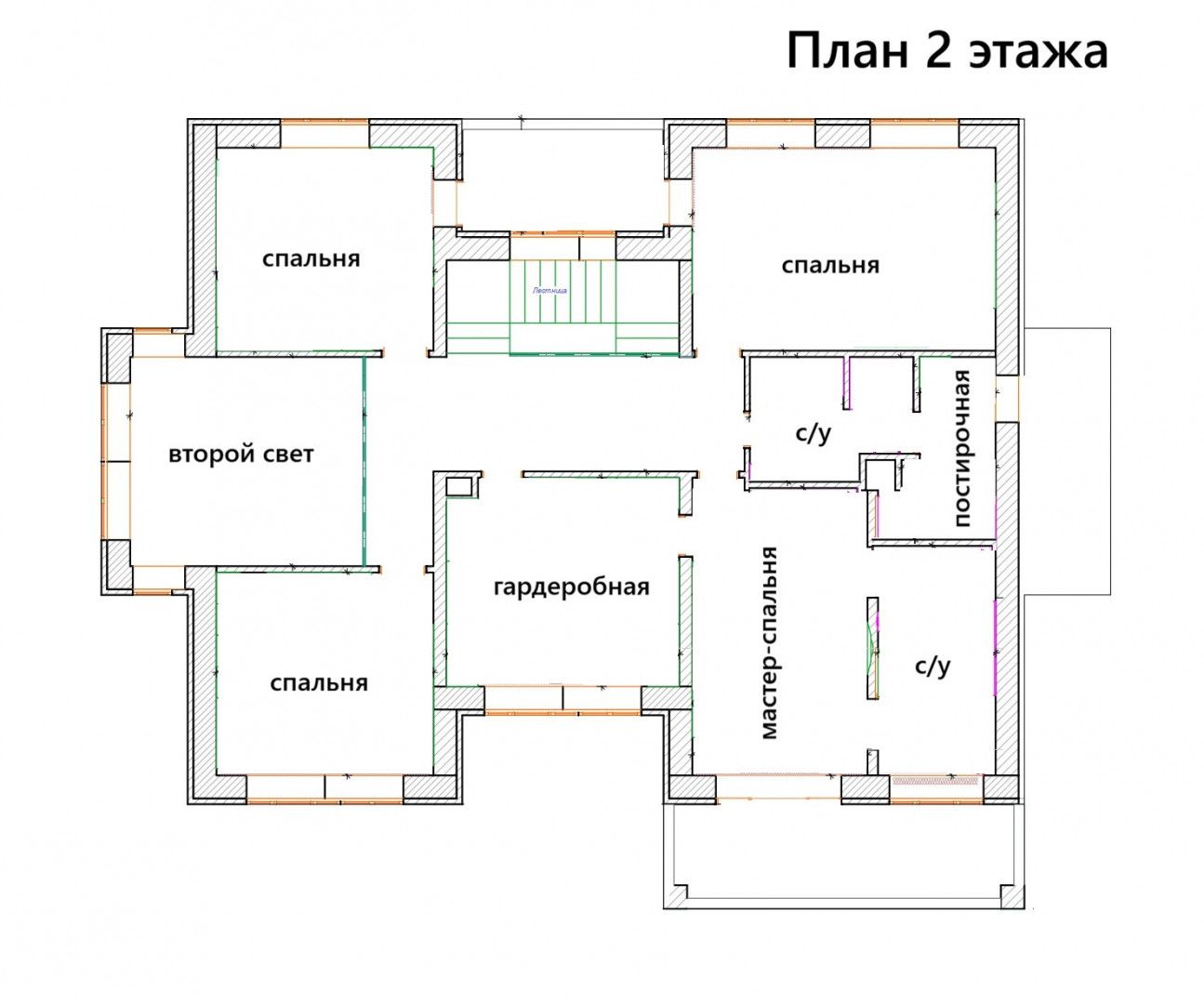 Второй этаж - спальня, санузел с постирочной, мастер-спальня с индивидуальным санузлом, гардеробная, спальня, второй свет, спальня, балкон.