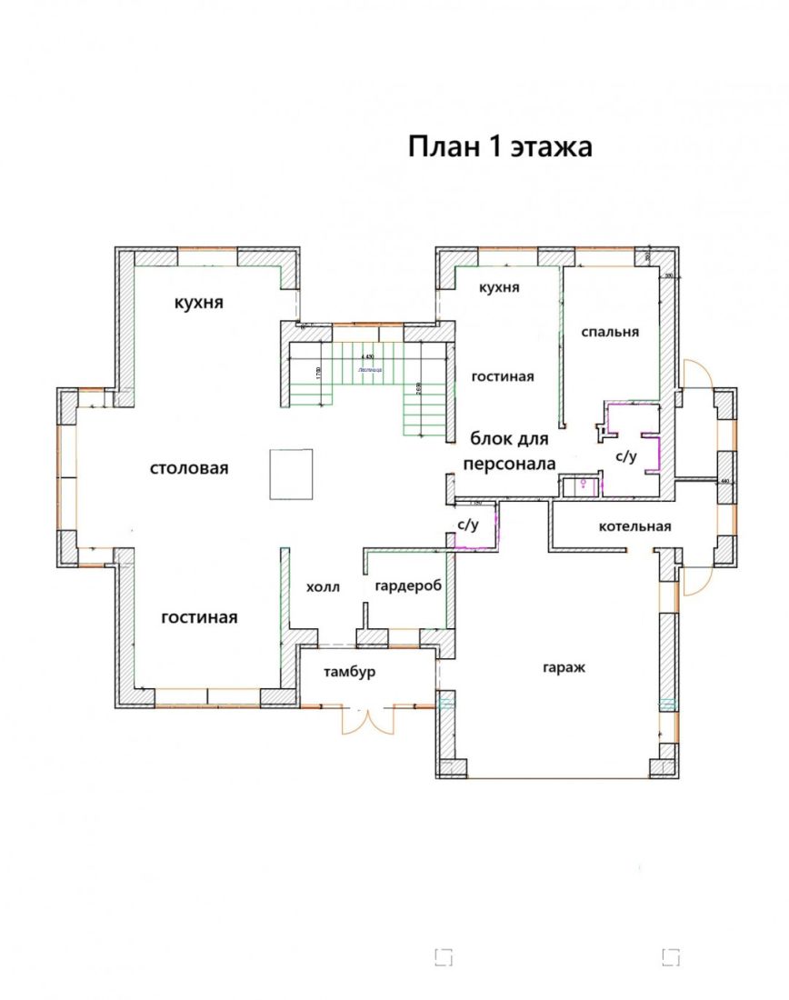Первый этаж – тамбур, холл, гардероб, гостиная, кухня-столовая, блок для персонала (кухня, спальня, гостиная, санузел), гараж, котельная, гостевой санузел;