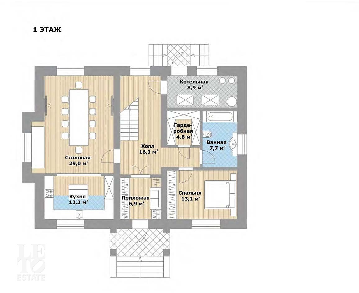 Первый этаж: прихожая, холл, кухня, столовая, спальня, ванная, гардеробная, котельная.