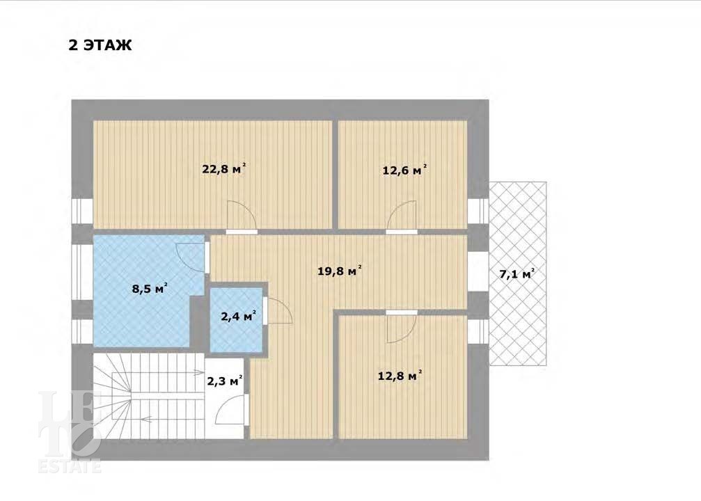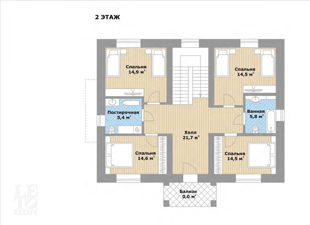 Второй этаж: холл, четыре спальни, постирочная, ванная. балкон.