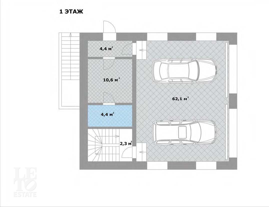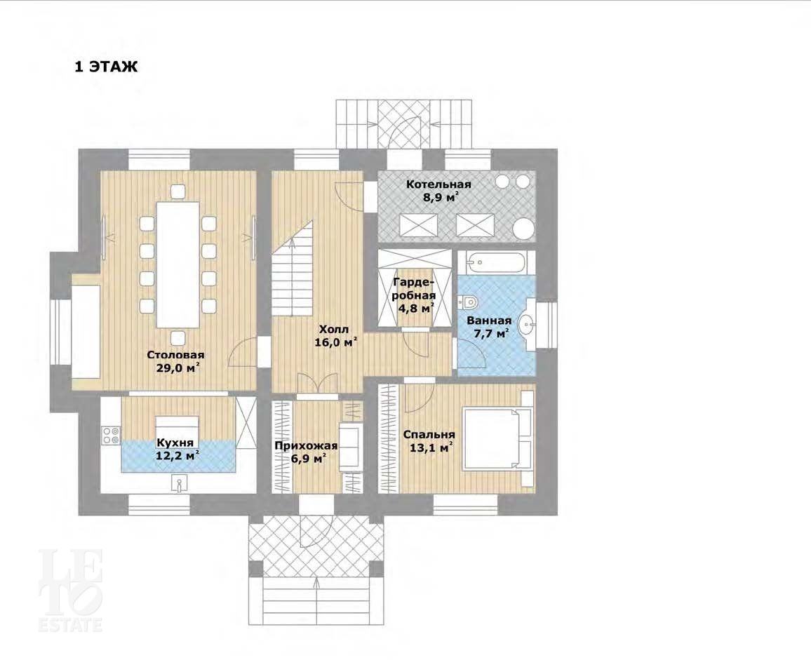 Первый этаж: прихожая, холл, кухня, столовая, спальня, ванная, гардеробная, котельная;