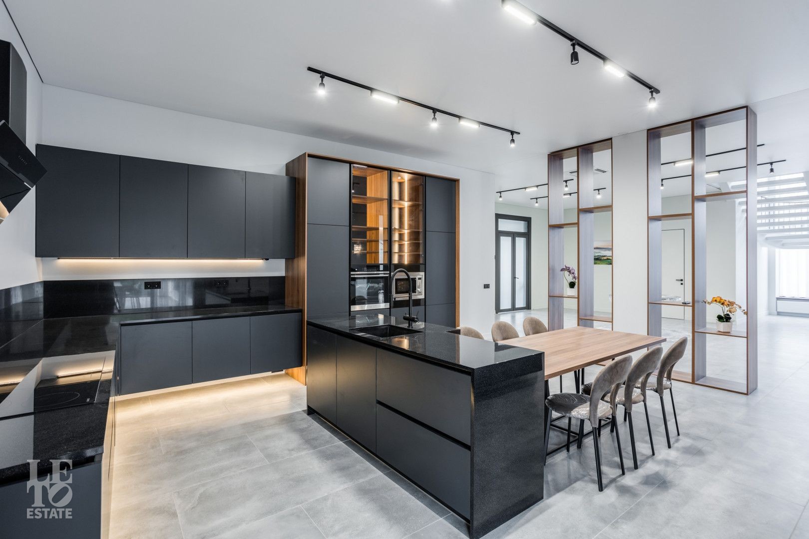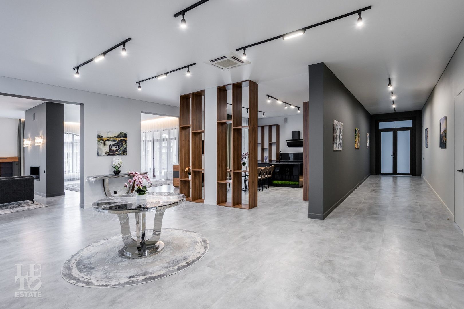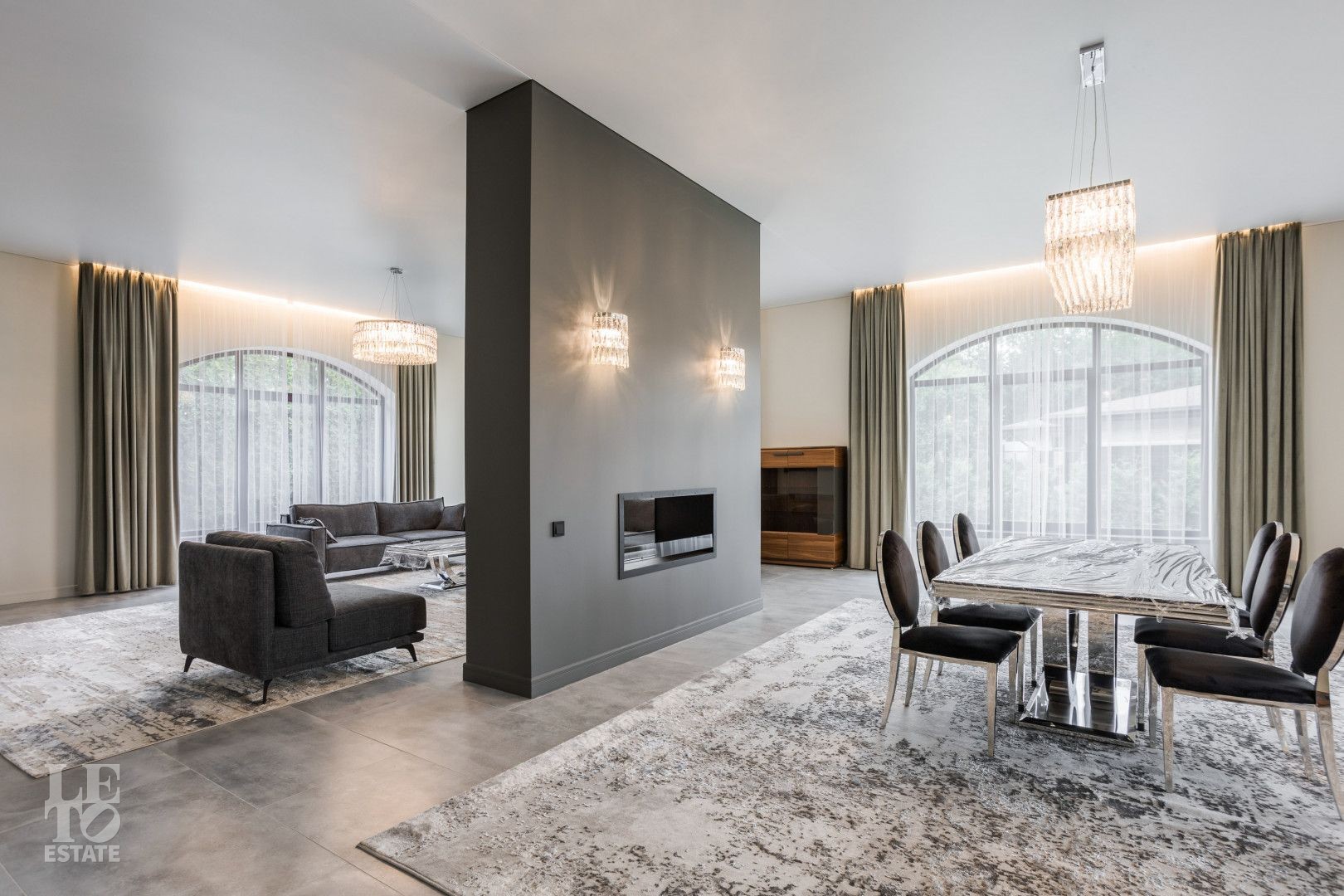 Первый этаж - холл, гостиная с камином, столовая, открытая кухня, выход на террасу с зоной барбекю, кабинет, гостевая спальня, бассейн, сауна с зоной отдыха и тренажёрным залом, санузел.