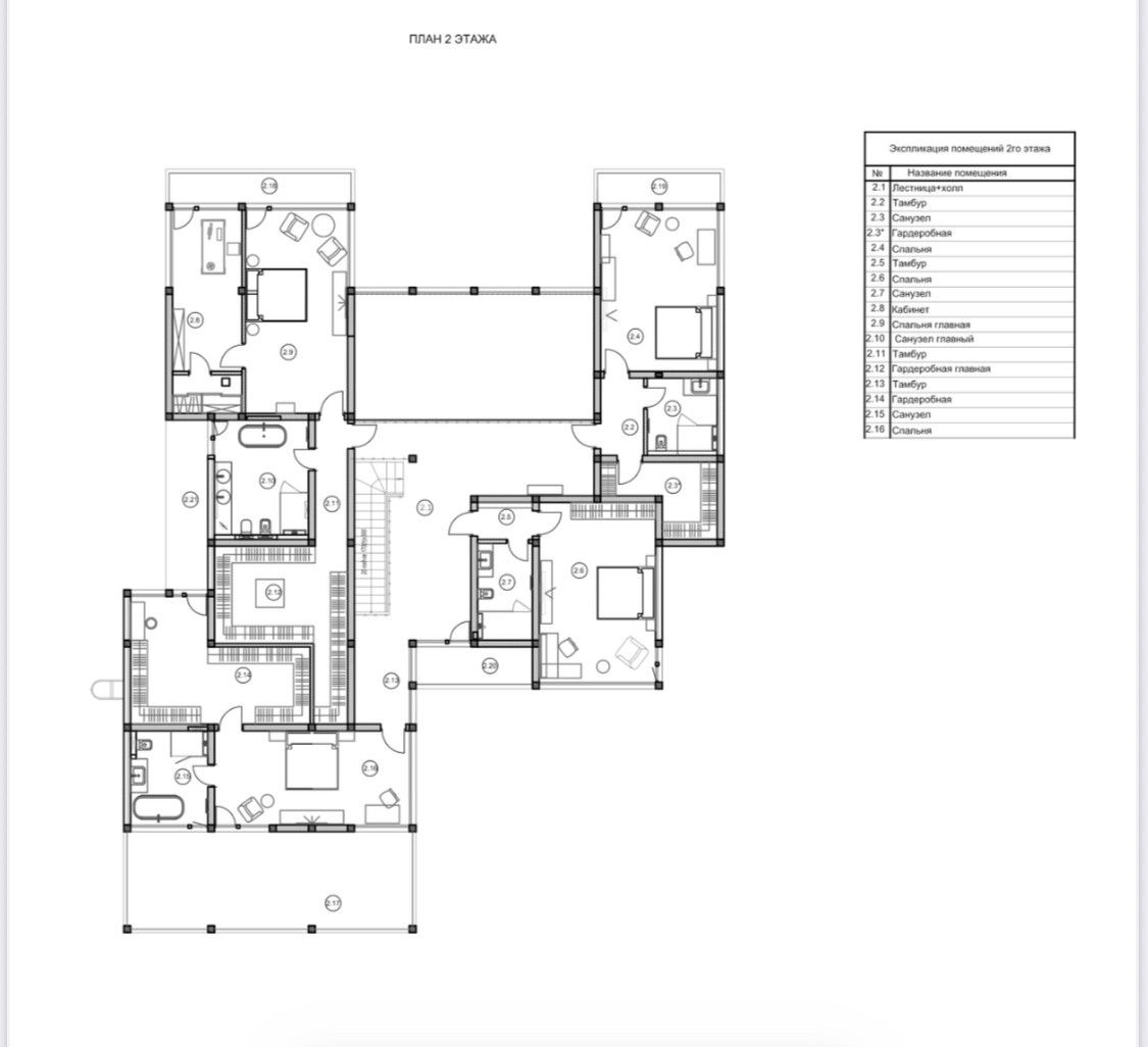 Второй этаж: мастер-спальня c ванной комнатой, гардеробной, кабинетом, спальня с санузлом и гардеробной, спальня с санузлом и гардеробной, спальня с санузлом и гардеробной.