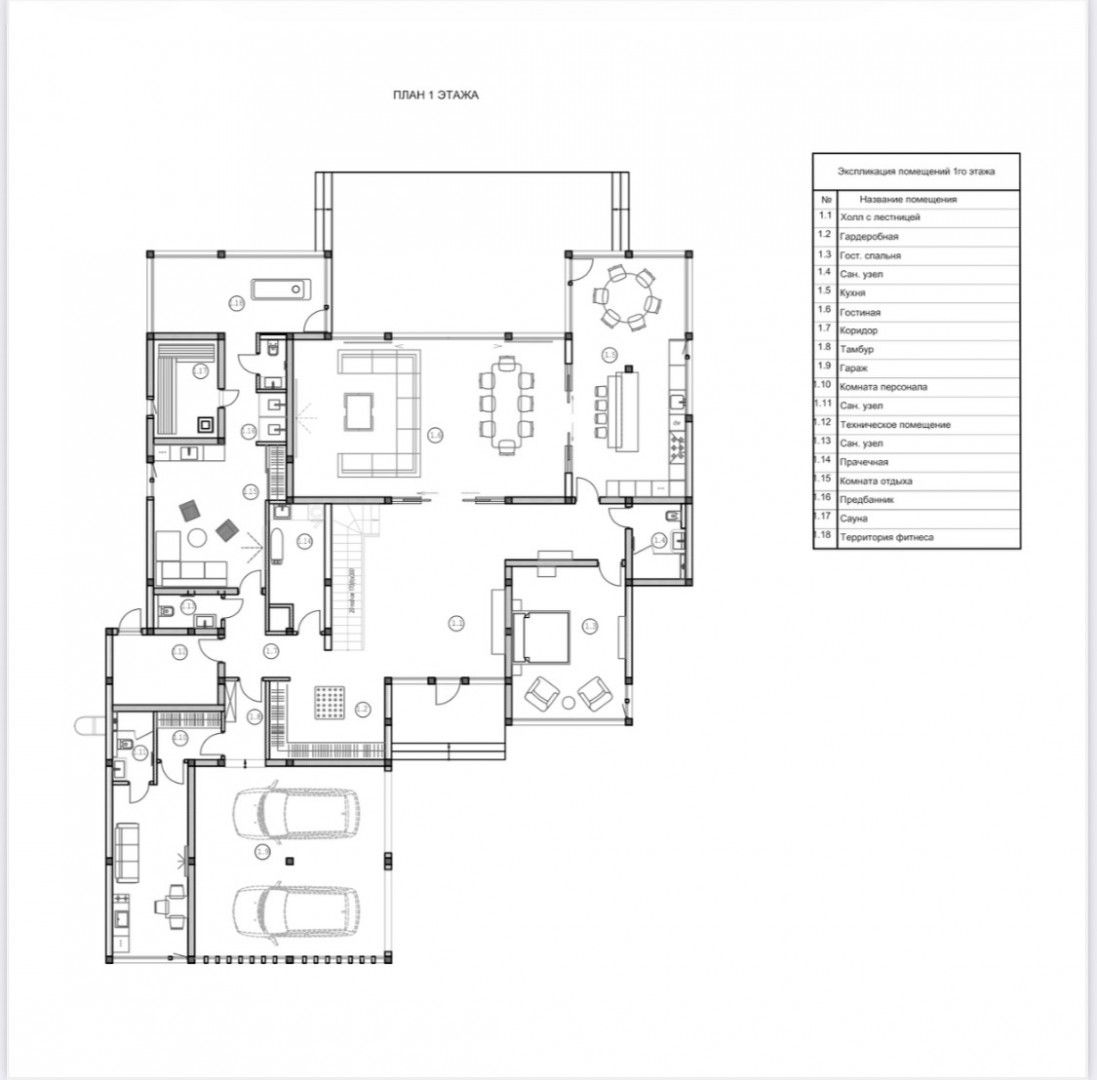 Первый этаж: гостиная с выходом на террасу, кухня-столовая, гостевая спальня, санузел, гардеробная, спа-зона, душевая, санузел, комната отдыха, территория фитнеса, прачечная, техническое помещение, блок персонала, гараж на два автомобиля;