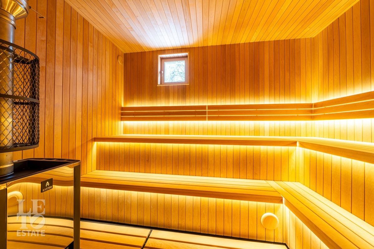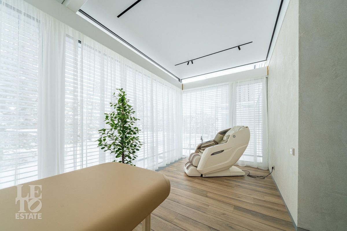 На первом этаже располагается спа-зона: финская сауна с дровяной печью Kastor, санузел с двумя душевыми, массажная комната, fresh бар, зона отдыха с выходом на улицу.