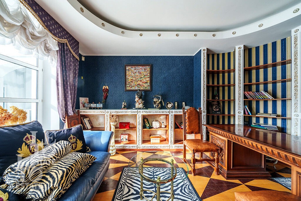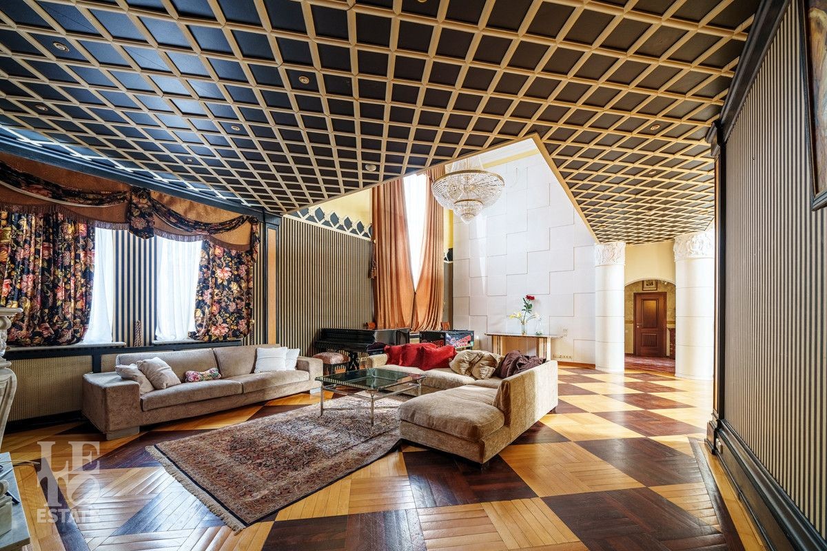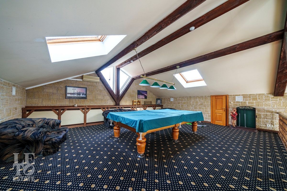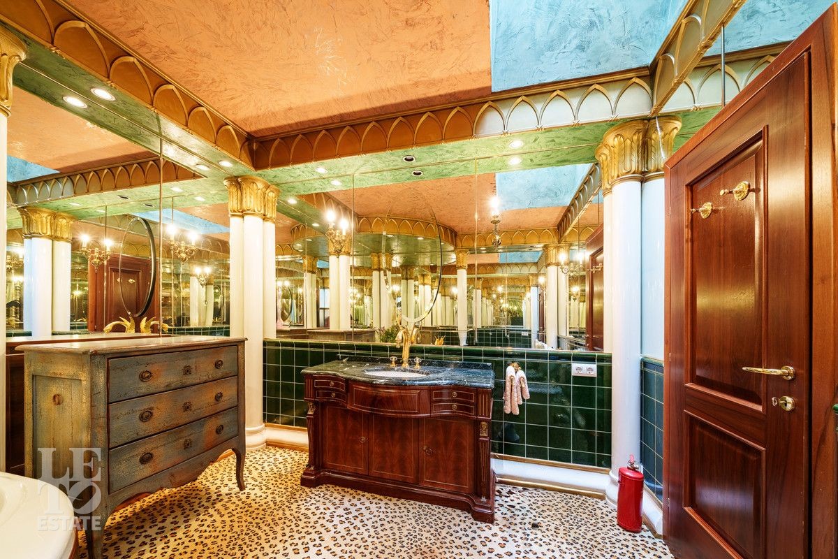 Внутри дома сделан ремонт с использованием самых высококачественных материалов: лестница, перила, двери и полы выполнены из массива дуба, стены гостиной отделаны мрамором, а на полу выложен двуцветный паркет из массива дуба, в зоне отдыха расположена барная стойка, выполненная из оникса.