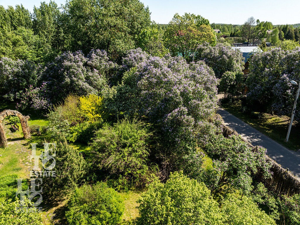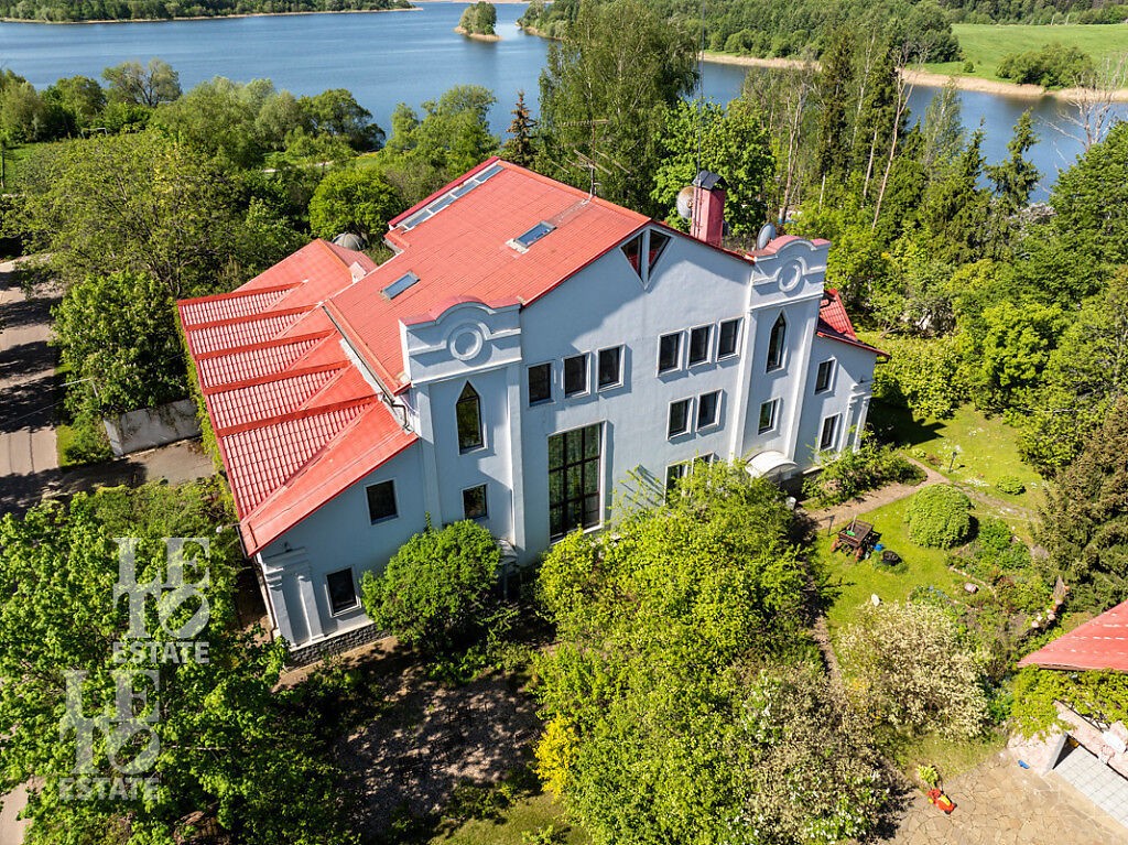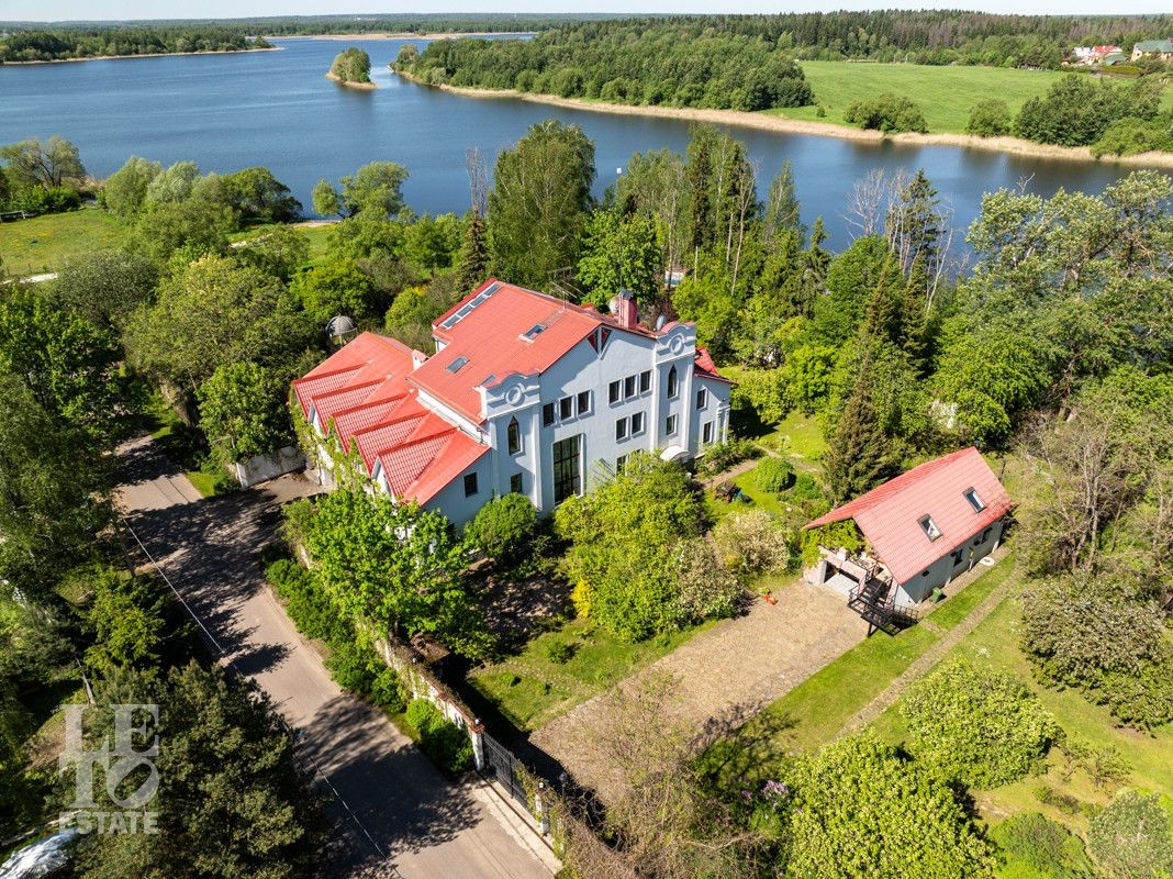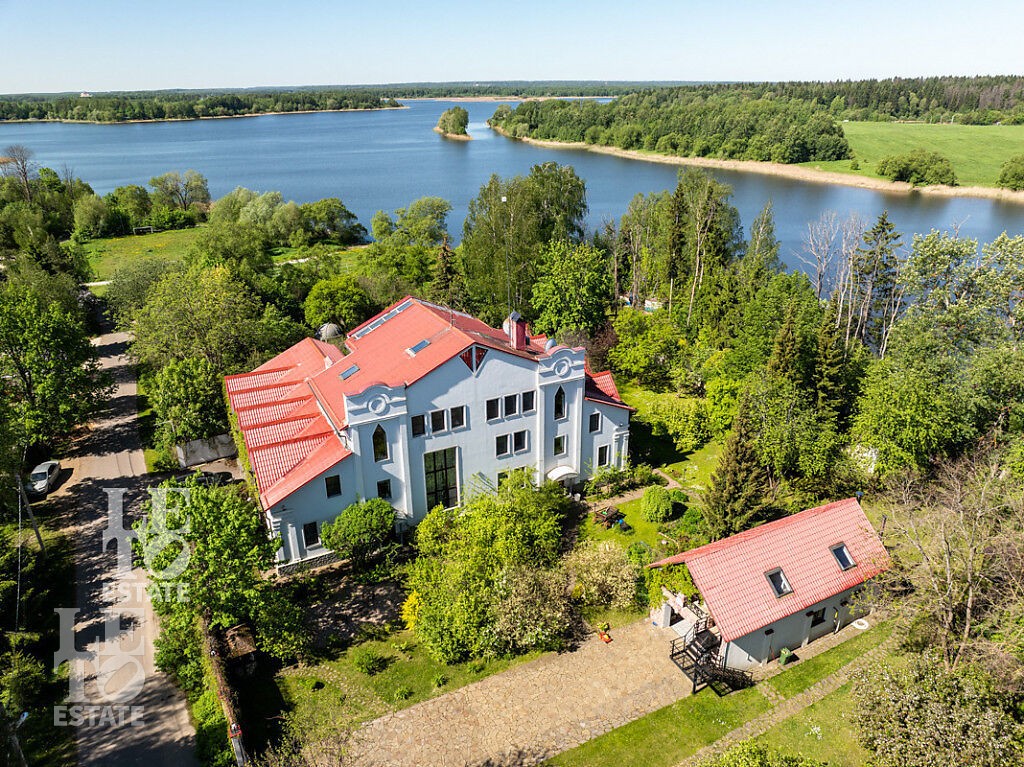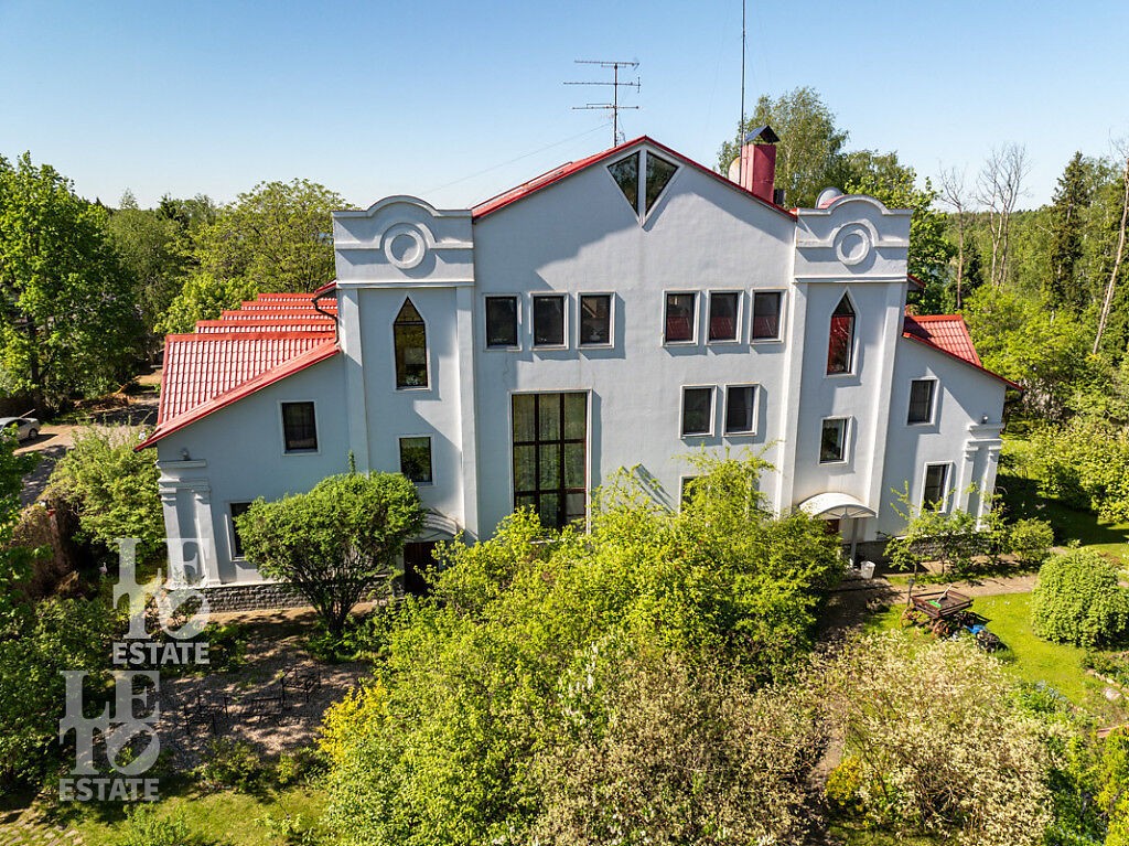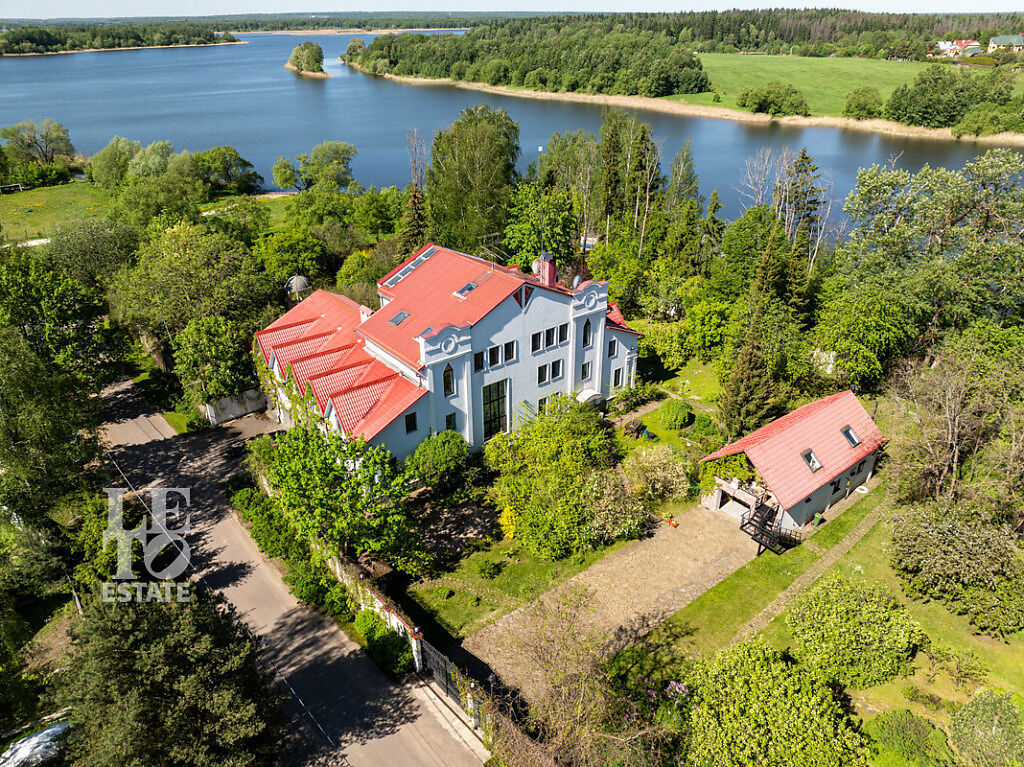 Участок правильной и ровной формы обособлено расположен прямо на берегу Истринского водохранилища со своим выходом к воде, пирсом и береговой линией длиной 80 метров. На территории участка сделан ландшафтрый дизайн, растут многолетние сосны и высажены уникальные растения, среди которых расположена ротонда. Также на участке находится спортивная и детская площадки и зона барбекю. Перед домом сделана большая площадка для парковки автомобилей, также расположен гараж на три машиноместа. На придомовой территории отдельно построен летний домик и располагается дом 80 кв.м. для персонала и охраны.