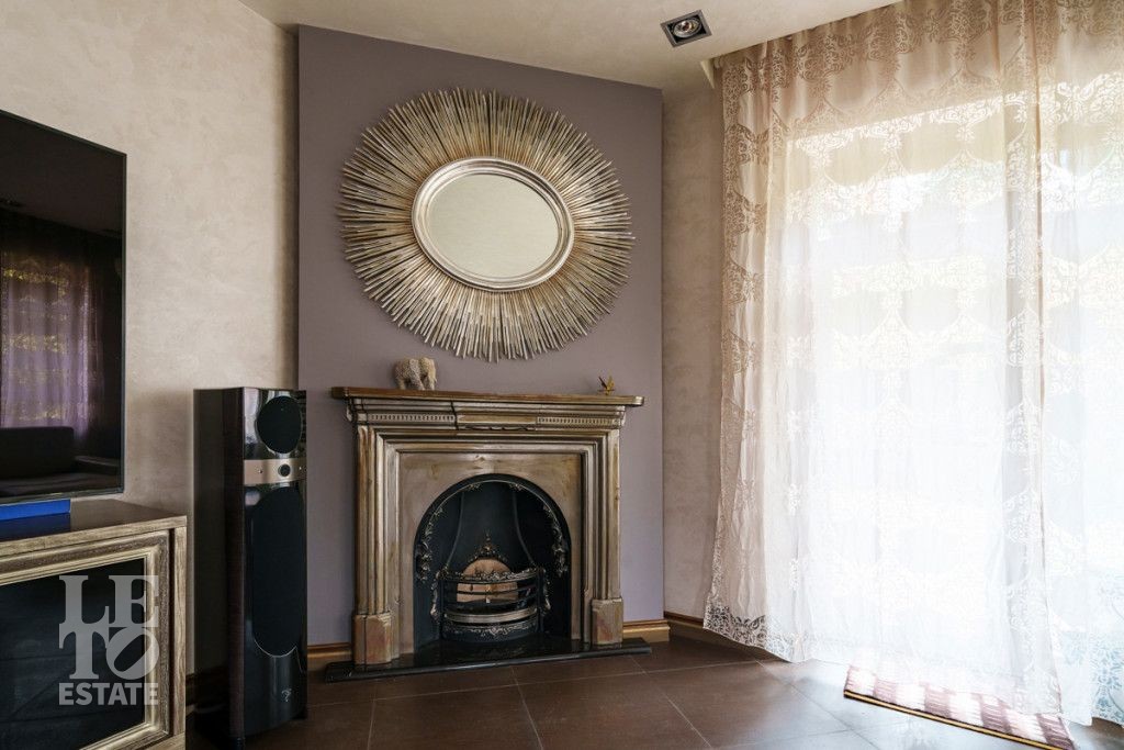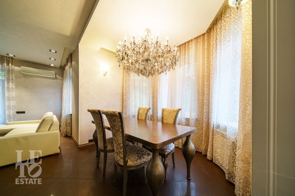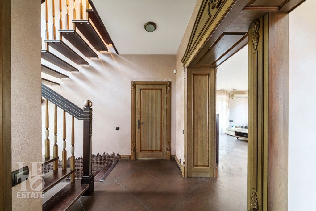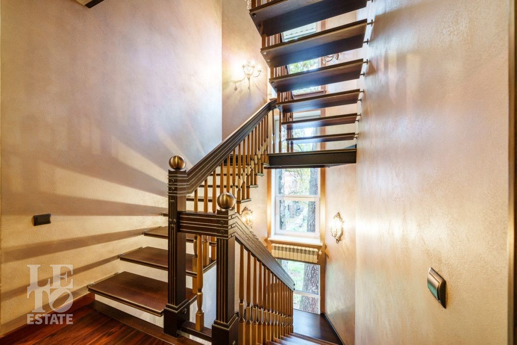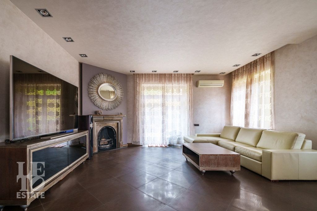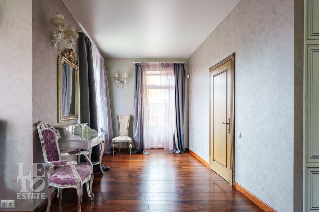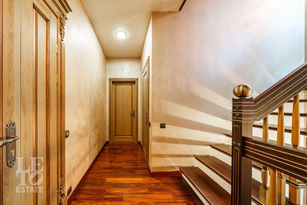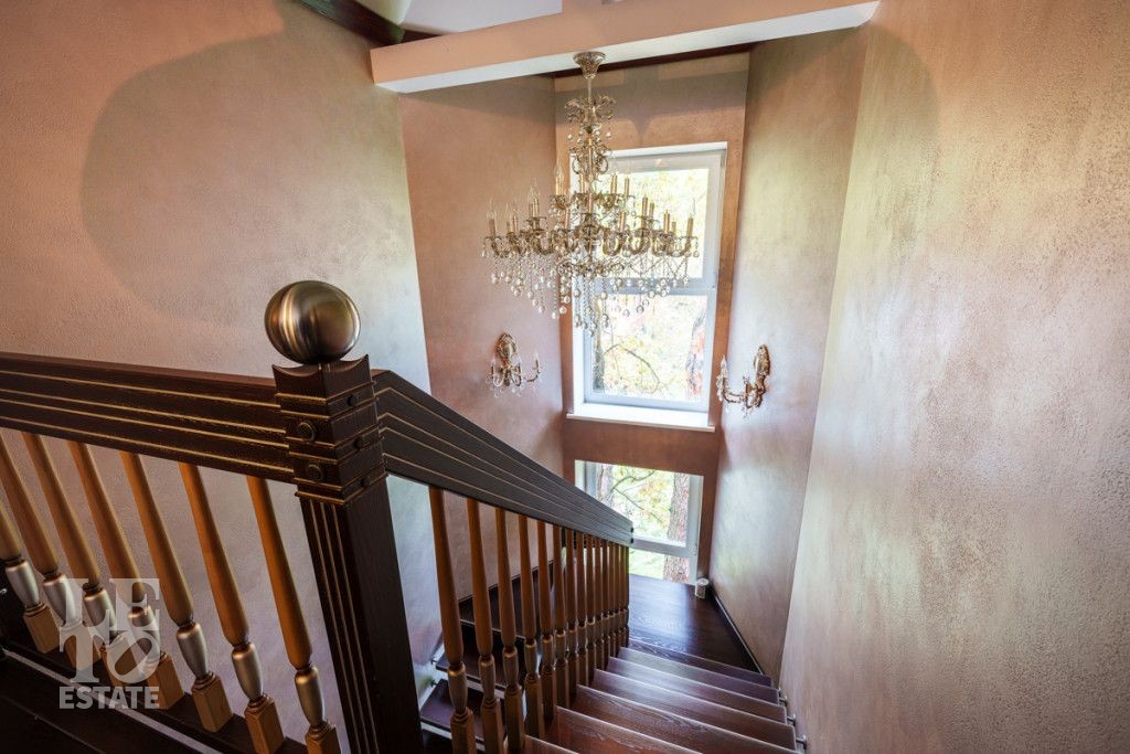 В доме выполнена дорогостоящая отделка: венецианская штукатурка, итальянская плитка, элементы мебели с золочением из сусального золота. На стенах прихожей и гостиной, расписанных вручную, изображены европейские городские пейзажи. Вся мебель итальянская, выполнена на заказ. Установлена техника ведущих немецких брендов Neff, Miele, сантехника Grohe. Чугунный английский камин в гостиной в стиле XVIII века. Великолепные люстры из немецкого и египетского горного хрусталя не просто дополняют интерьер, но и создают чувство завершенности дизайна. Лестница и двери изготовлены из дуба. Полы в кабинете и на втором этаже - из палисандра. На первом этаже, в местах, где плитка, разведены теплые полы. На каждом этаже установлено кондиционирование.