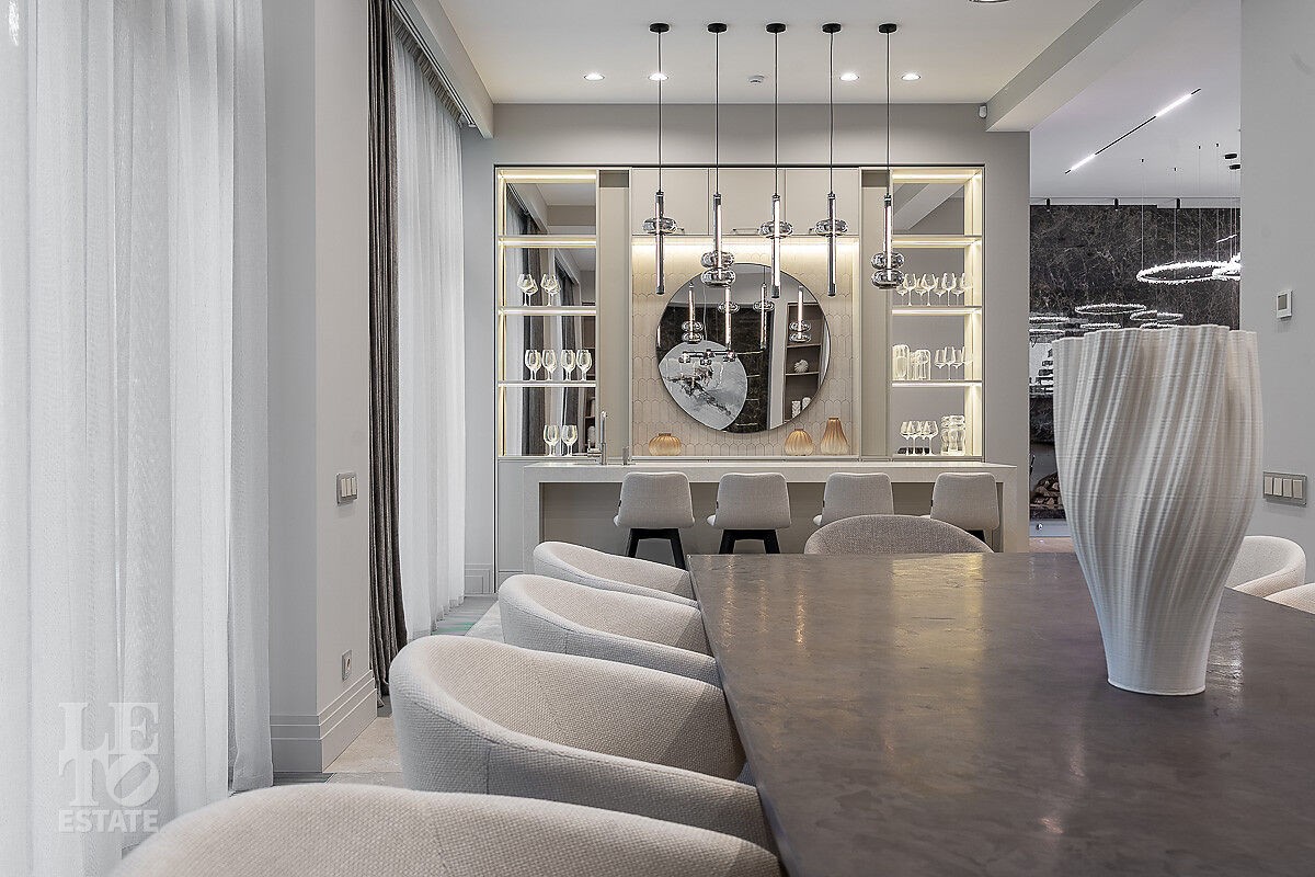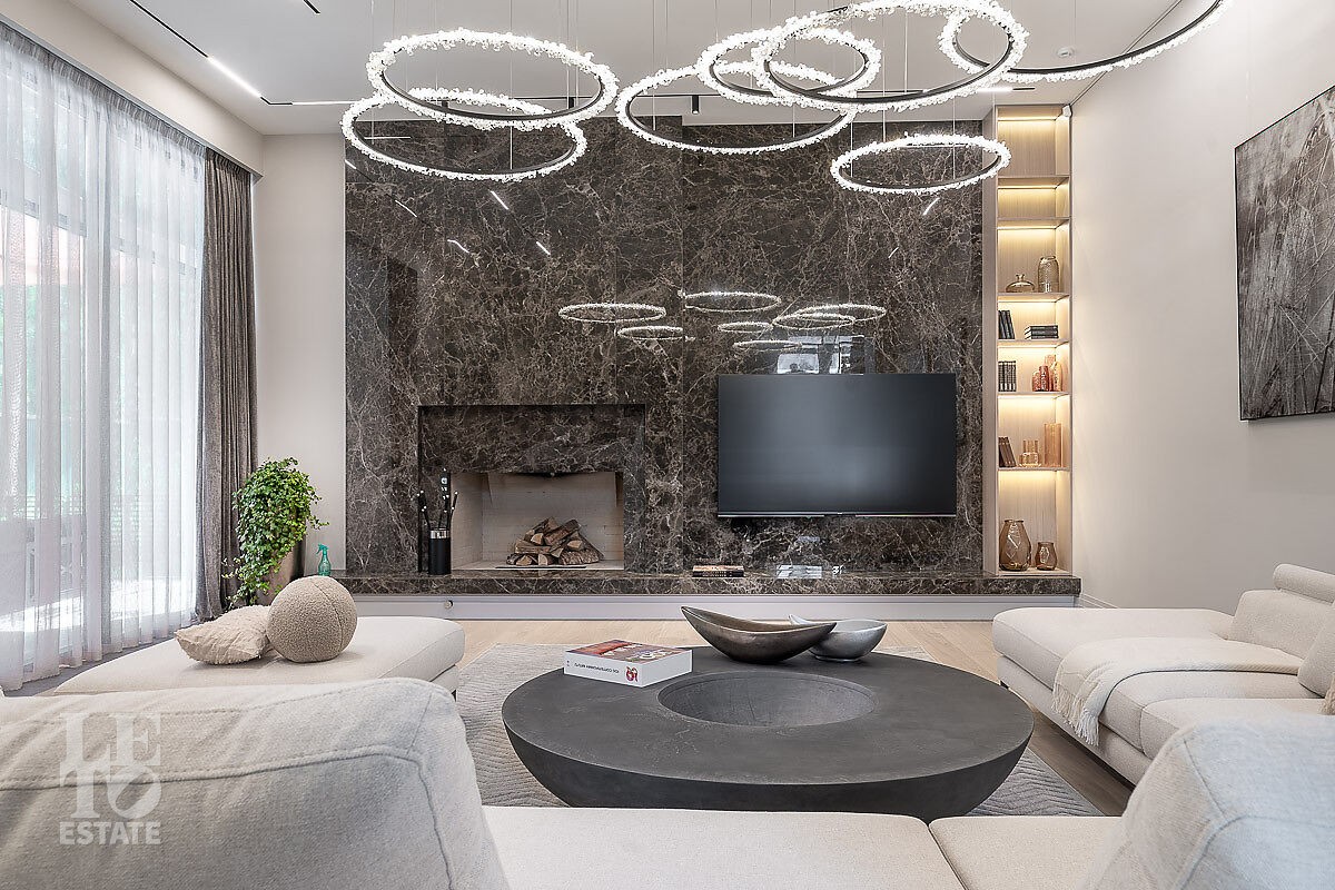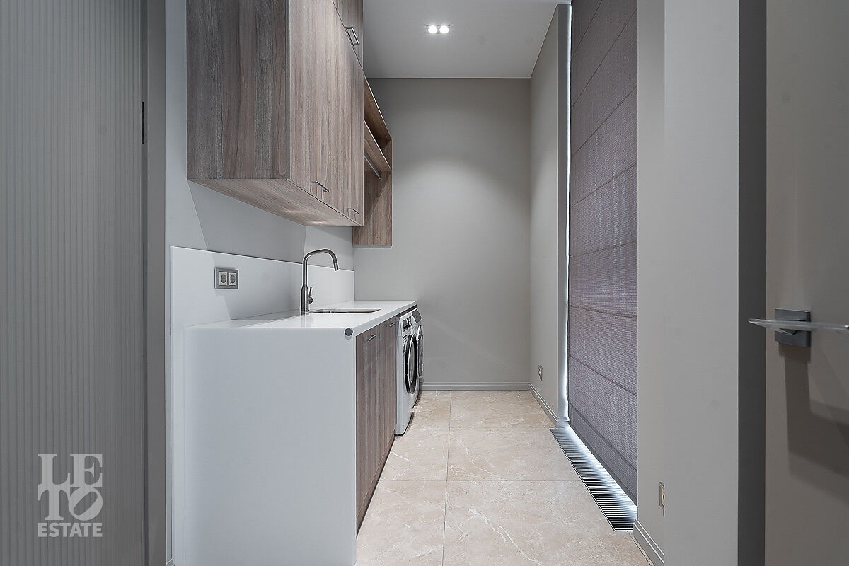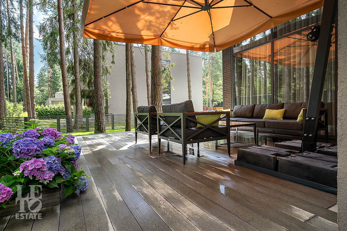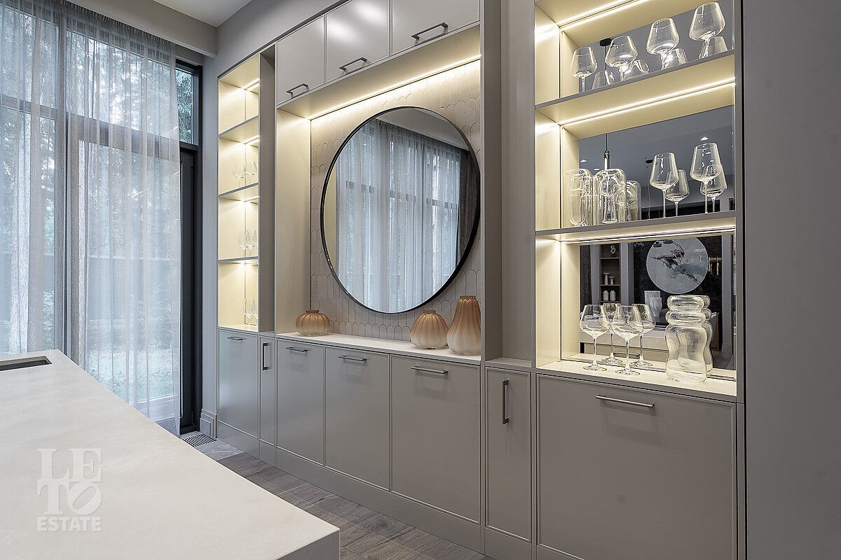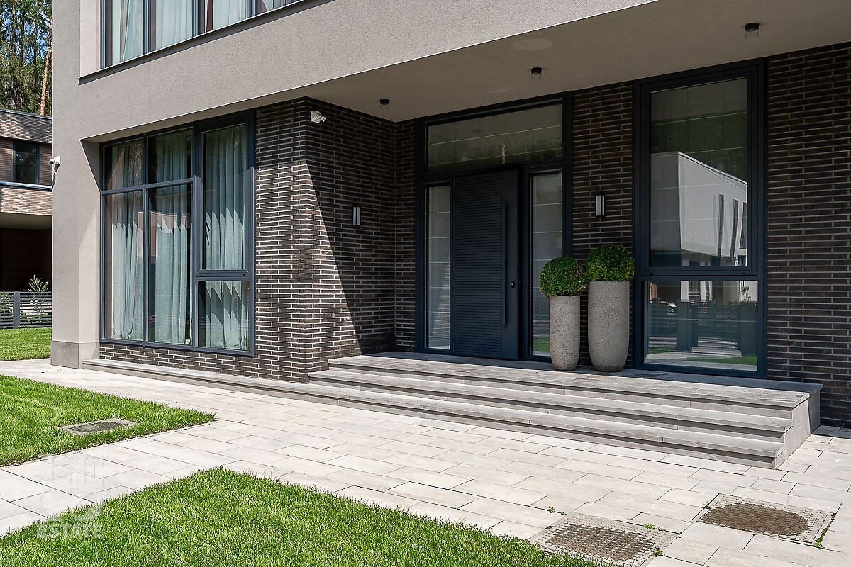 Высота потолков 3.5 метра, центральное кондиционирование. На участке выполнен ландшафтный дизайн, а на заднем дворе благоустроен естественный лесной ландшафт. При въезде дополнительно предусмотрен навес для 2-х автомобилей.
