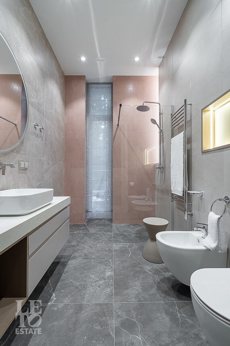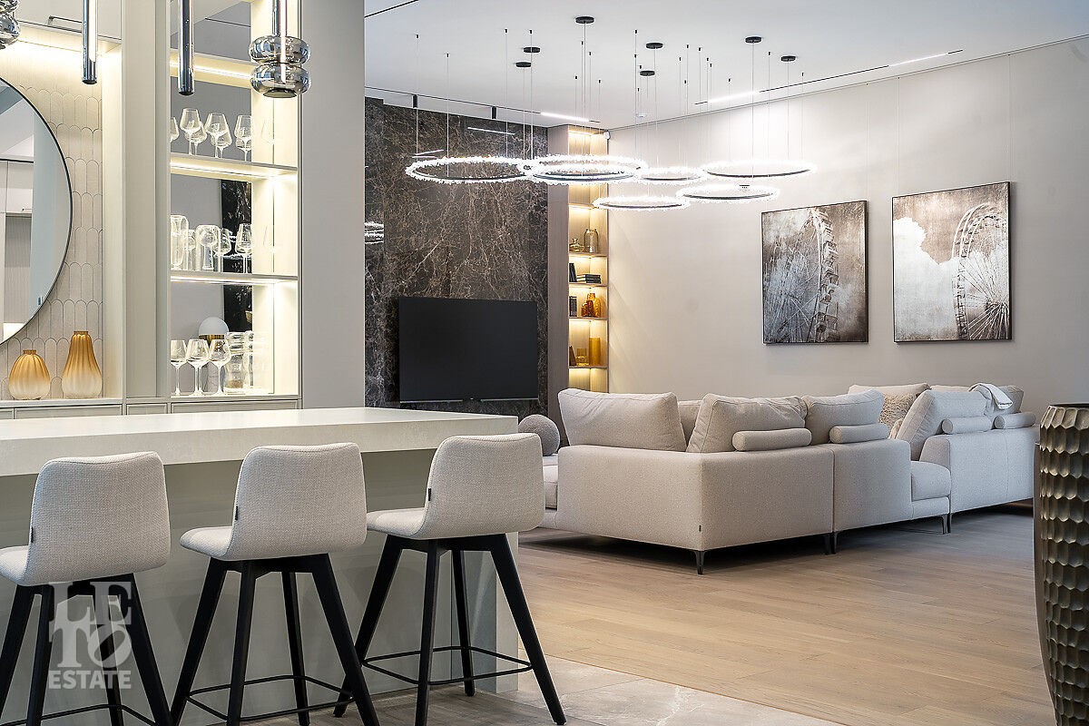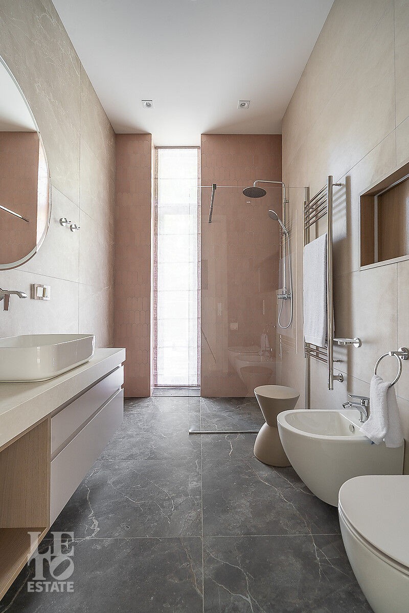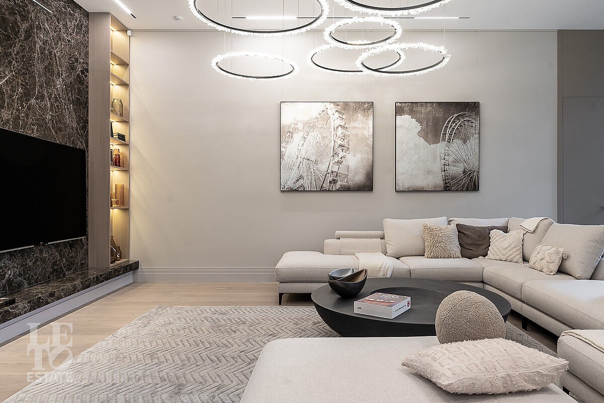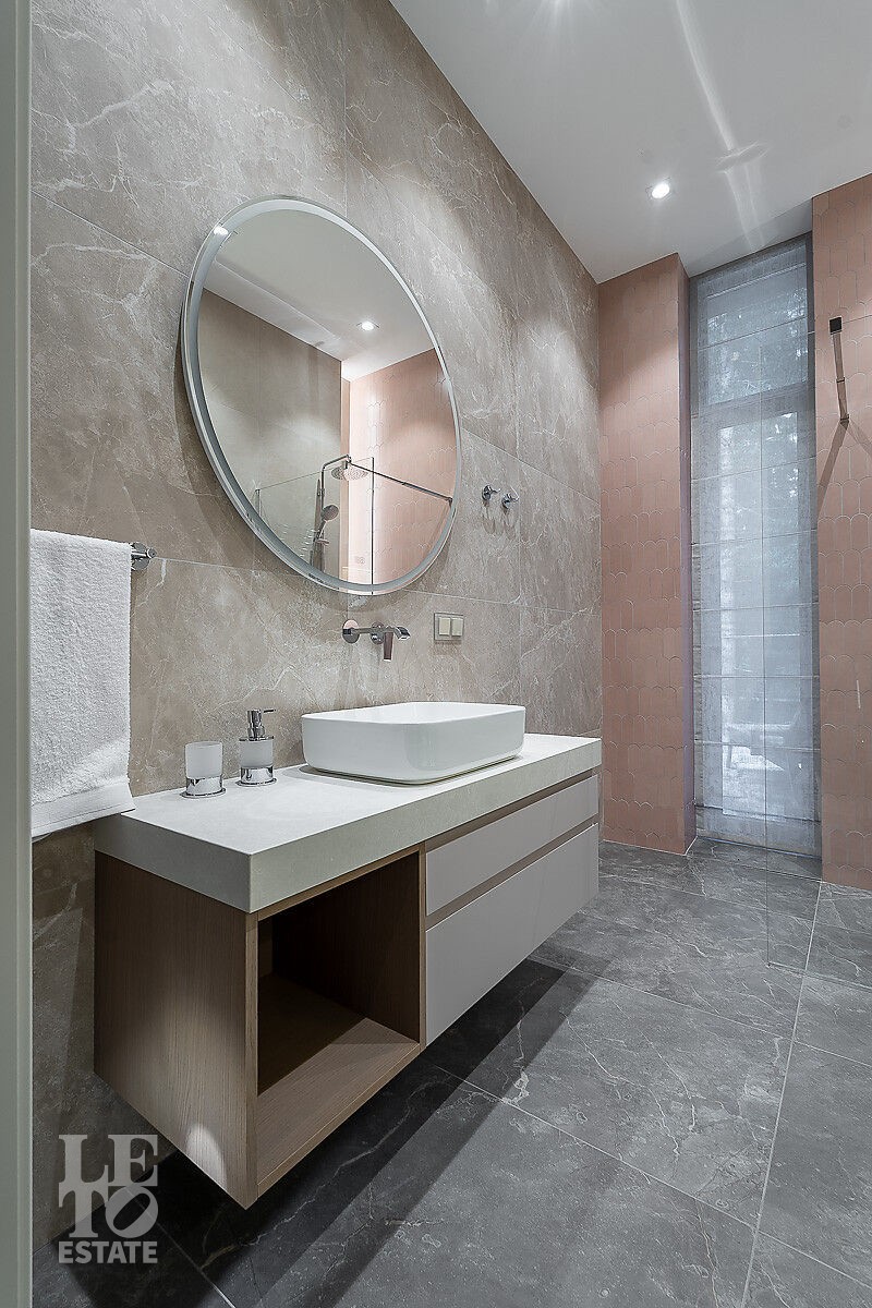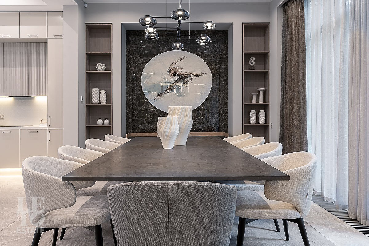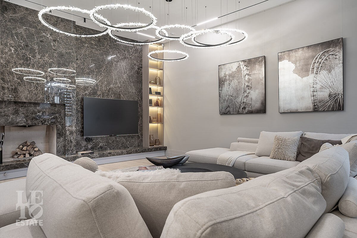 Высота потолков 3.5 метра, центральное кондиционирование. На участке выполнен ландшафтный дизайн, а на заднем дворе благоустроен естественный лесной ландшафт. При въезде дополнительно предусмотрен навес для 2-х автомобилей.