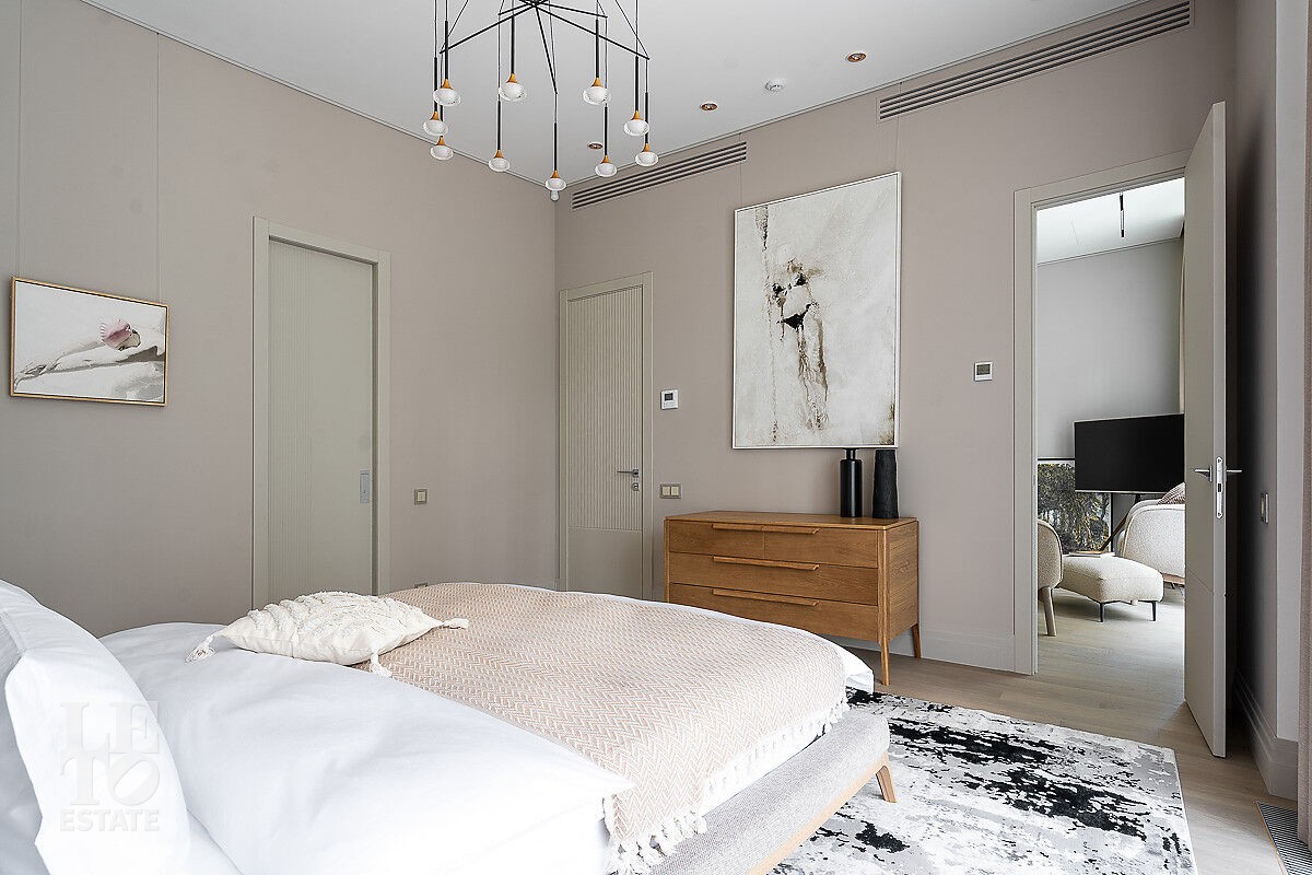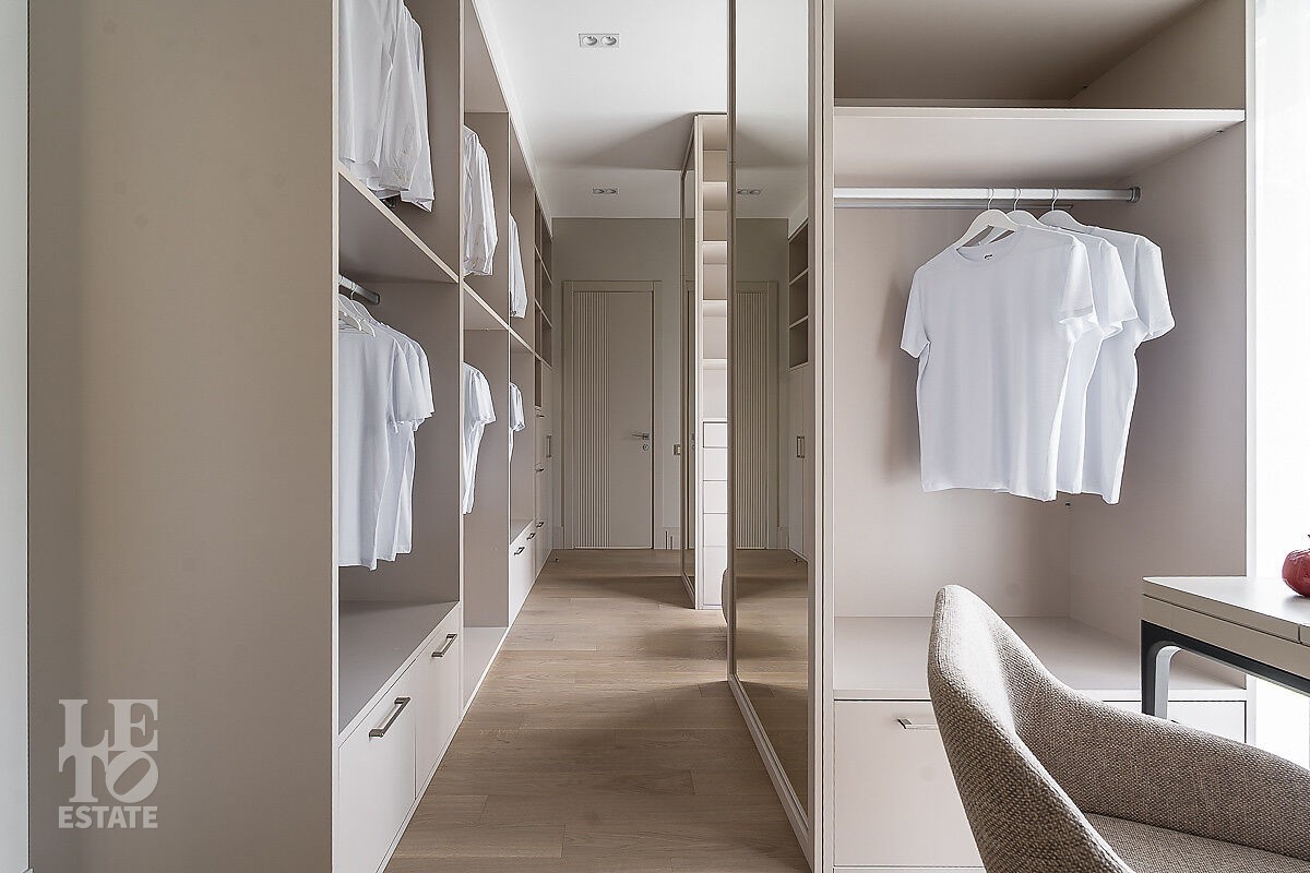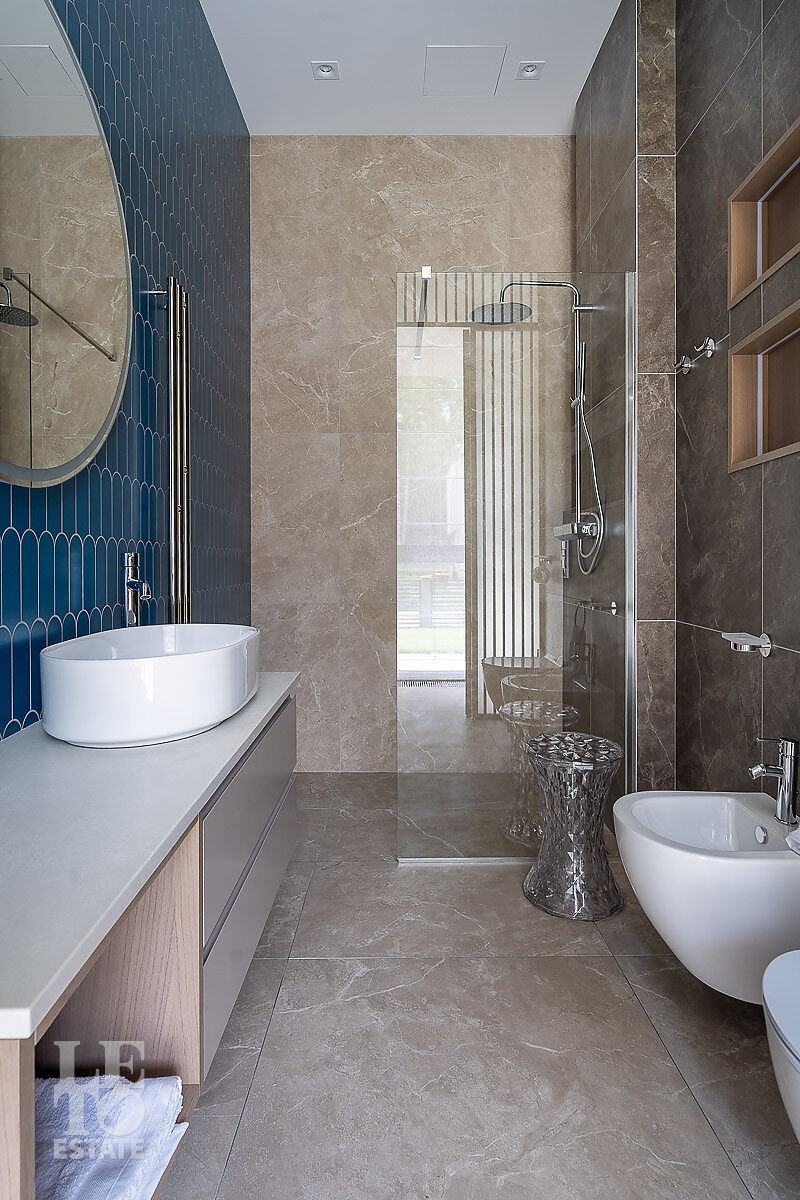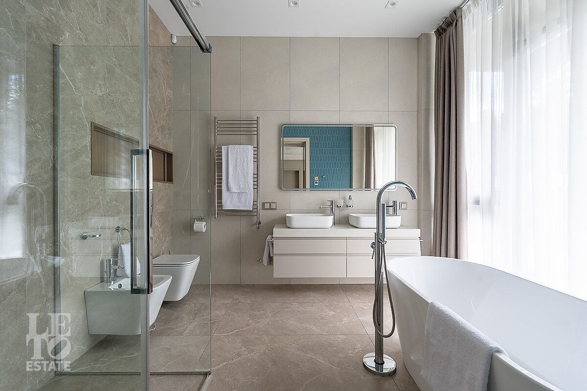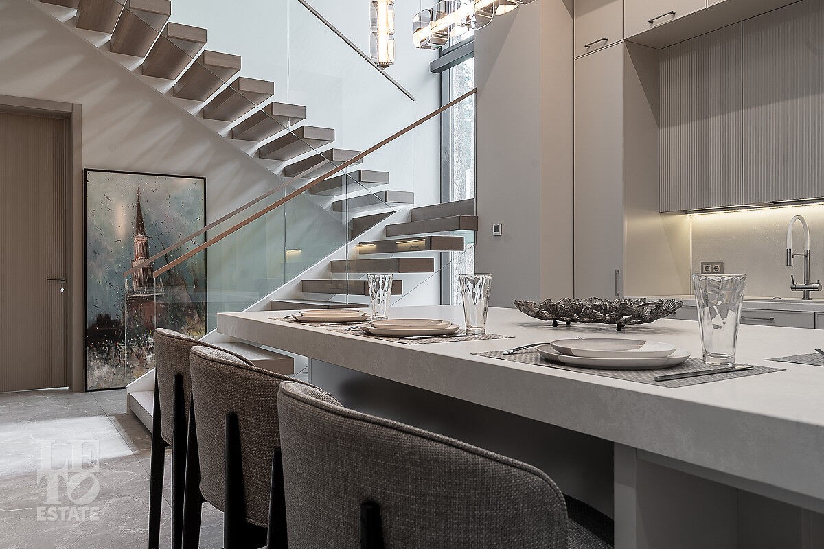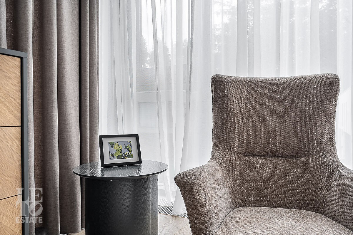 На 1-ом этаже размещены: гостиная с дровяным камином, столовая зона с баром и выходом на террасу, функциональная кухня с островом, а также гостевая спальня и постирочная. На 2-ом этаже размещены 3 мастер-блока спален со своими санузлами и гардеробными. Каждая спальня имеет свой выход на террасу или балкон.