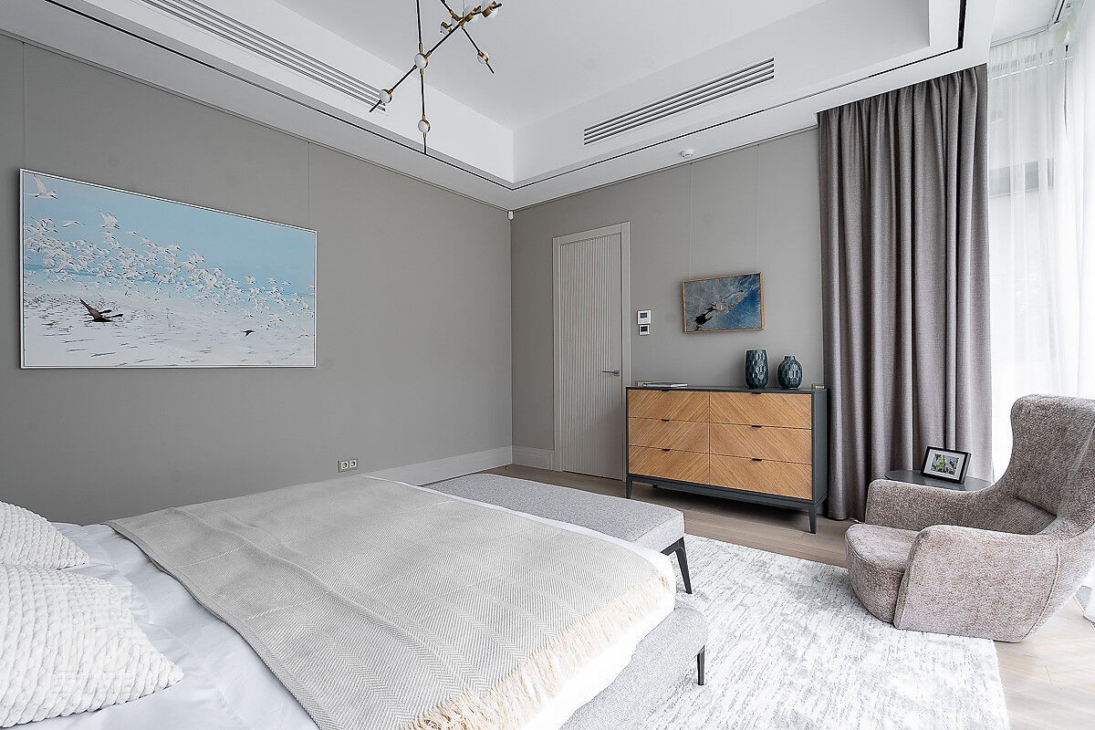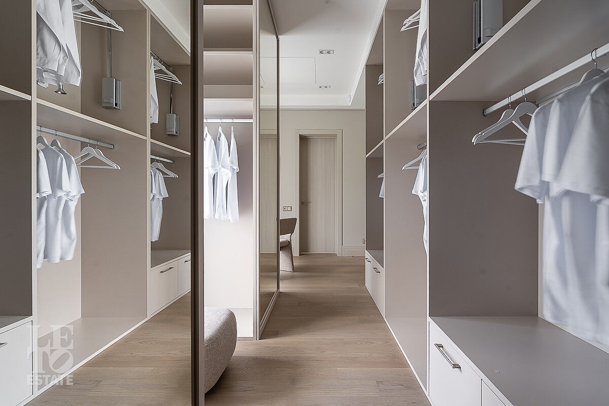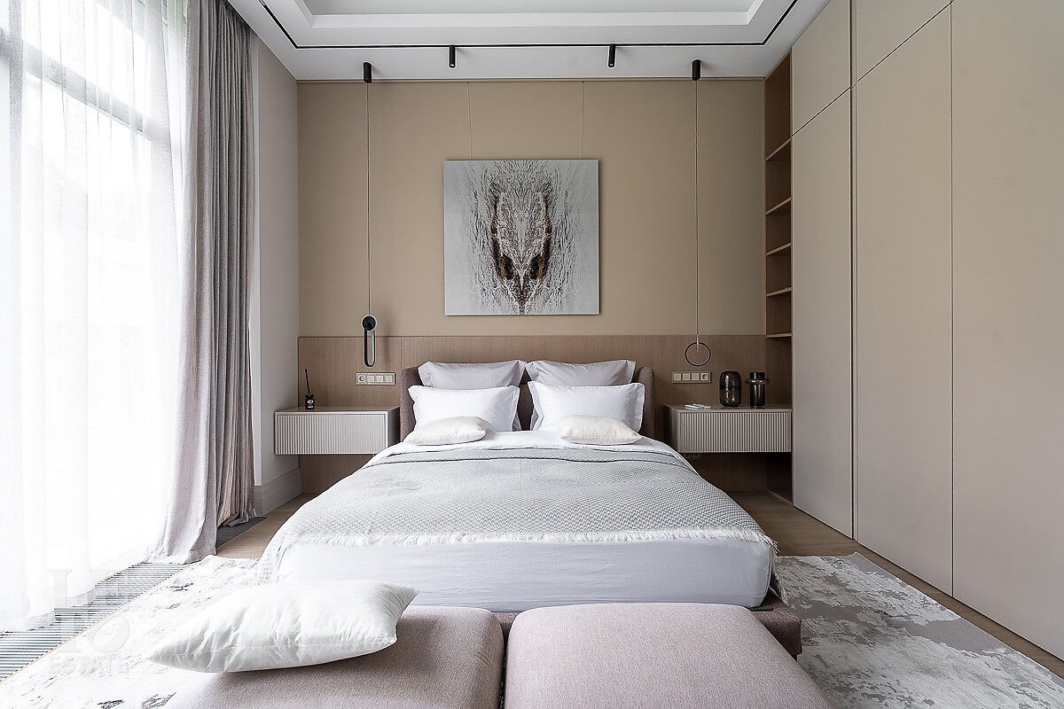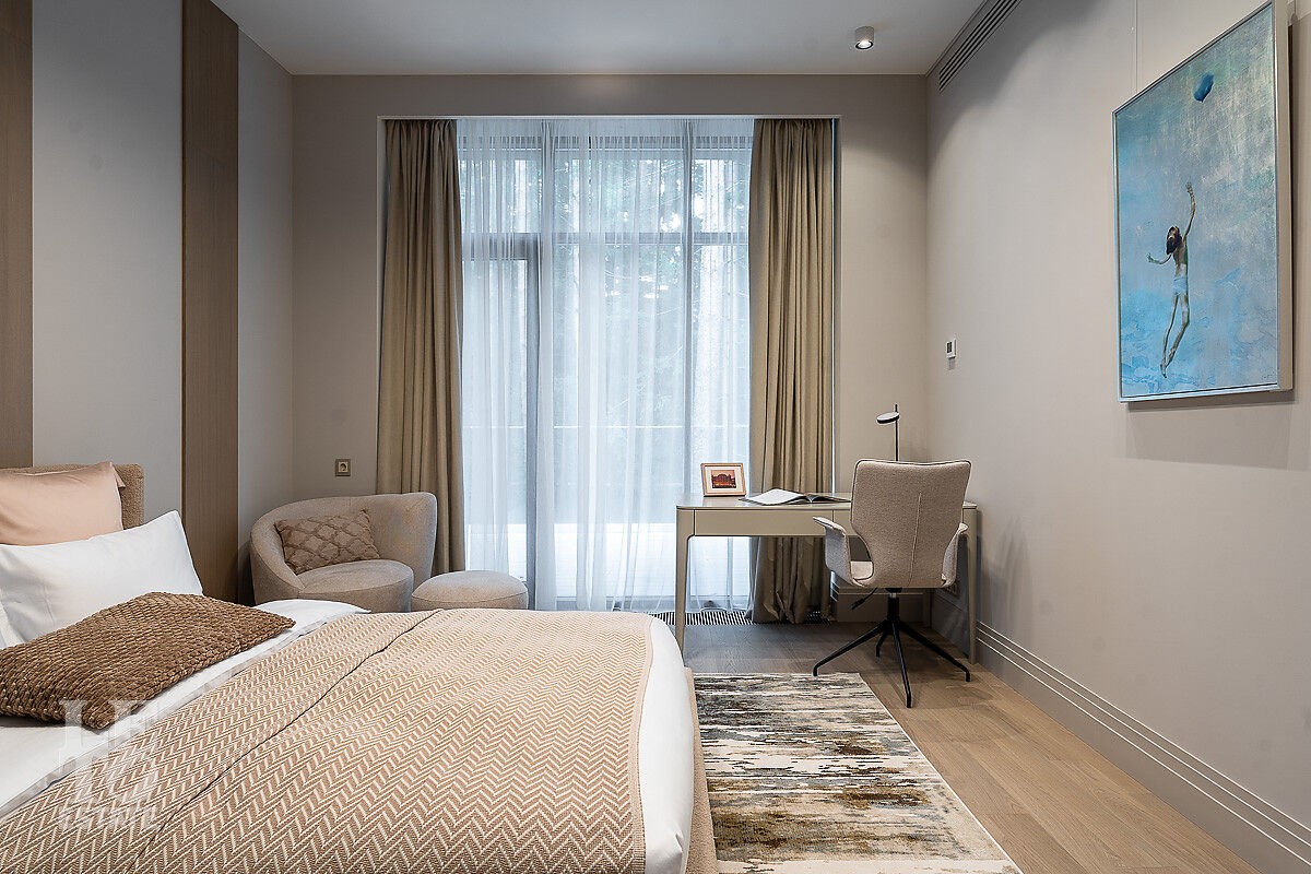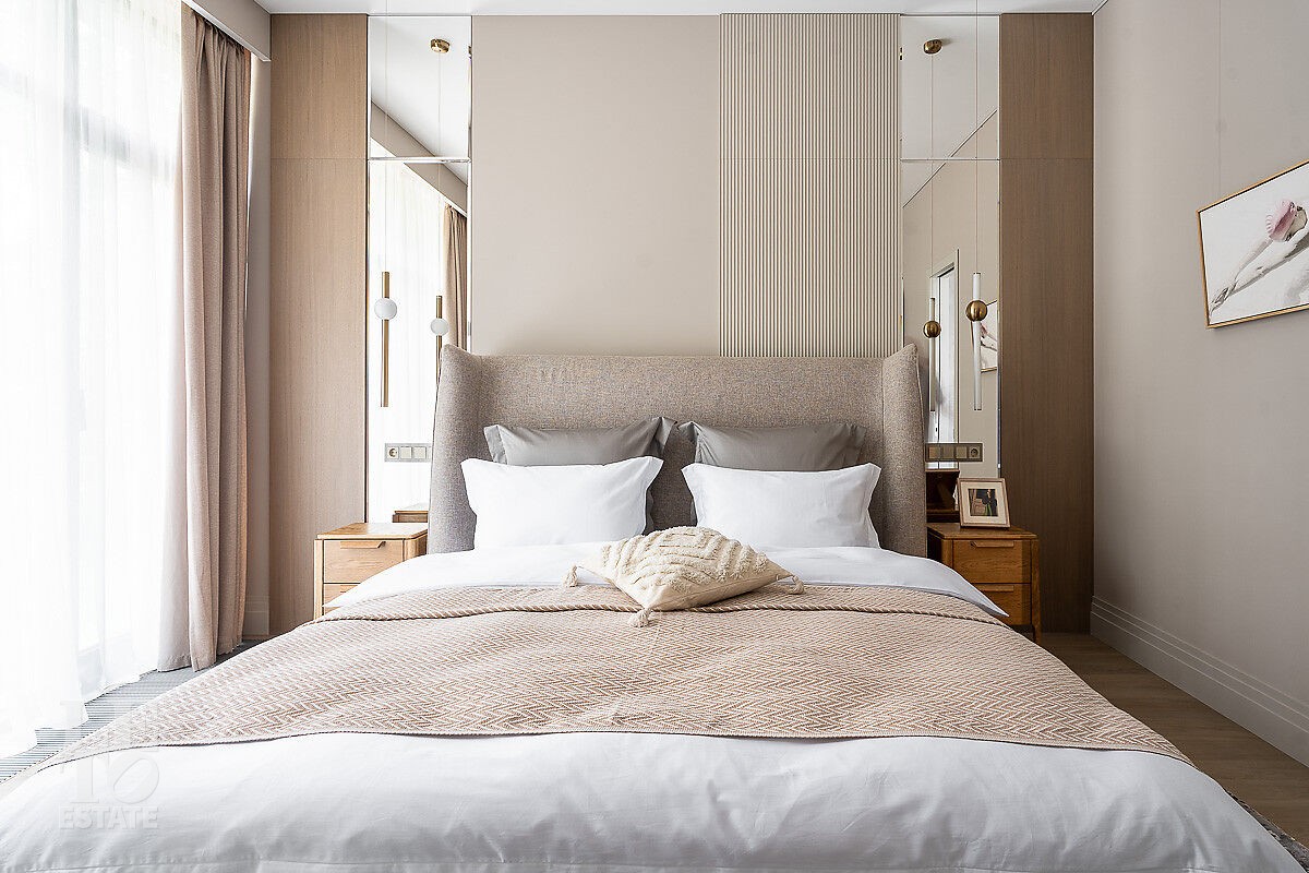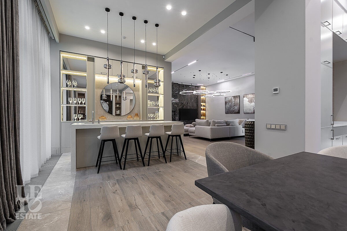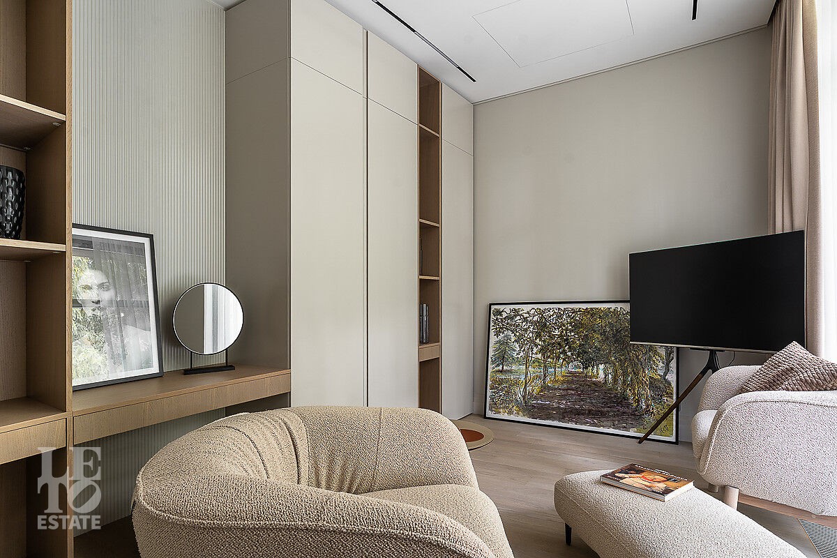 На 1-ом этаже размещены: гостиная с дровяным камином, столовая зона с баром и выходом на террасу, функциональная кухня с островом, а также гостевая спальня и постирочная. На 2-ом этаже размещены 3 мастер-блока спален со своими санузлами и гардеробными. Каждая спальня имеет свой выход на террасу или балкон.