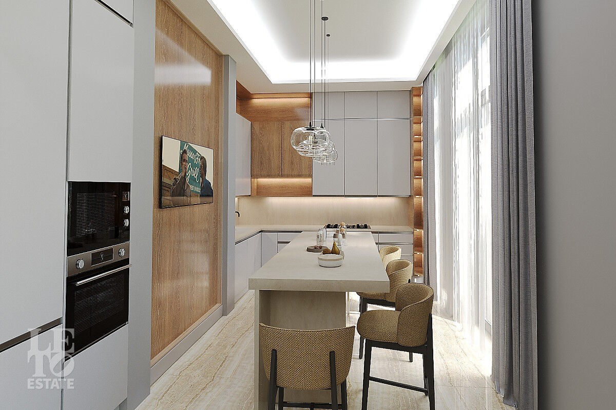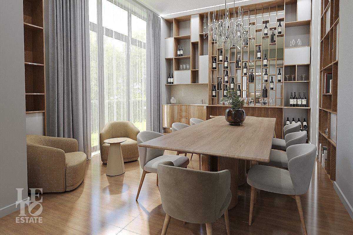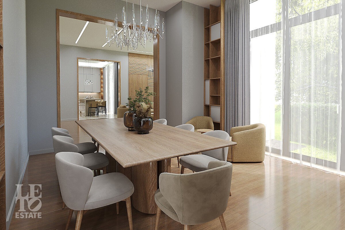 Органическая архитектура коттеджа позволила комфортно и эргономично зонировать личные и общественные пространства, раскрывая неповторимые виды на вековой лес сквозь панорамное остекление. В доме предусмотрен выход на эксплуатируемую кровлю. Высота потолков 3.5 метра,