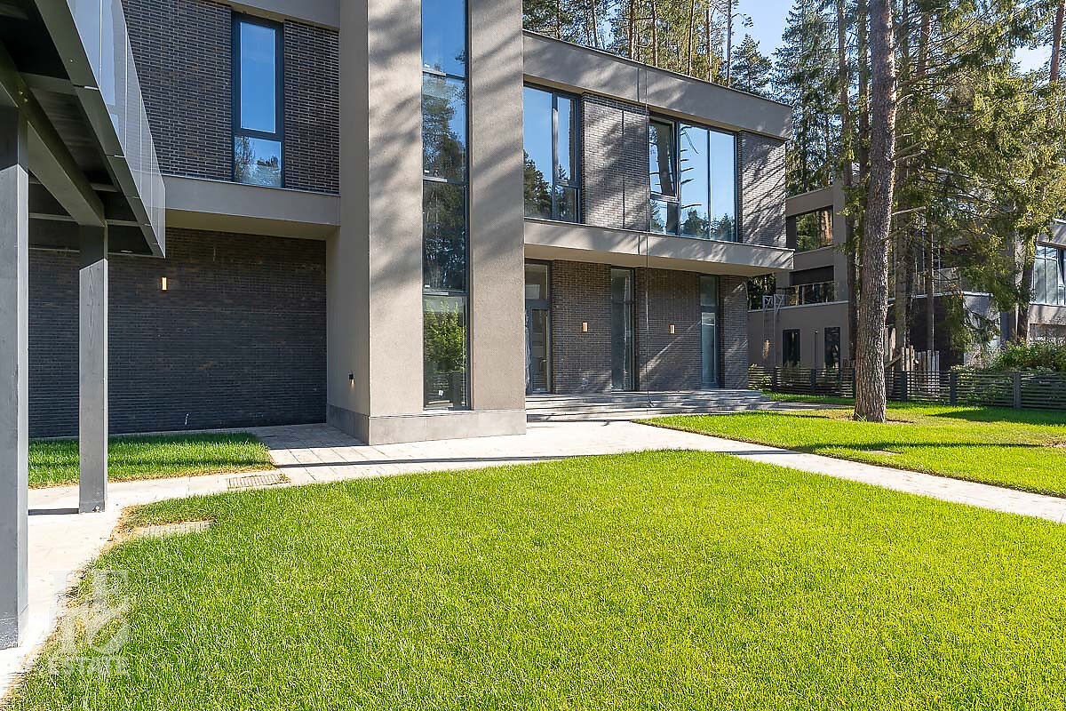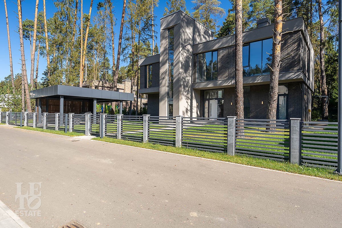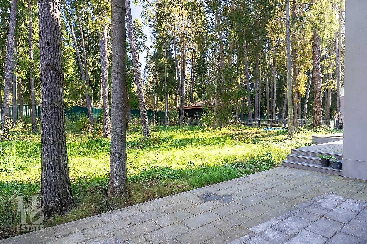 На участке выполнен ландшафтный дизайн, засеян газон, дорожки вымощены брусчаткой, а на заднем дворе благоустроен естественный лесной ландшафт. При въезде дополнительно предусмотрен навес для 2-х автомобилей.