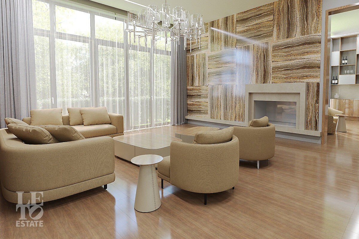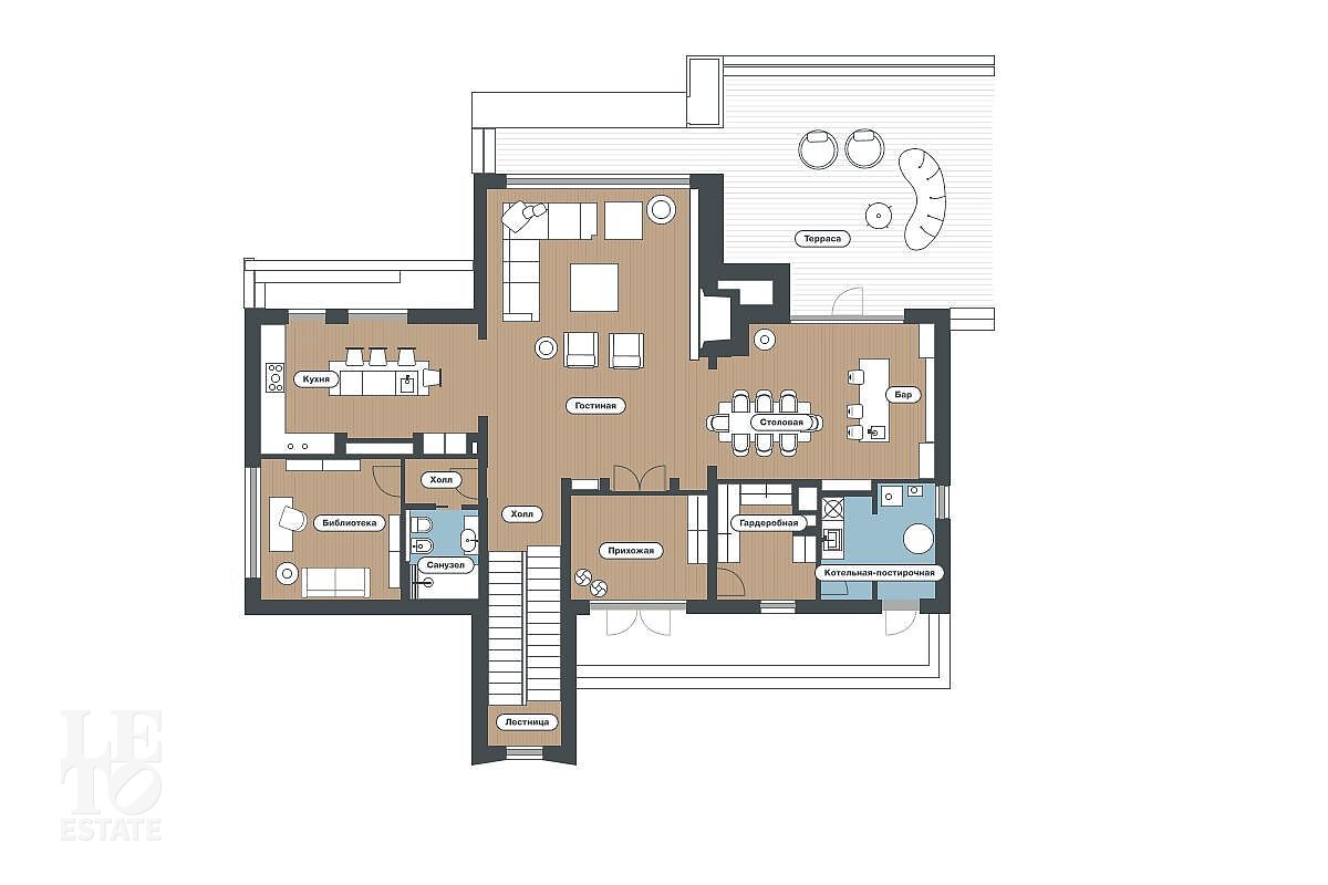 Первый этаж: прихожая, гардеробная, санузел, холл, кухня, столовая с выходом на террасу, бар, гостиная с камином, кабинет.