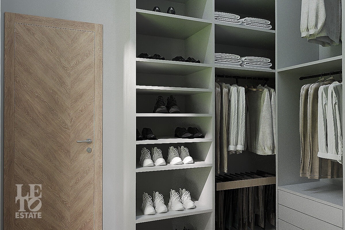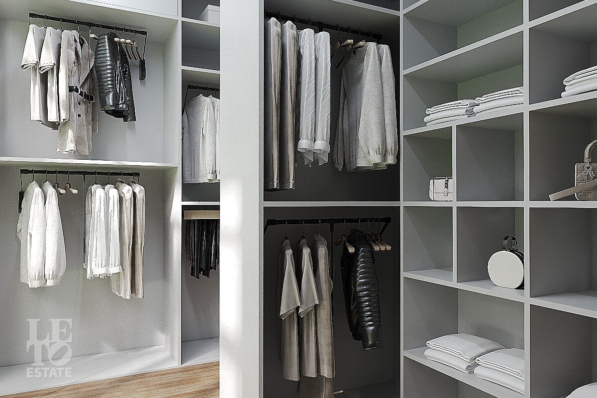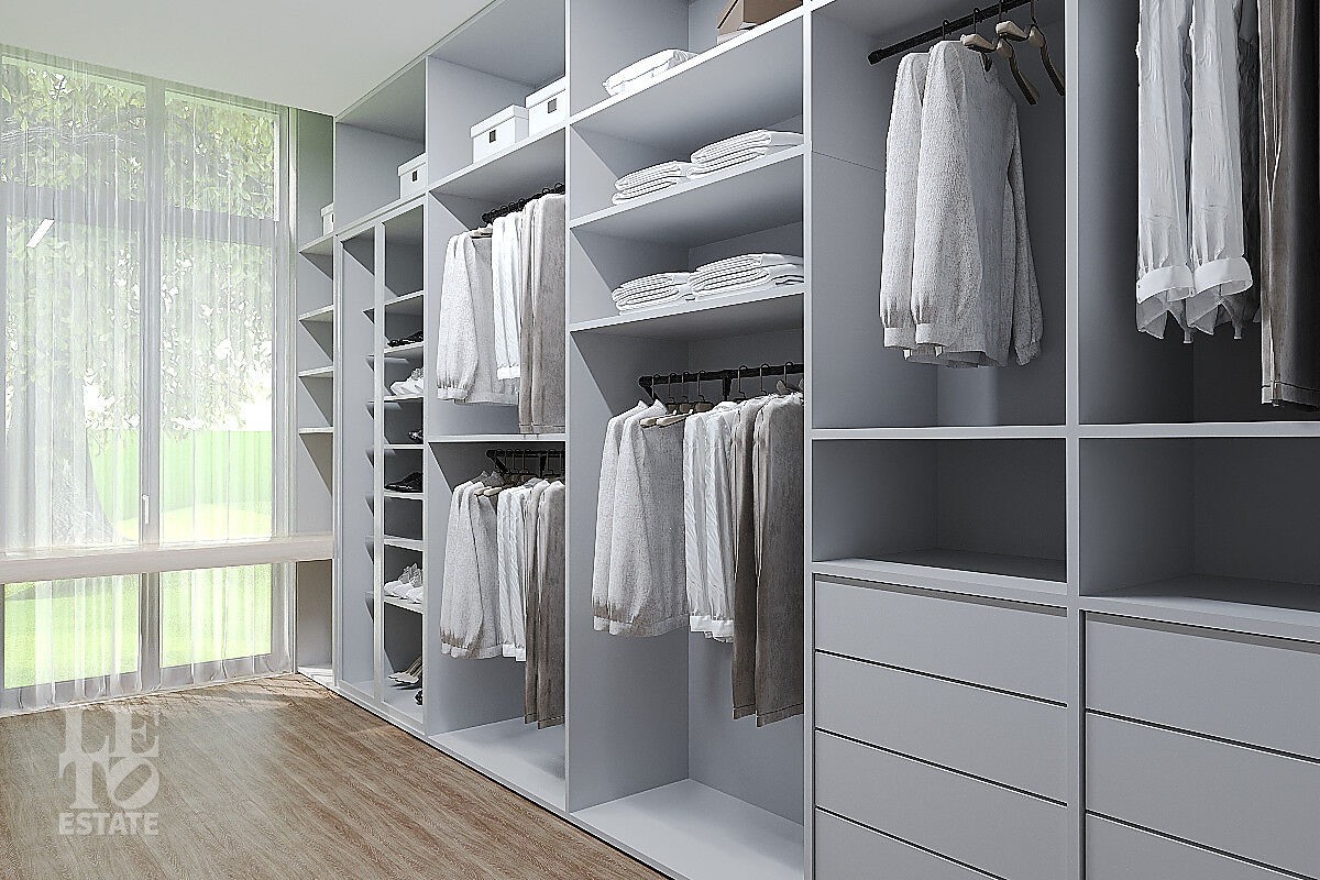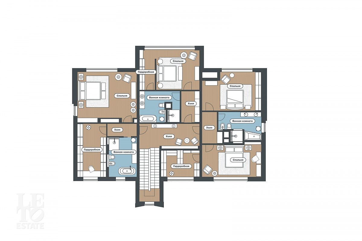 Второй этаж: холл, мастер - спальня с санузлом и гардеробной, две спальни с гардеробными и санузлами, спальня.