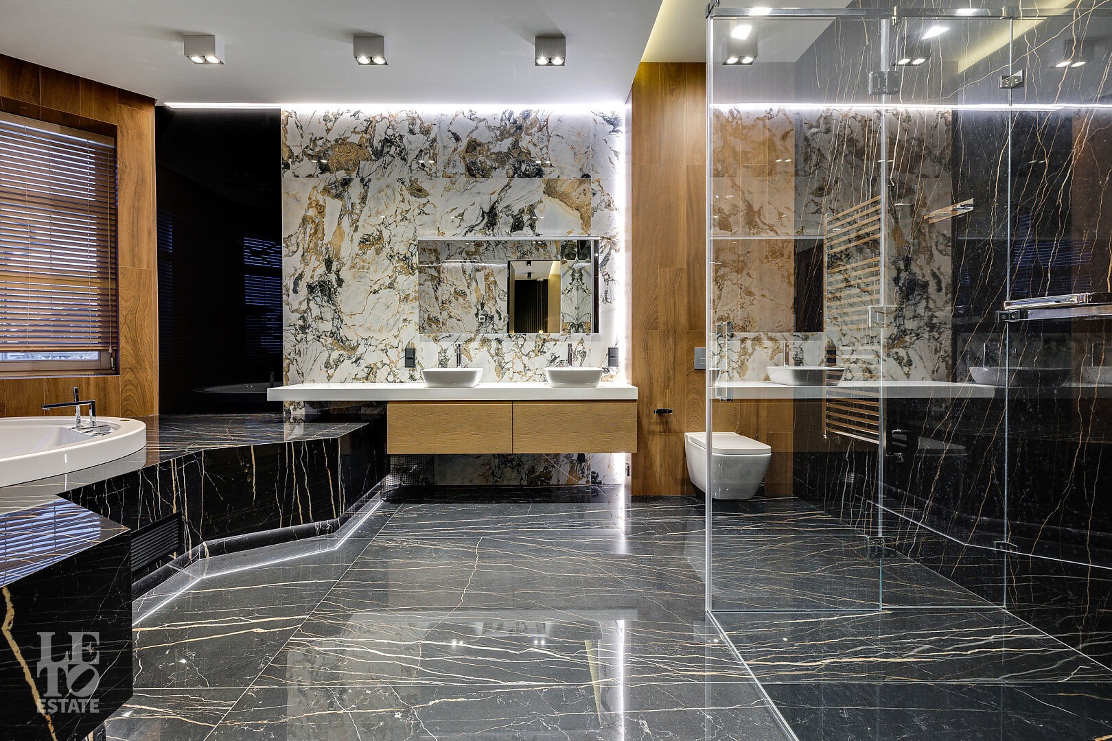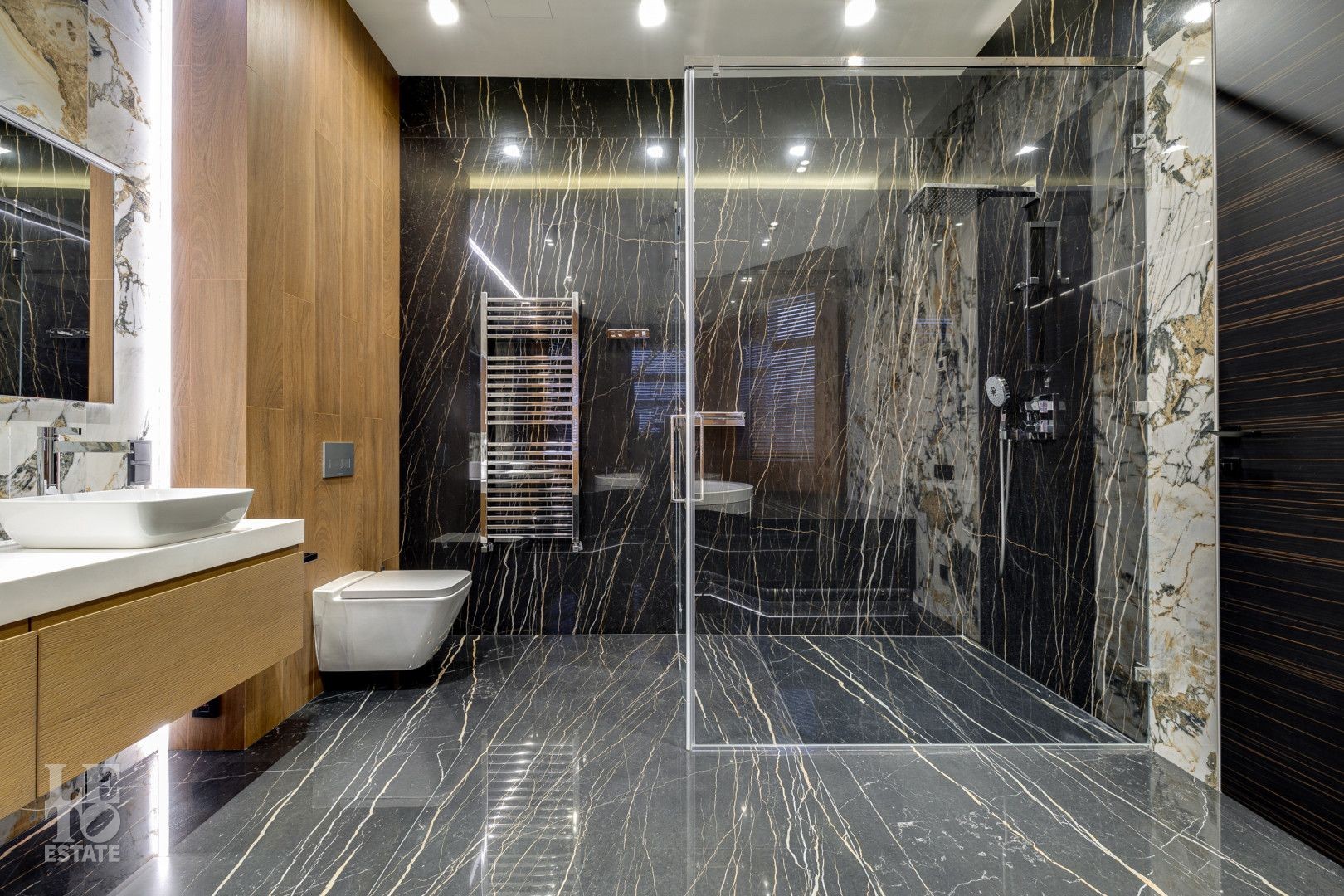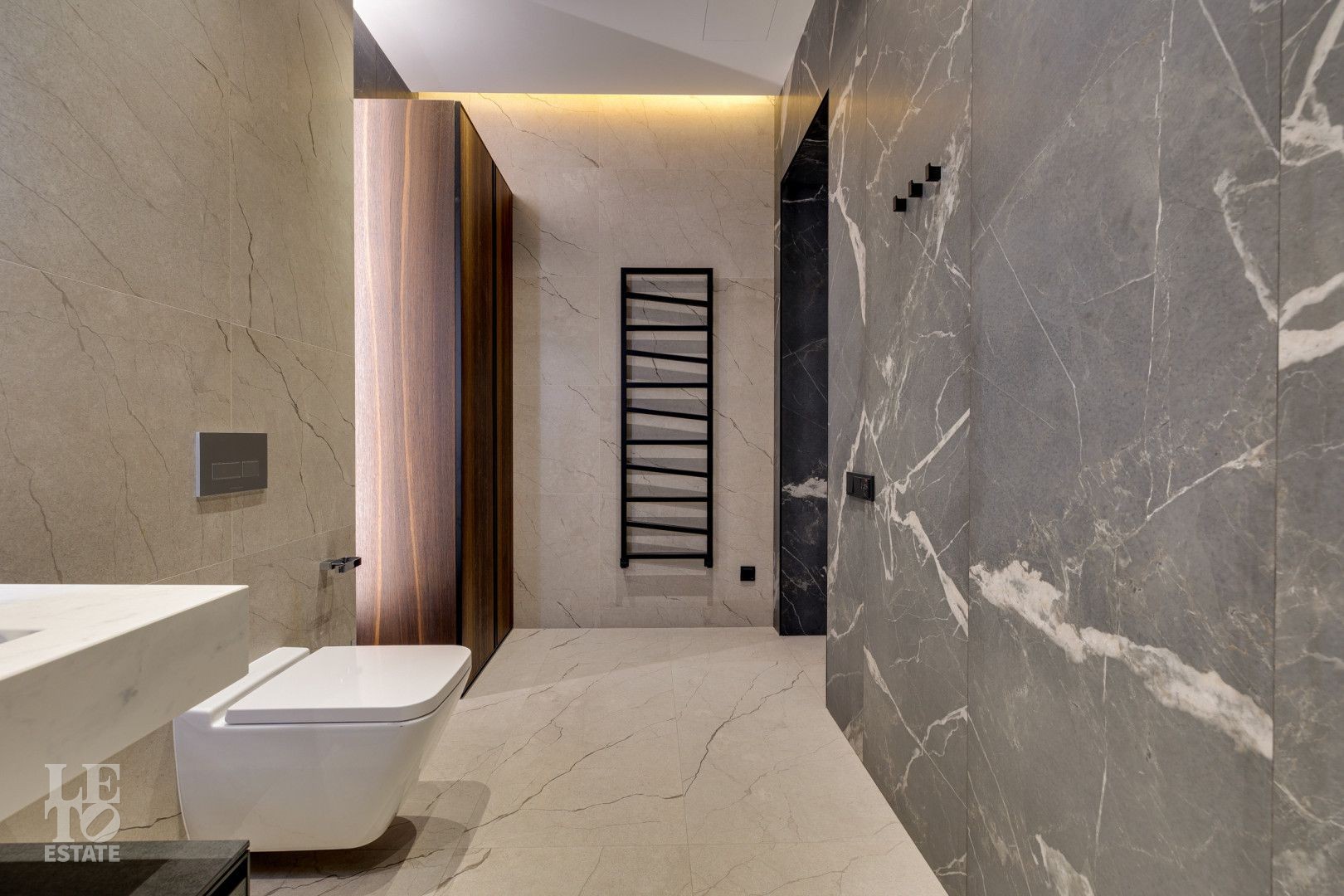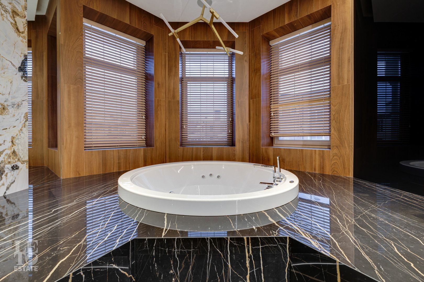 Второй этаж: мастер-спальня с санузлом, душевой и джакузи, гостевая спальня, детская спальня, гардеробная, санузел с ванной и душевой кабиной, санузел с душевой кабиной.