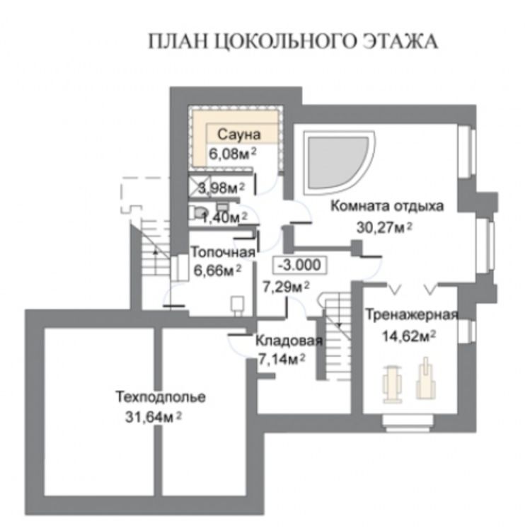 Цокольный этаж: кладовая, техподполье, топочная, сауна, комната отдыха, мастерская;
