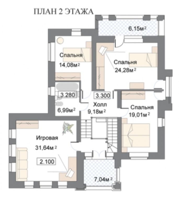 Второй этаж: спальня со «вторым светом», санузел, 2 спальни, спальня с балконом.