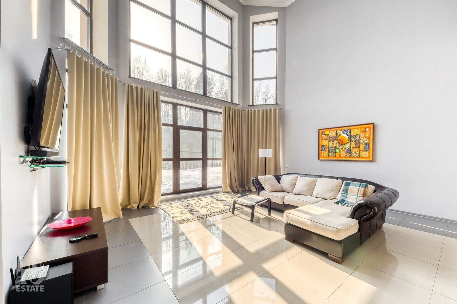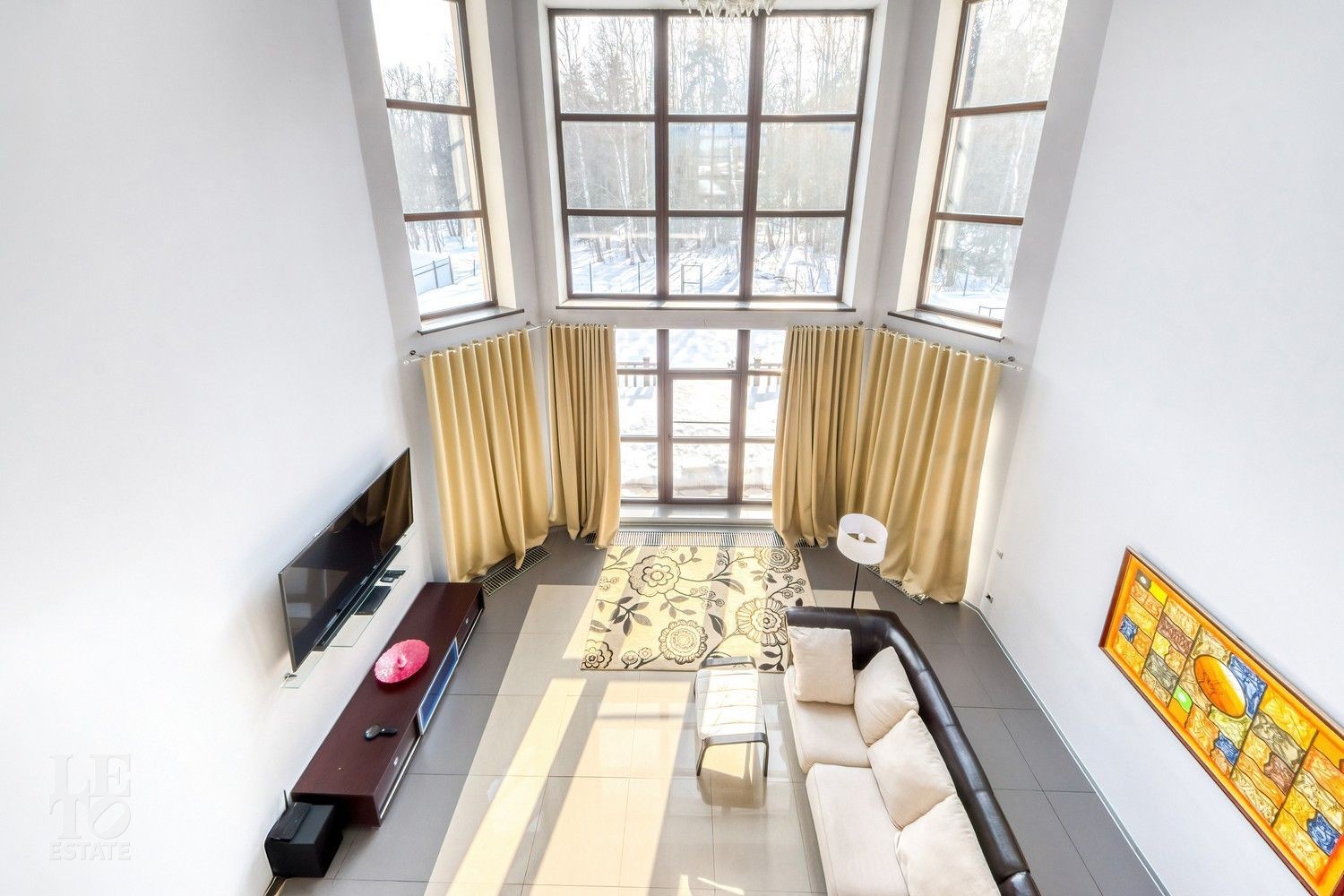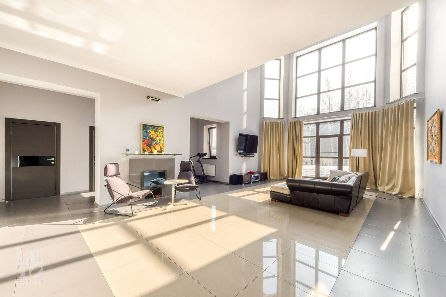 Простор и свет: Продуманная планировка включает 6 спален и 5 санузлов. Центр притяжения дома — гостиная со «вторым светом»: высота потолка в максимальной точке достигает 7,5 метров, а панорамное окно в пол открывает живописный вид на лес;